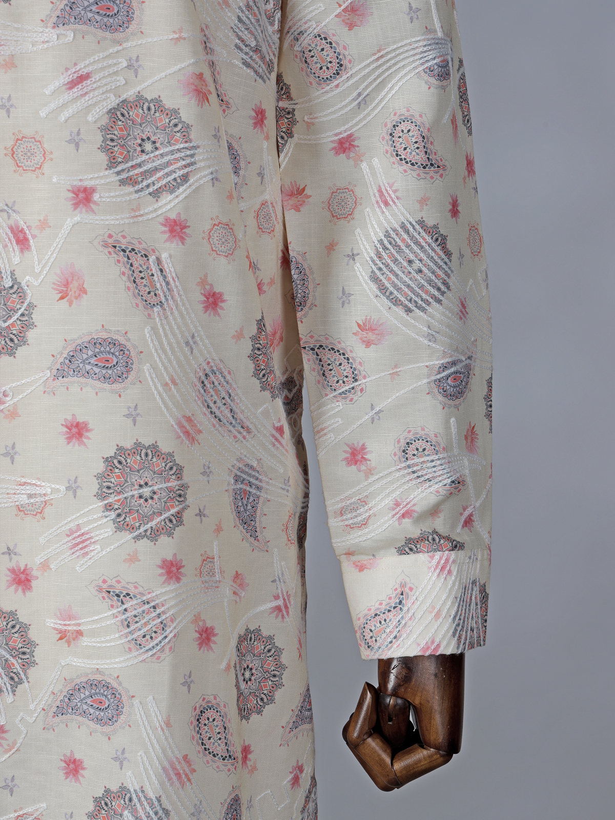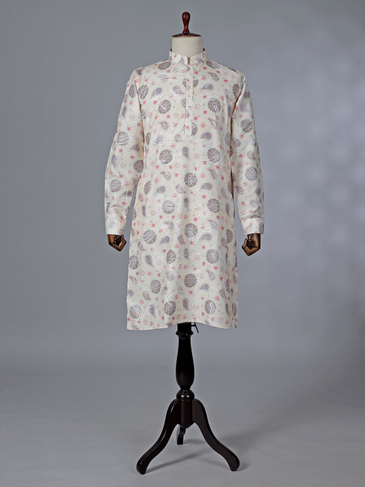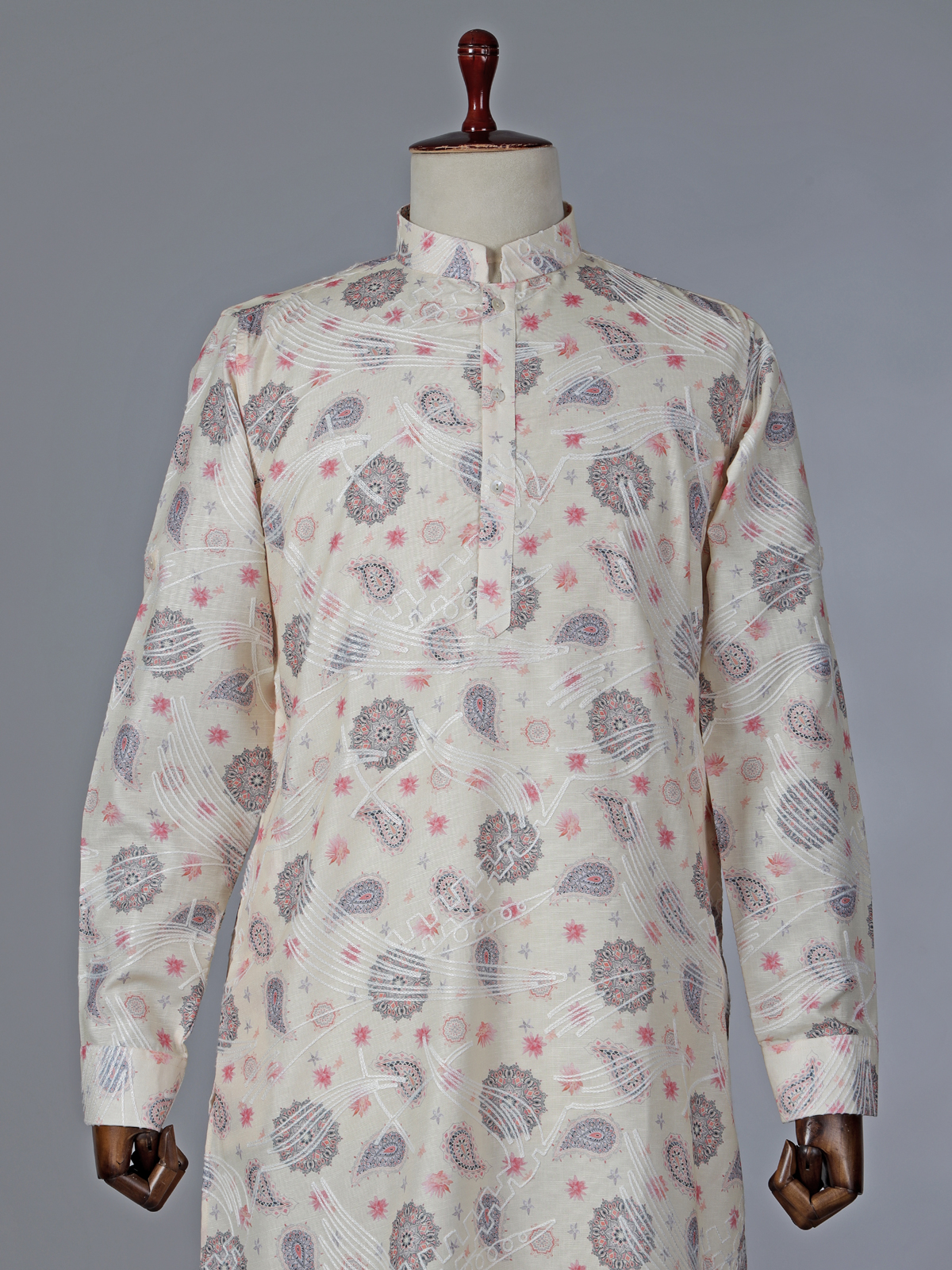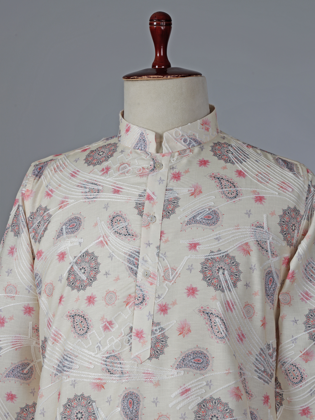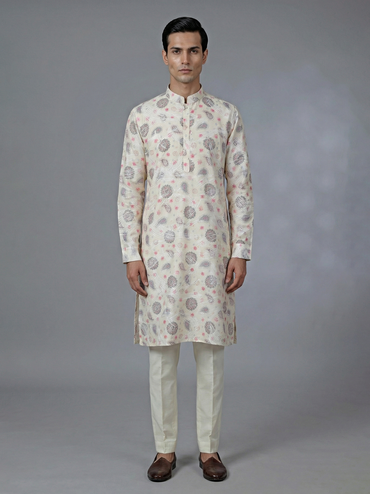 Subtle and sophisticated, this cream cotton kurta suit features a combination of thread work and printed accents. The kurta is styled with a chinese collar with half button placket and decent full sleeves for a clean silhouette, paired with pant for coordinated elegance. Crafted in breathable cotton, it is ideal for festival and Eid celebrations, offering understated tradition with modern finesse.