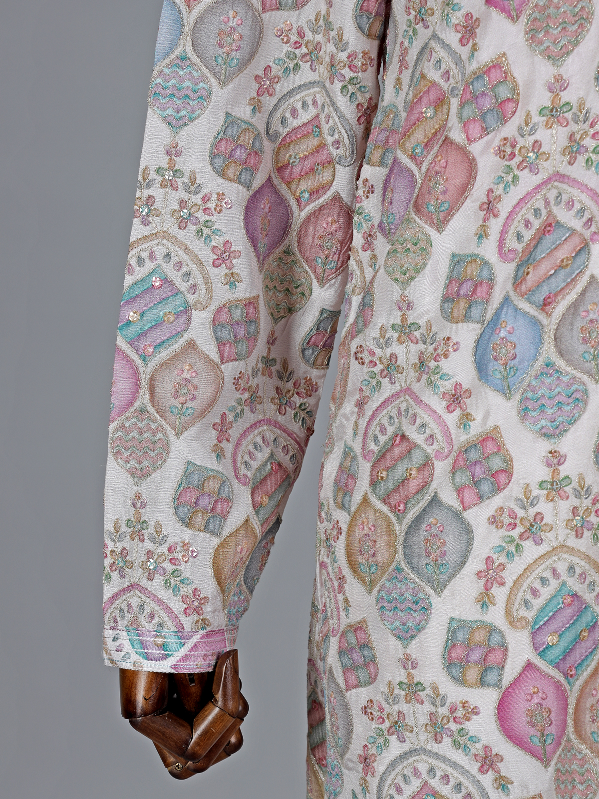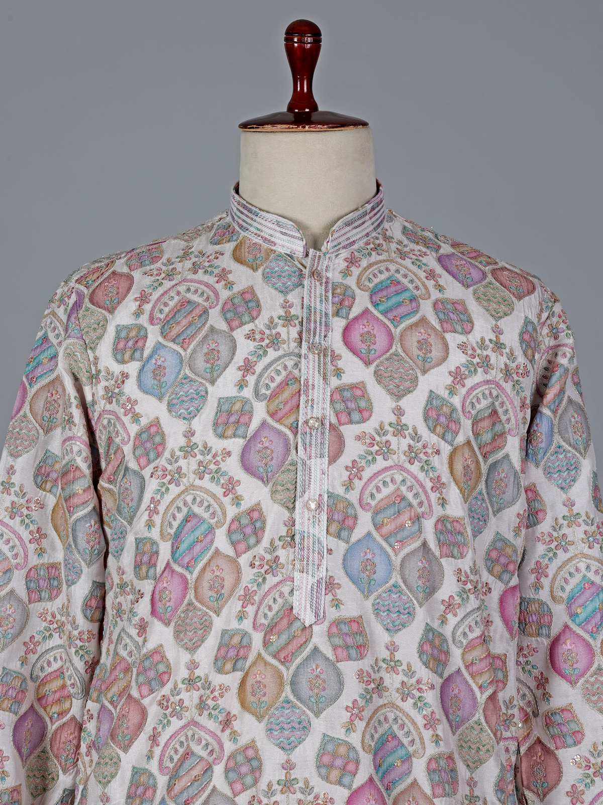 This cream cotton silk kurta suit features elegant printed patterns enhanced with delicate resham work. Designed with a mandarin collar and full sleeves, the kurta is paired with matching pants, offering a graceful and comfortable ensemble for festive celebrations and cultural gatherings.