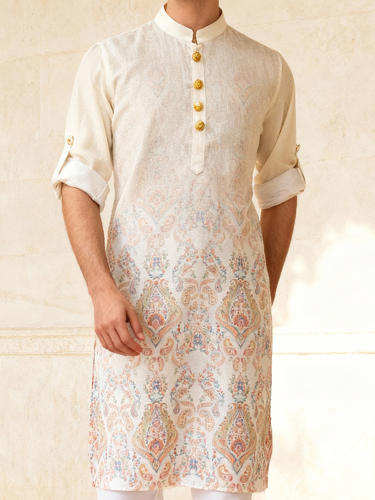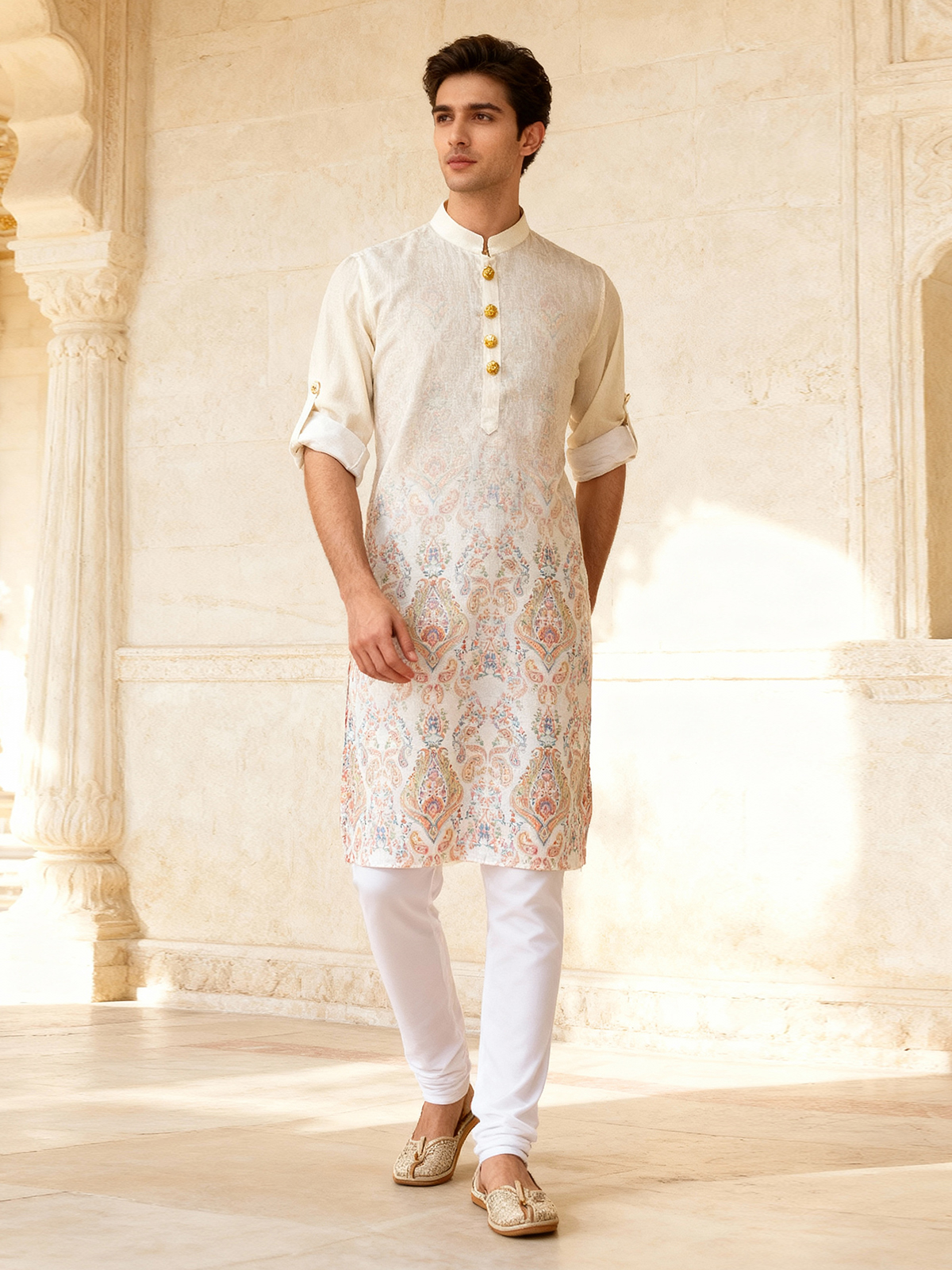 Designed in elegant cream cotton silk, this kurta showcases refined printed detailing for a timeless festive appearance. Styled with a chinese collar and full sleeves, it offers effortless ethnic sophistication. Paired with a coordinated white pyjama, it is an ideal choice for wedding and sangeet occasions.