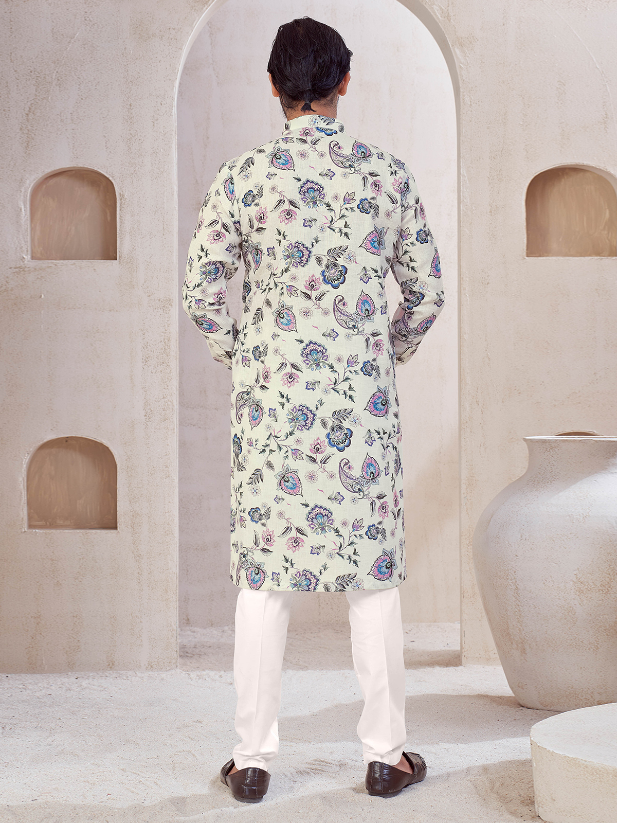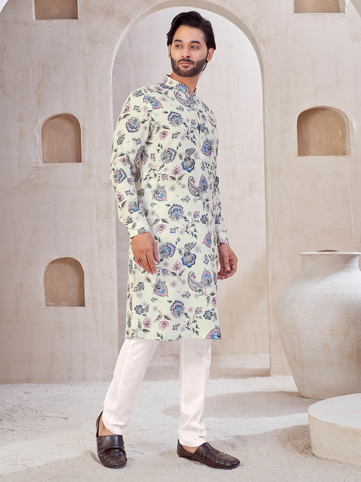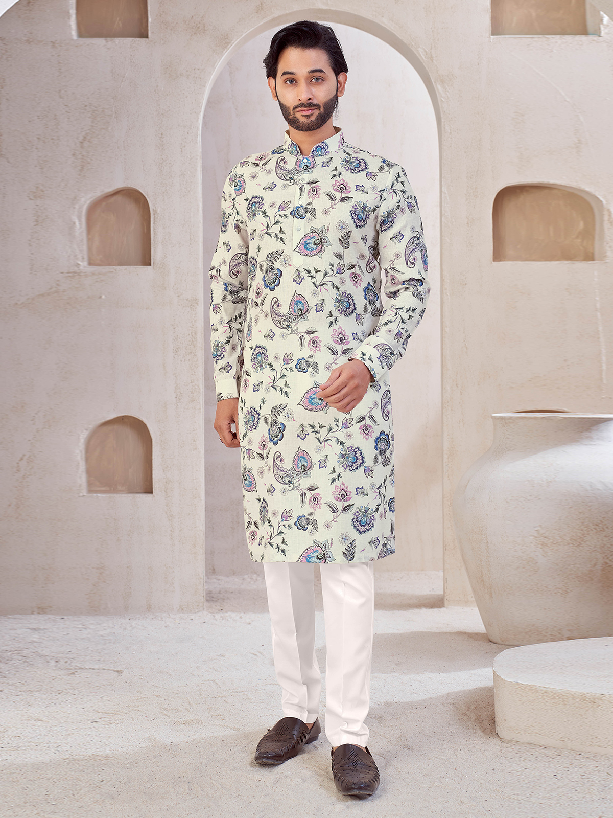 When you want something simple yet celebratory, this cream printed kurta set is the perfect pick. Its breathable cotton fabric ensures all-day comfort, while the classic silhouette with full sleeves and mandarin collar brings a traditional flair. Comes with bottom.