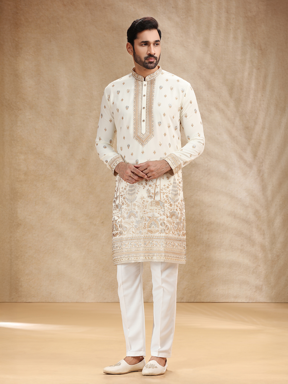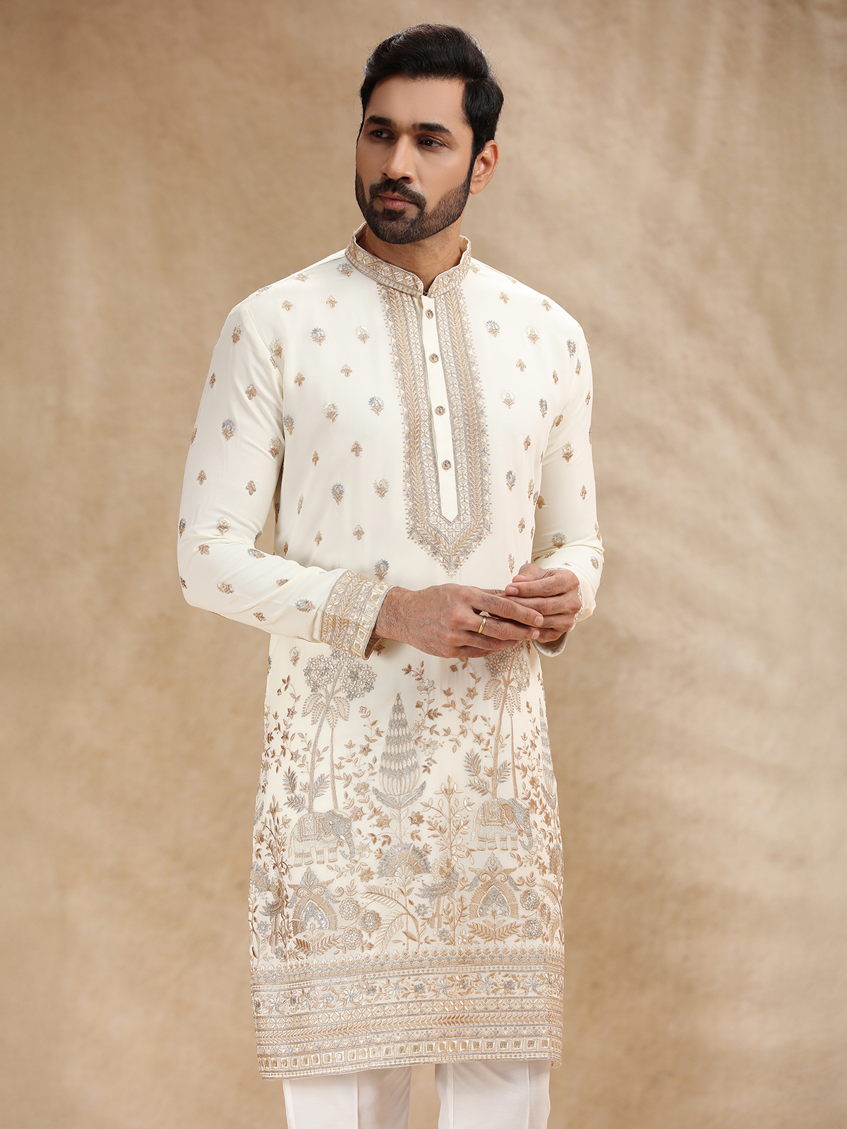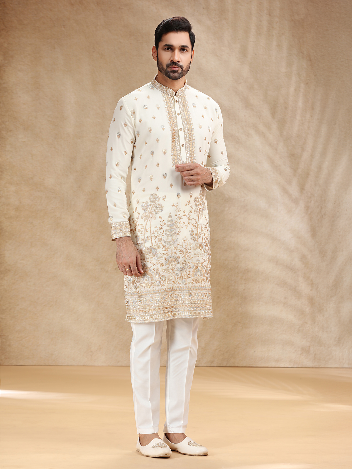 Cream Georgette Kurta Pajama With Intricate Embroidery