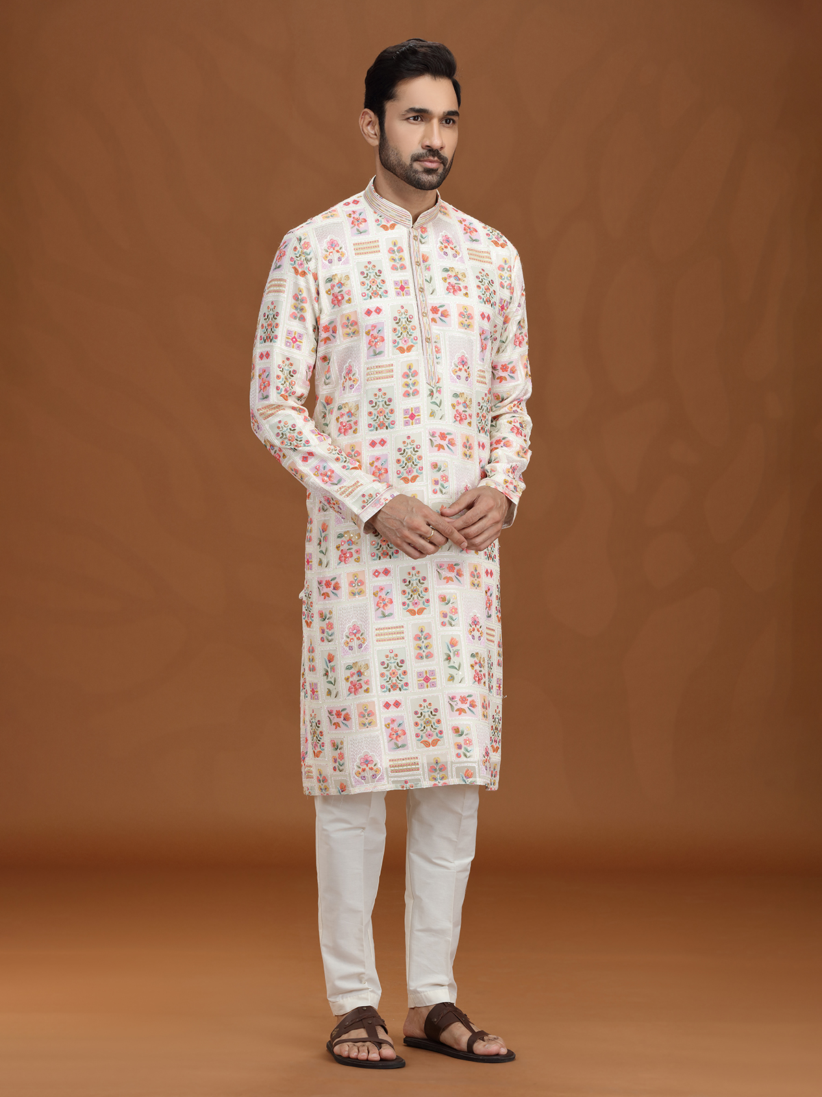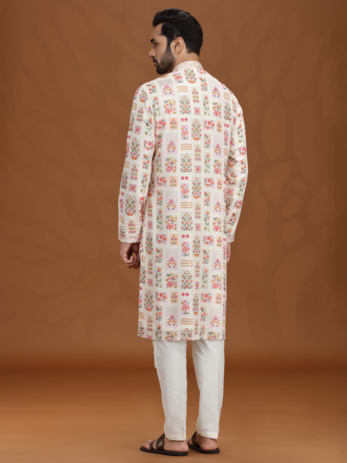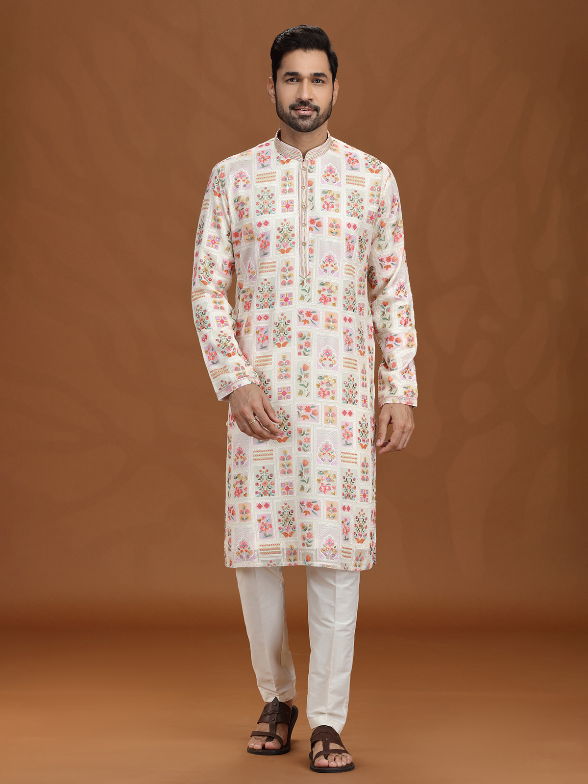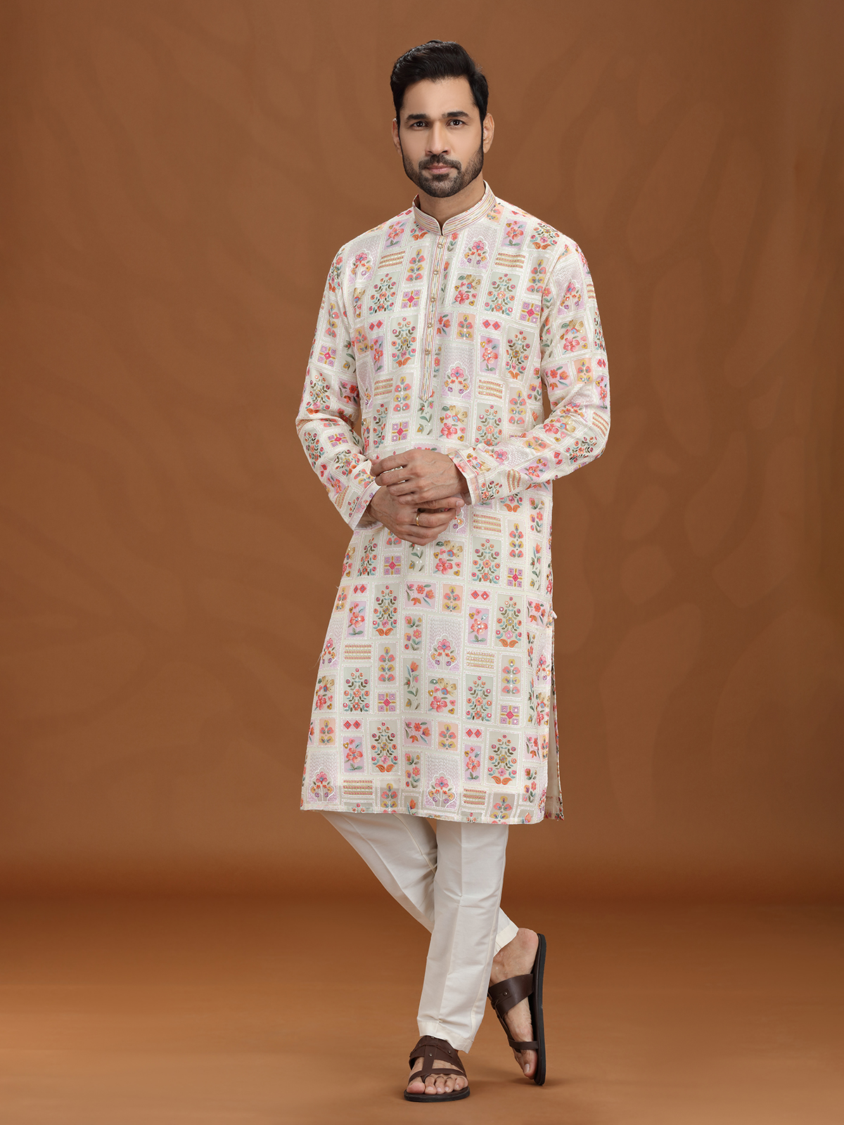 Crafted in cream georgette, this kurta suit displays floral embroidery and sequins across colorful motifs. The elegant stand collar with pant adds finesse, making it suitable for festive and wedding occasions. A graceful ensemble that reflects artistry with modern styling.