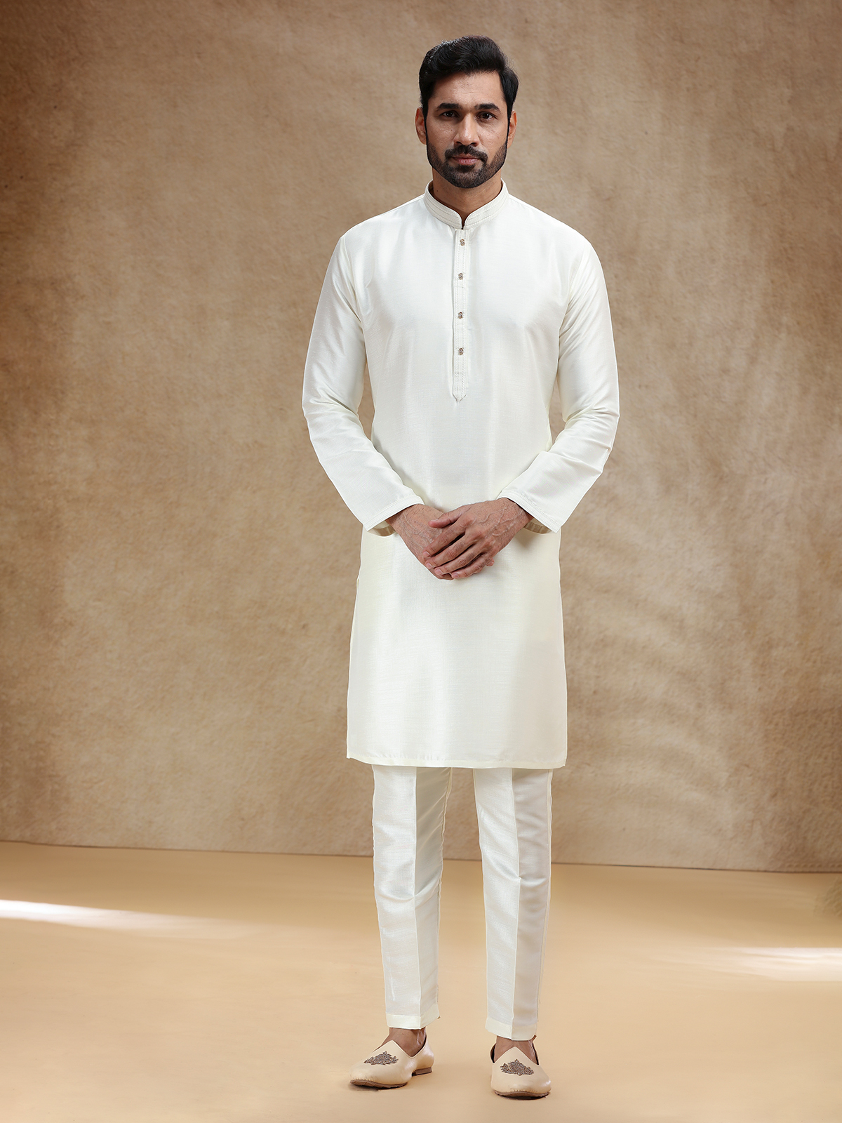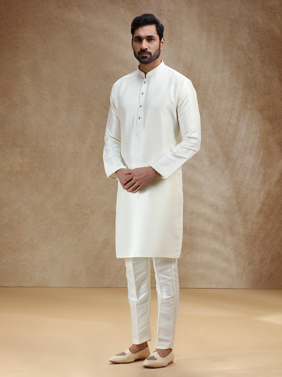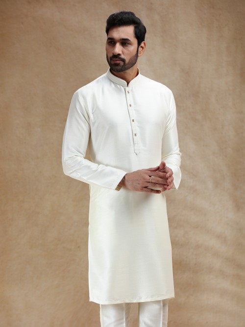 This cream cotton silk kurta exudes purity and refinement, styled with a stand collar and full sleeves. Perfect for pooja and festivals, it radiates classic elegance. A plain matching pant bottom gracefully completes the set with a touch of serenity.