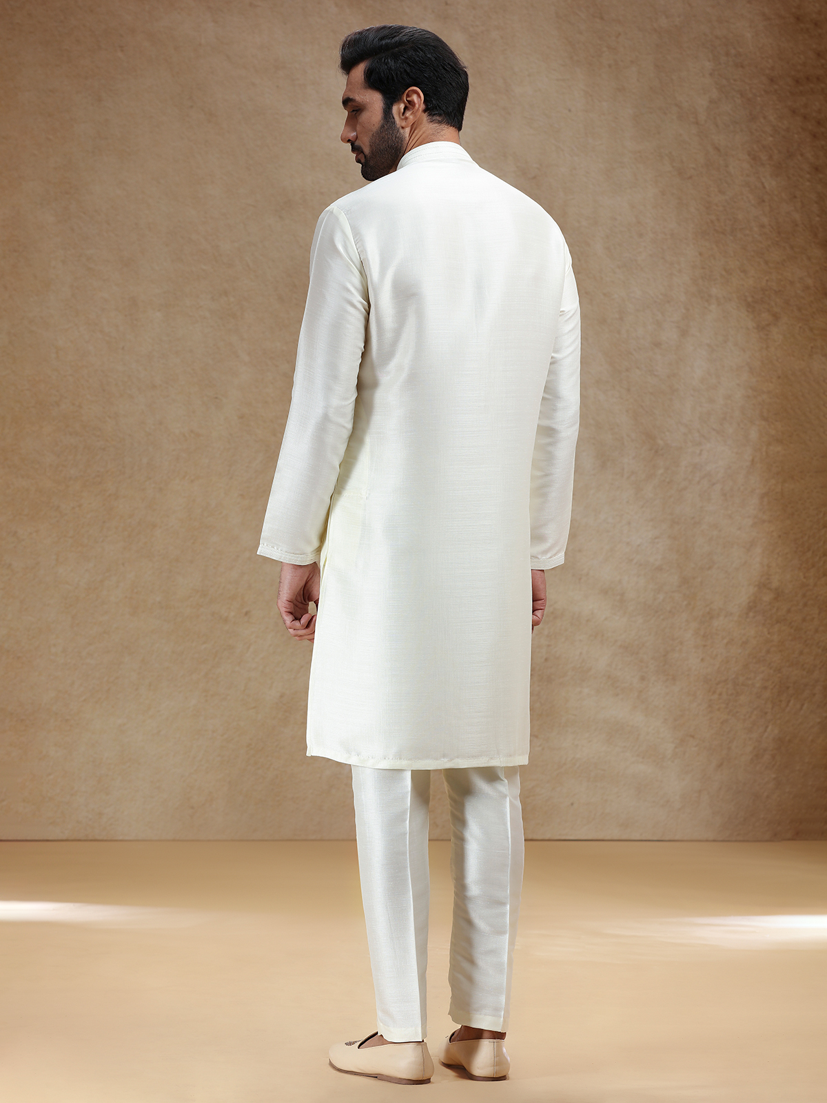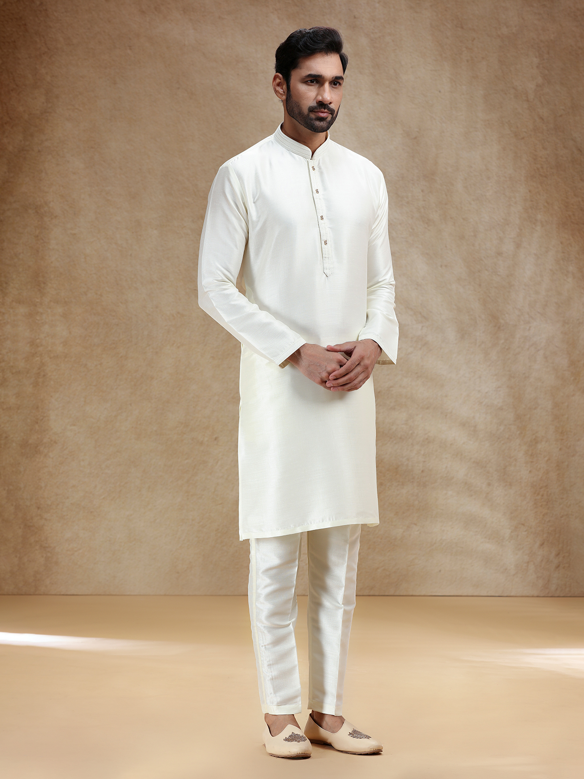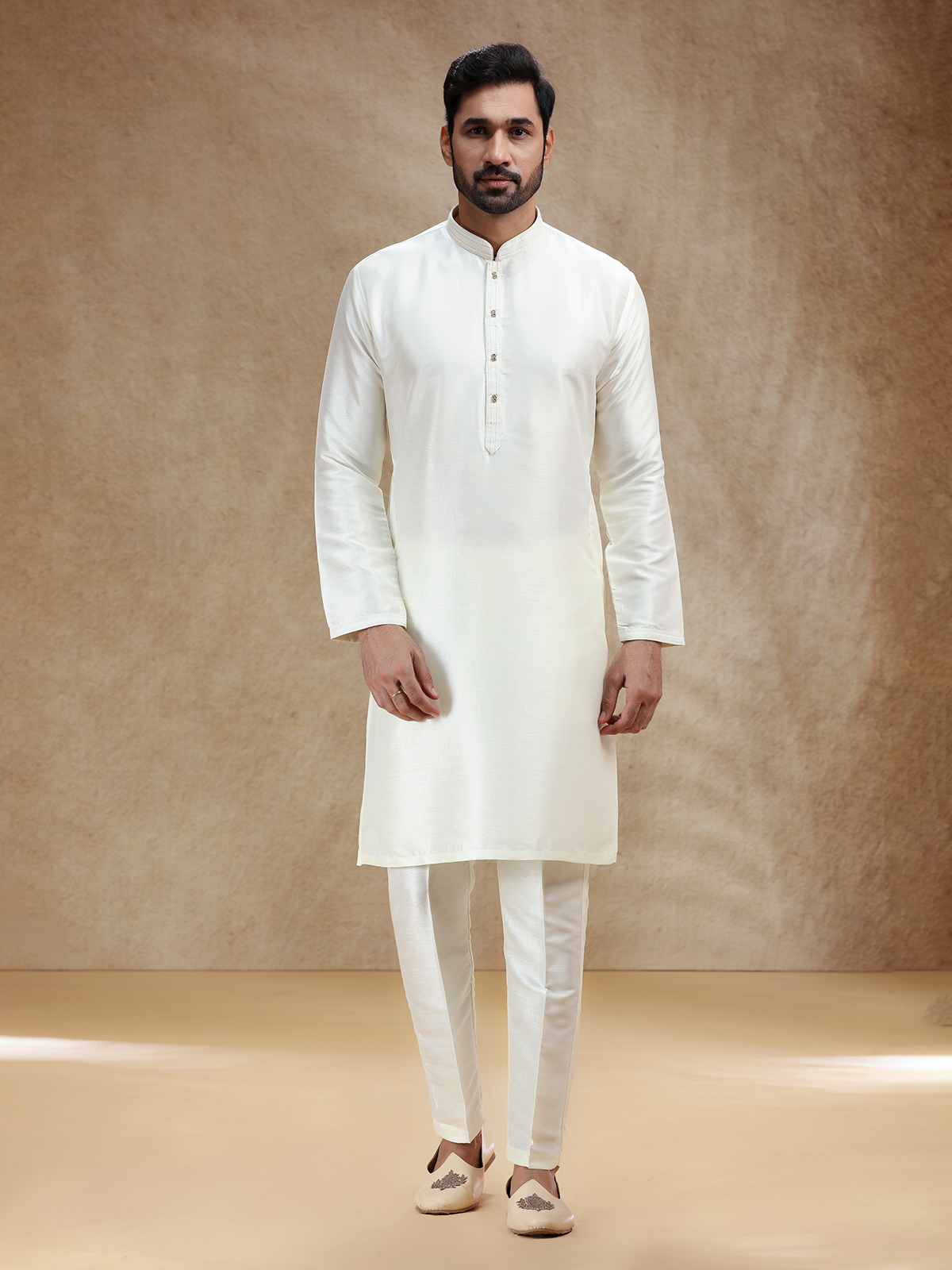 This cream cotton silk kurta exudes purity and refinement, styled with a stand collar and full sleeves. Perfect for pooja and festivals, it radiates classic elegance. A plain matching pant bottom gracefully completes the set with a touch of serenity.