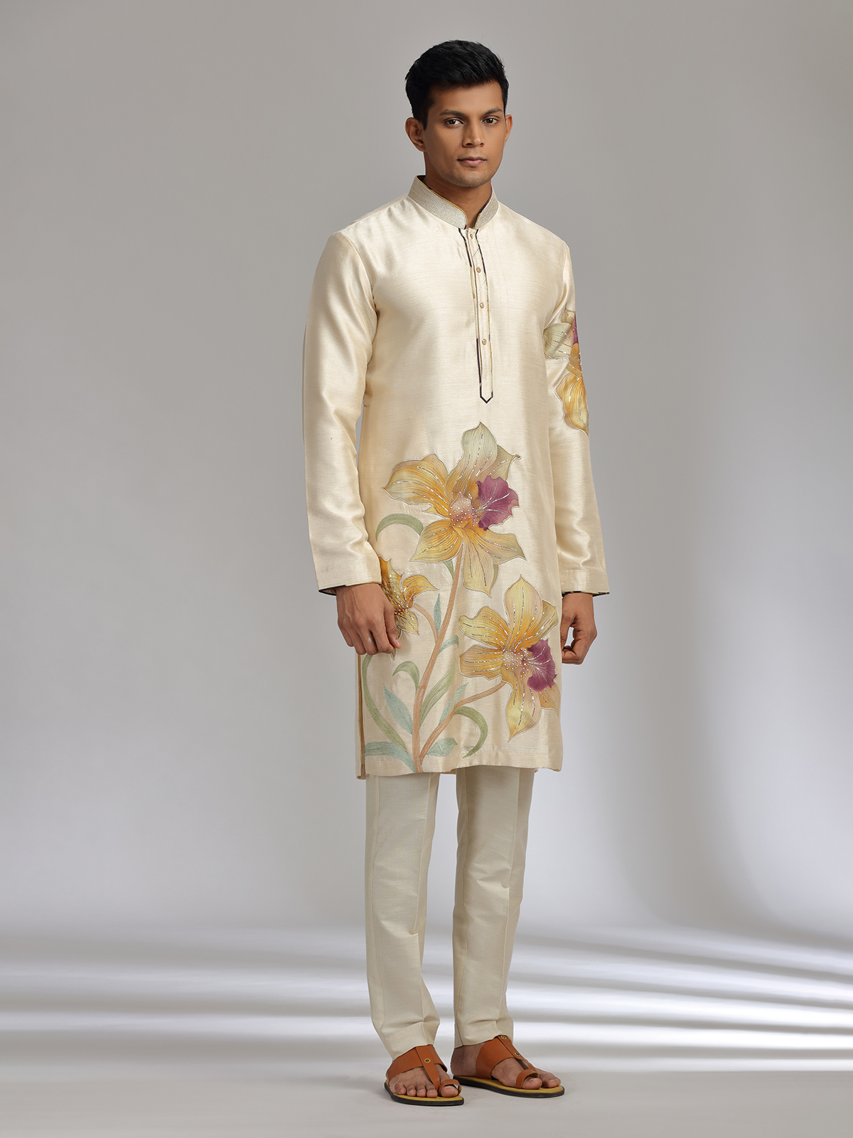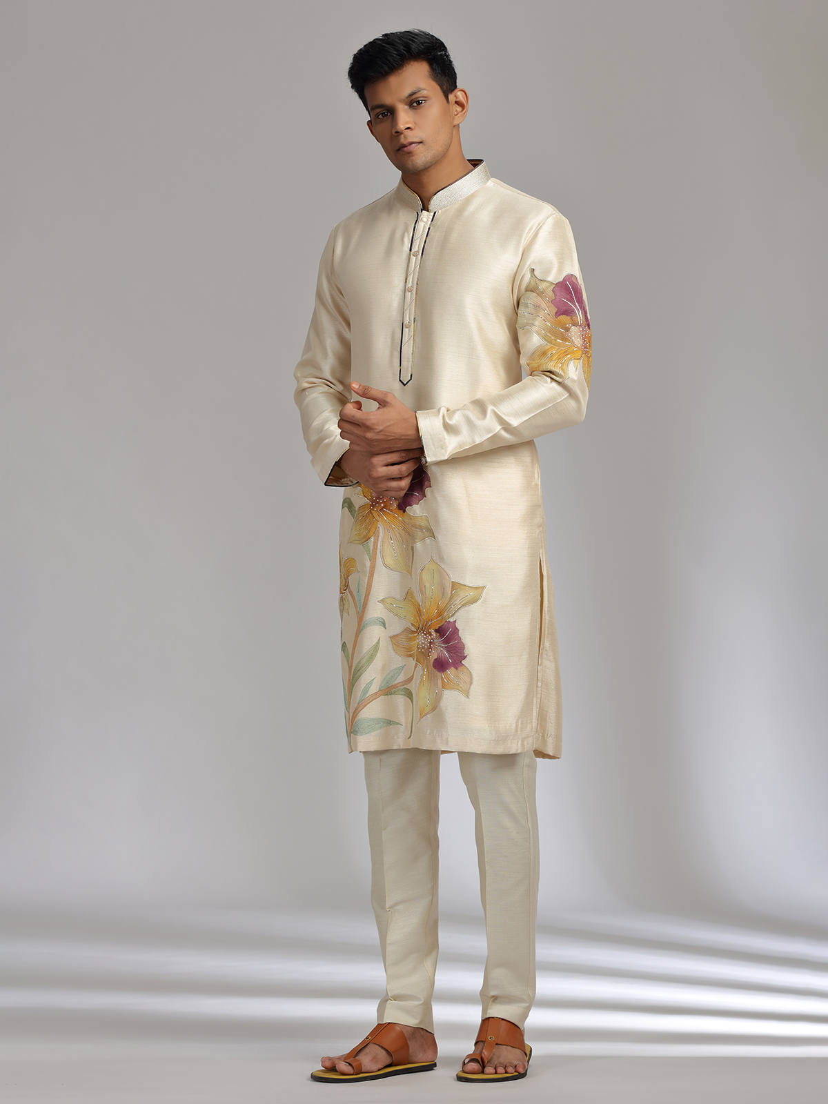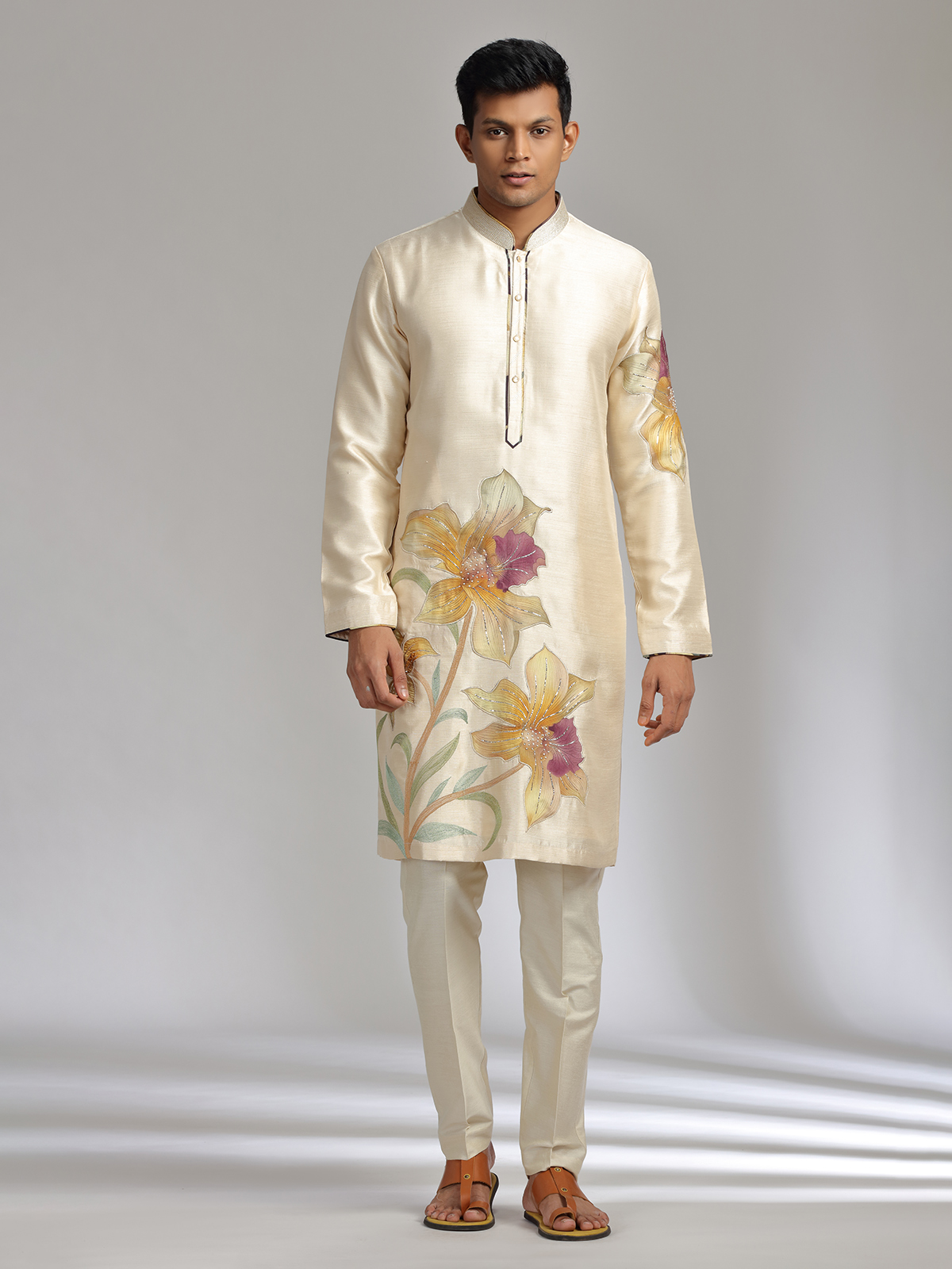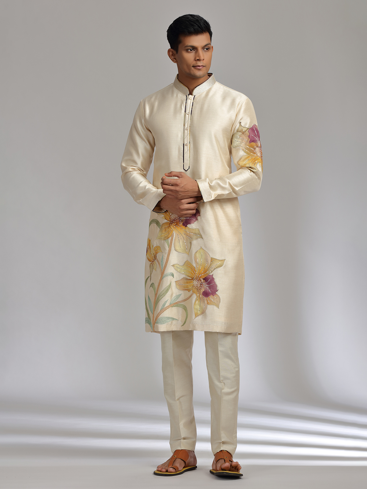 Cream Printed Tusser Silk Kurta Pajama With Sequins And Beads For Men
