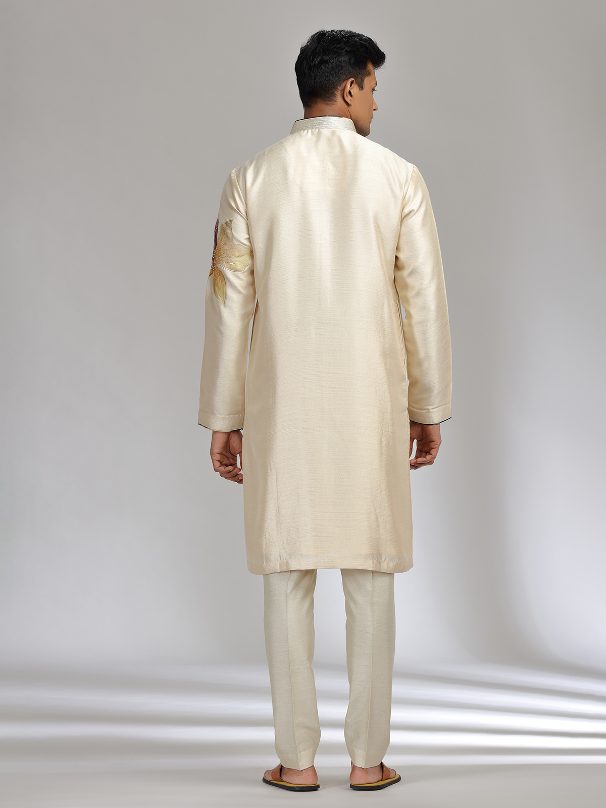 Cream tusser silk kurta suit embroidered with sequins and beads glows with luminous grace. Mandarin collar and full sleeves lend a poetic silhouette. Paired with pant, it offers a modern festive appeal.