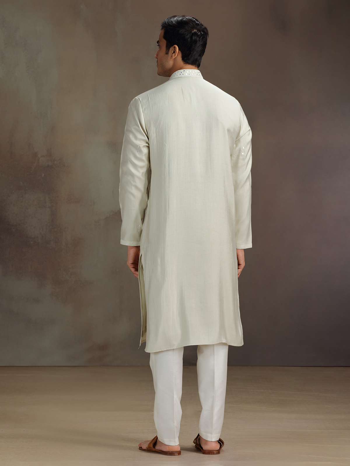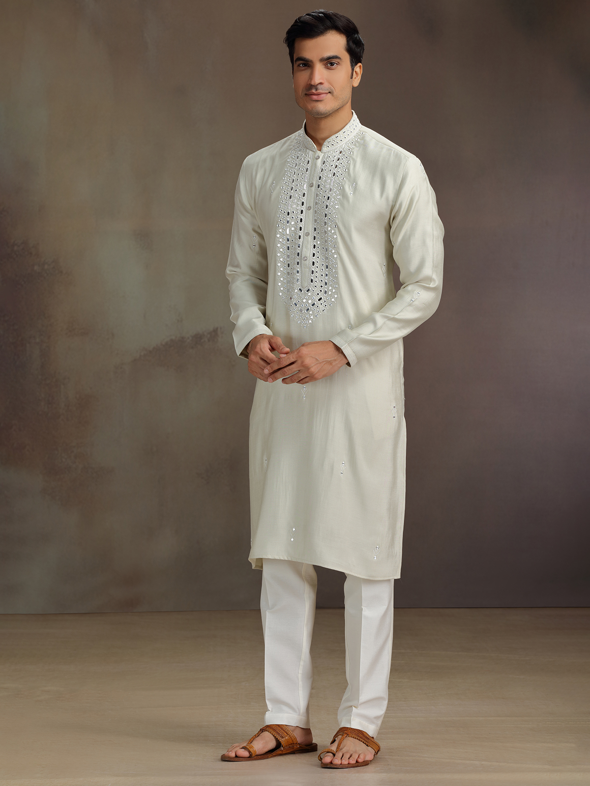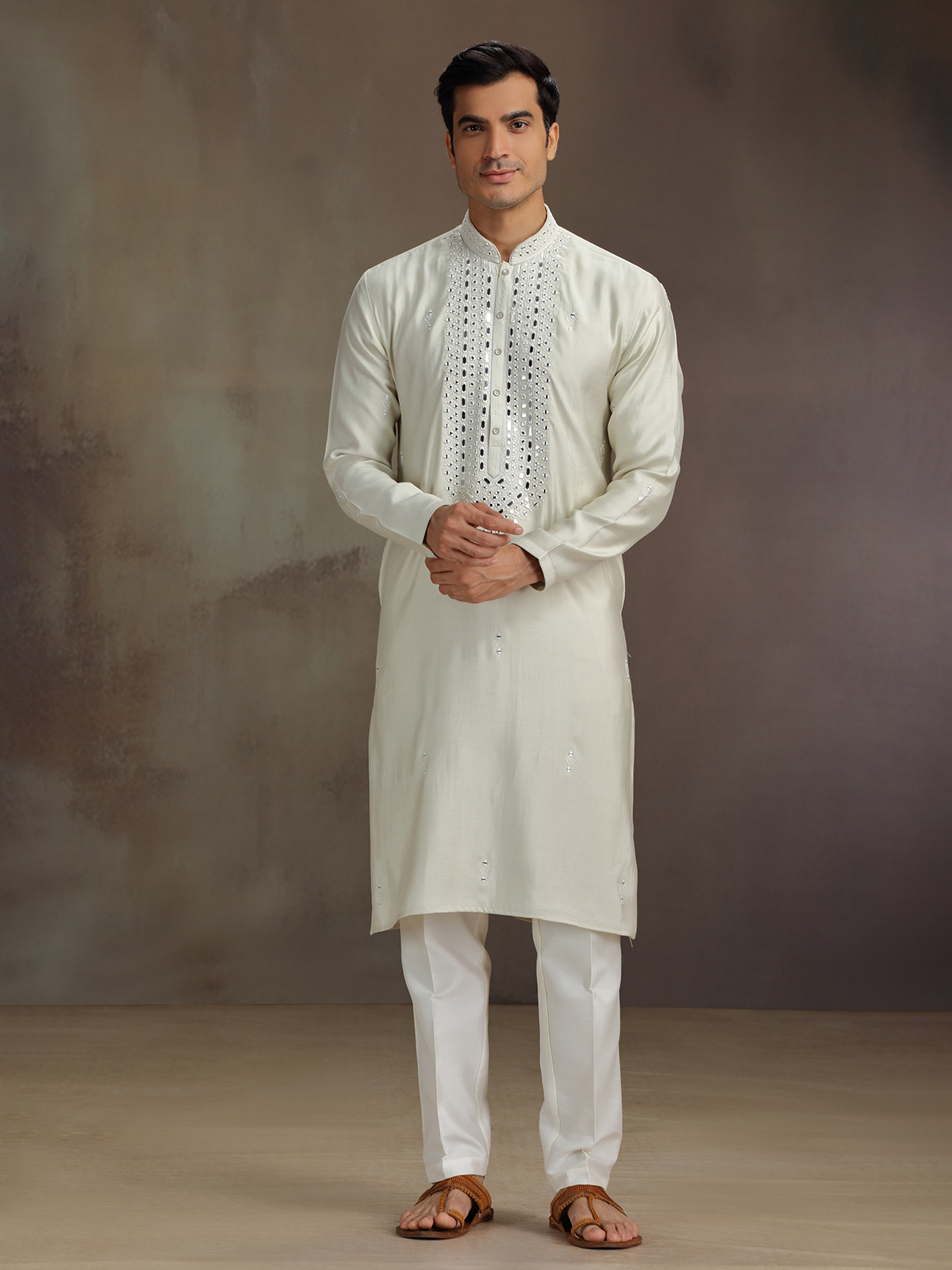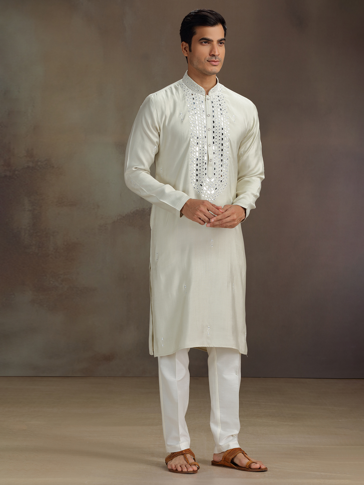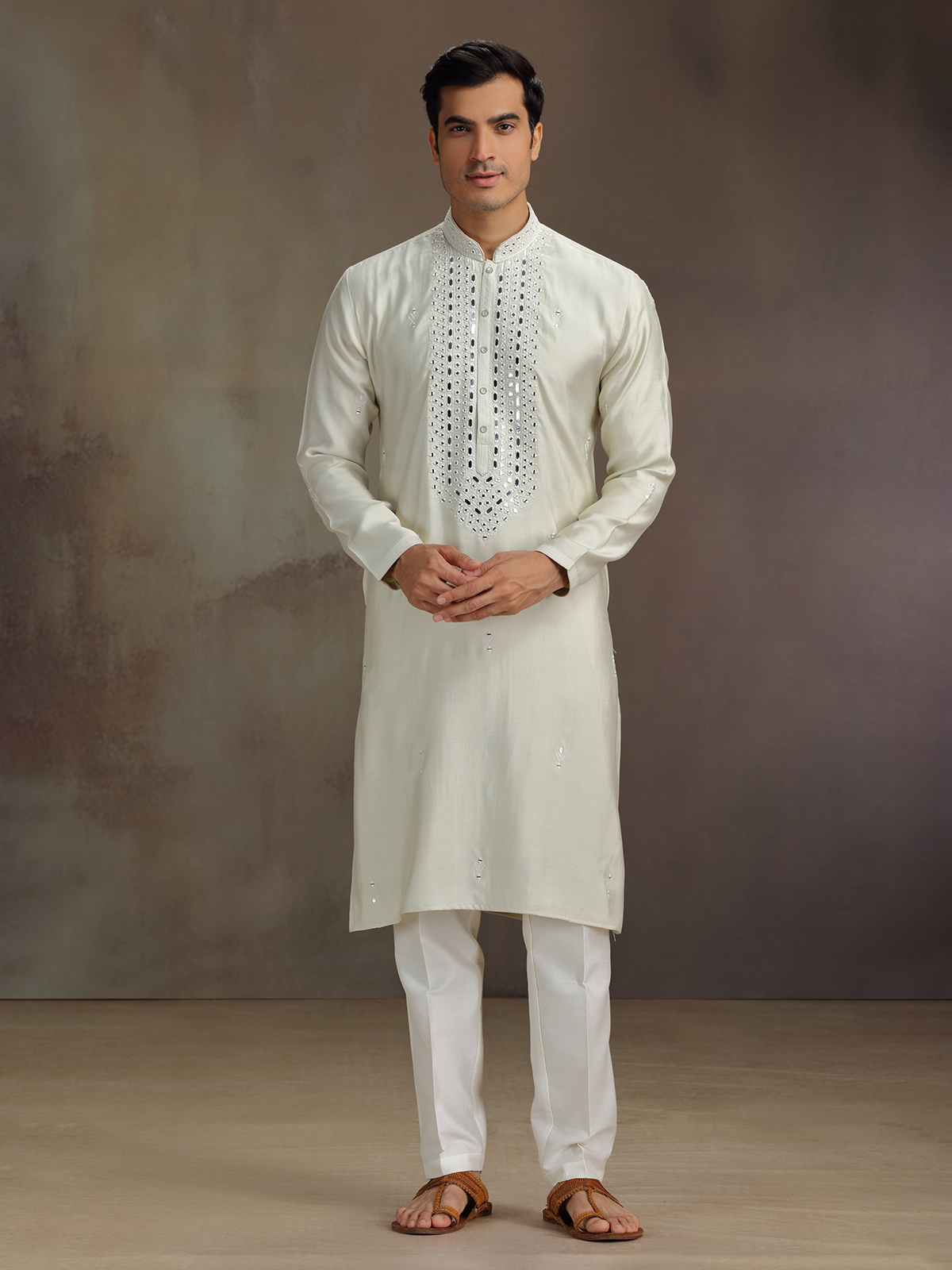 Elegant cream silk defines this kurta set, accentuated with delicate embroidery and aabla work. The Chinese collar adds heritage charm, while pants complete a refined look — ideal for wedding, festive, or sangeet celebrations.