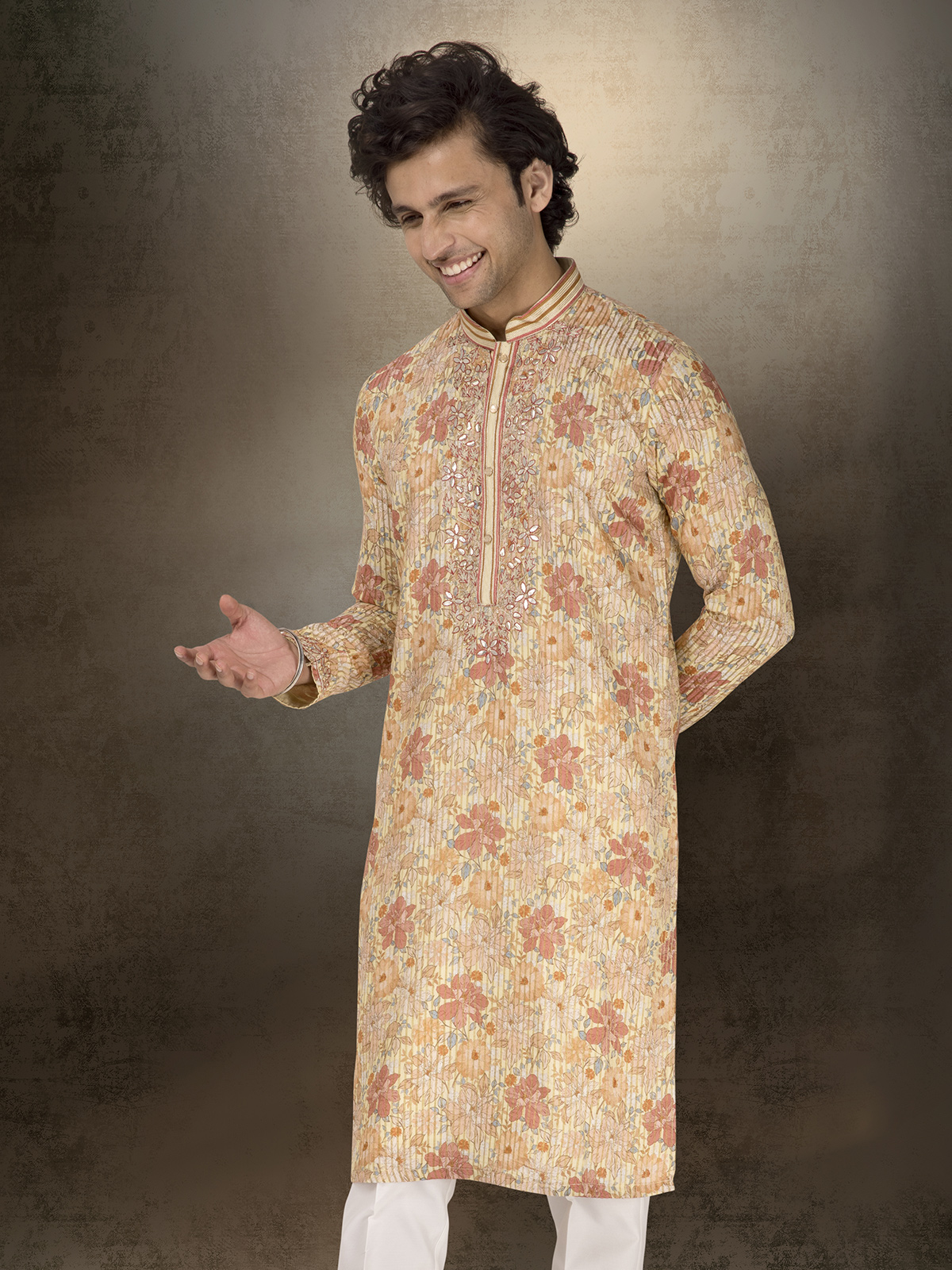 Crafted in smooth cream silk, this floral printed kurta suit gleams with embroidery, beads, and zardosi work. The mandarin collar and sleek tailoring exude classic poise. Paired with coordinating pants, it embodies timeless grace for festive evenings and joyous wedding celebrations.