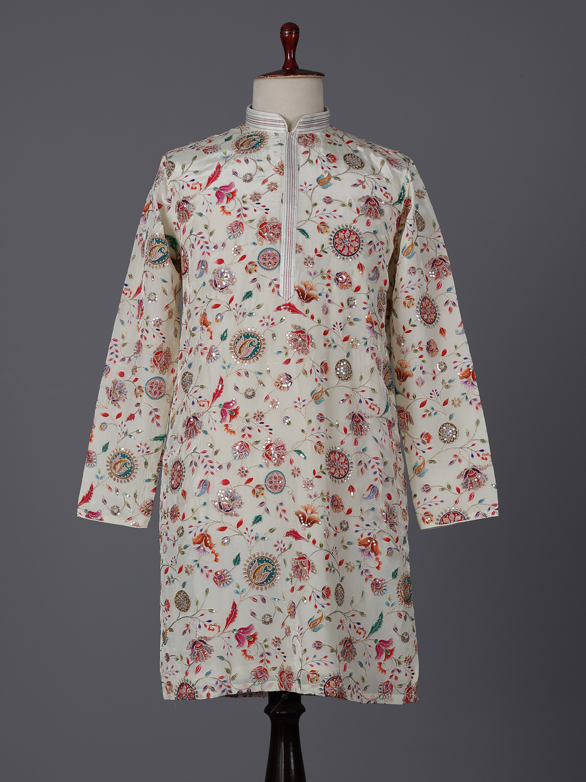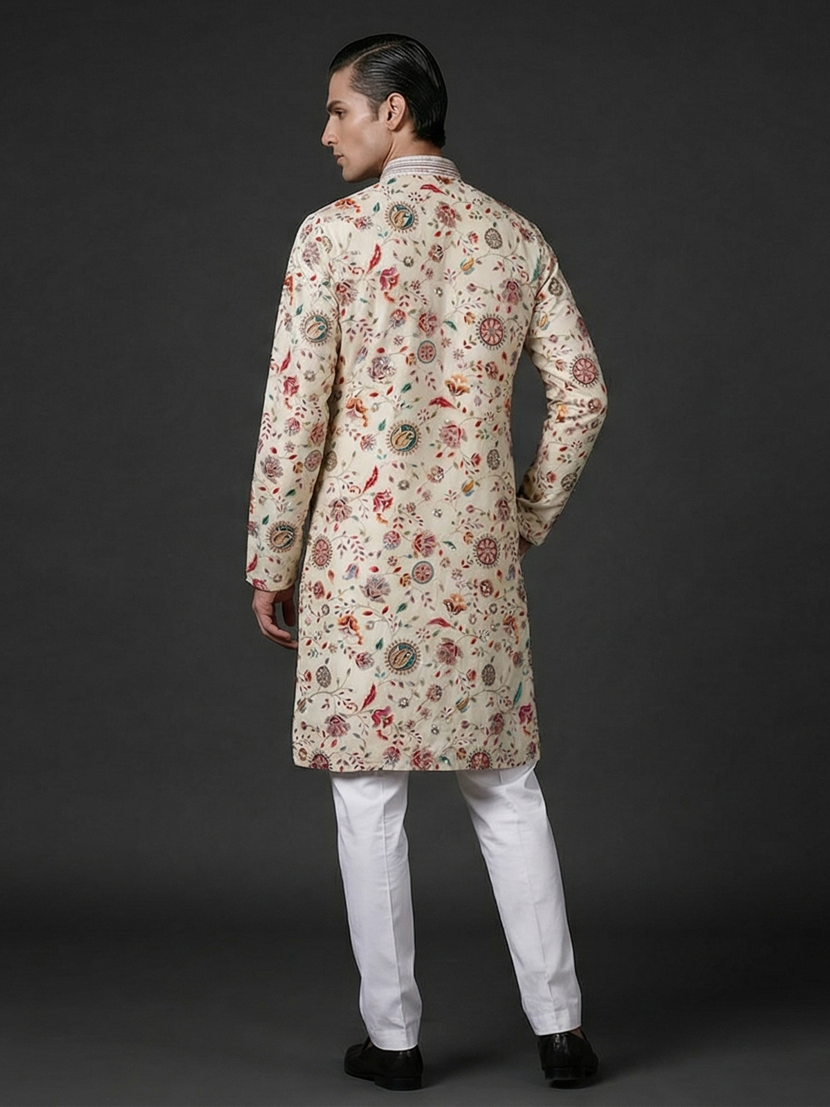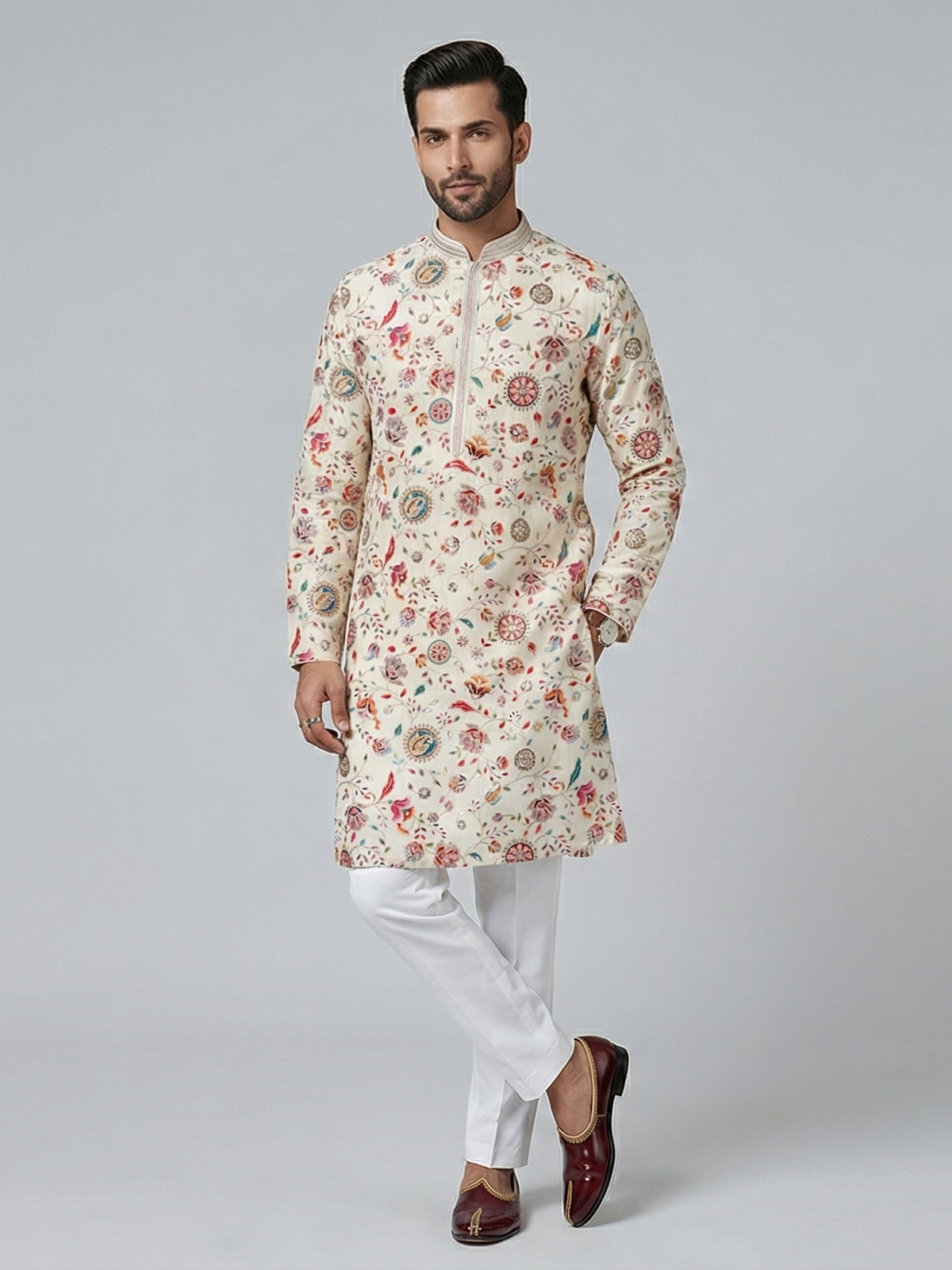 Elegant cream silk kurta set adorned with floral prints and resham sequins detailing. The mandarin collar adds sophistication, while the pant completes the polished look. Ideal for weddings and festive occasions.