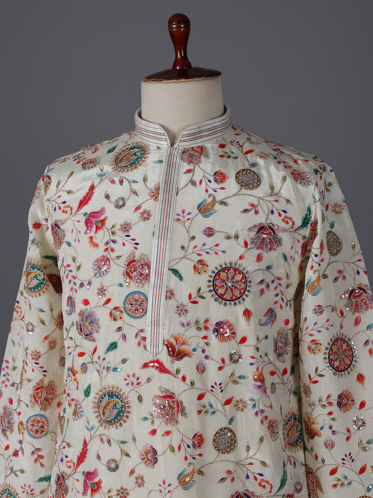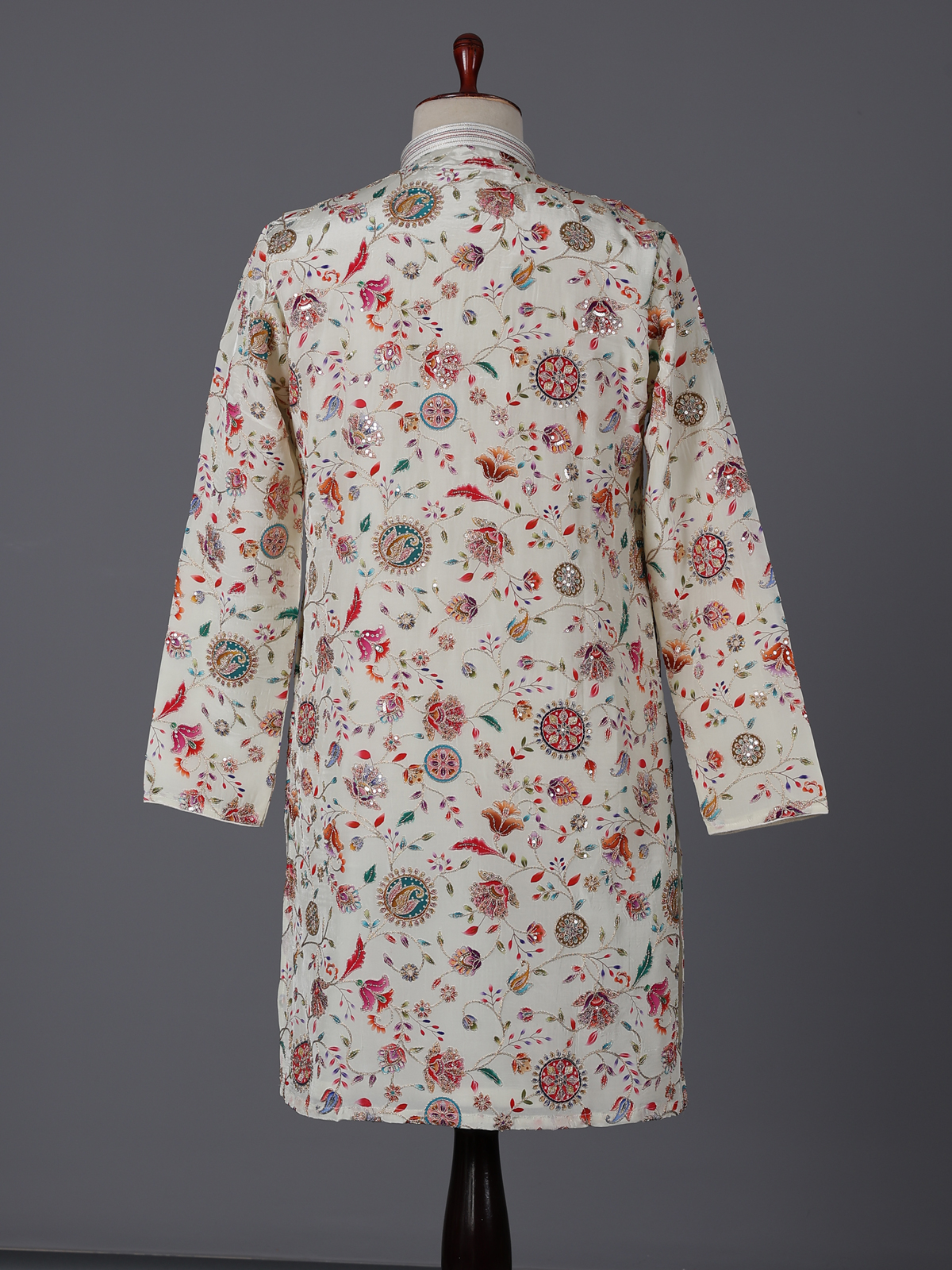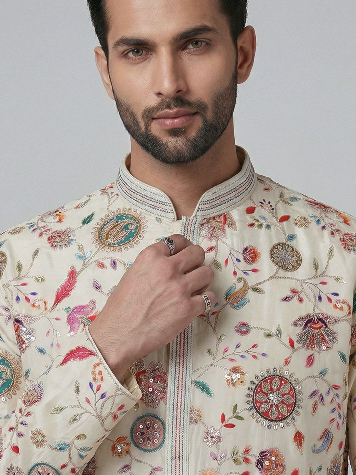 Elegant cream silk kurta set adorned with floral prints and resham sequins detailing. The mandarin collar adds sophistication, while the pant completes the polished look. Ideal for weddings and festive occasions.