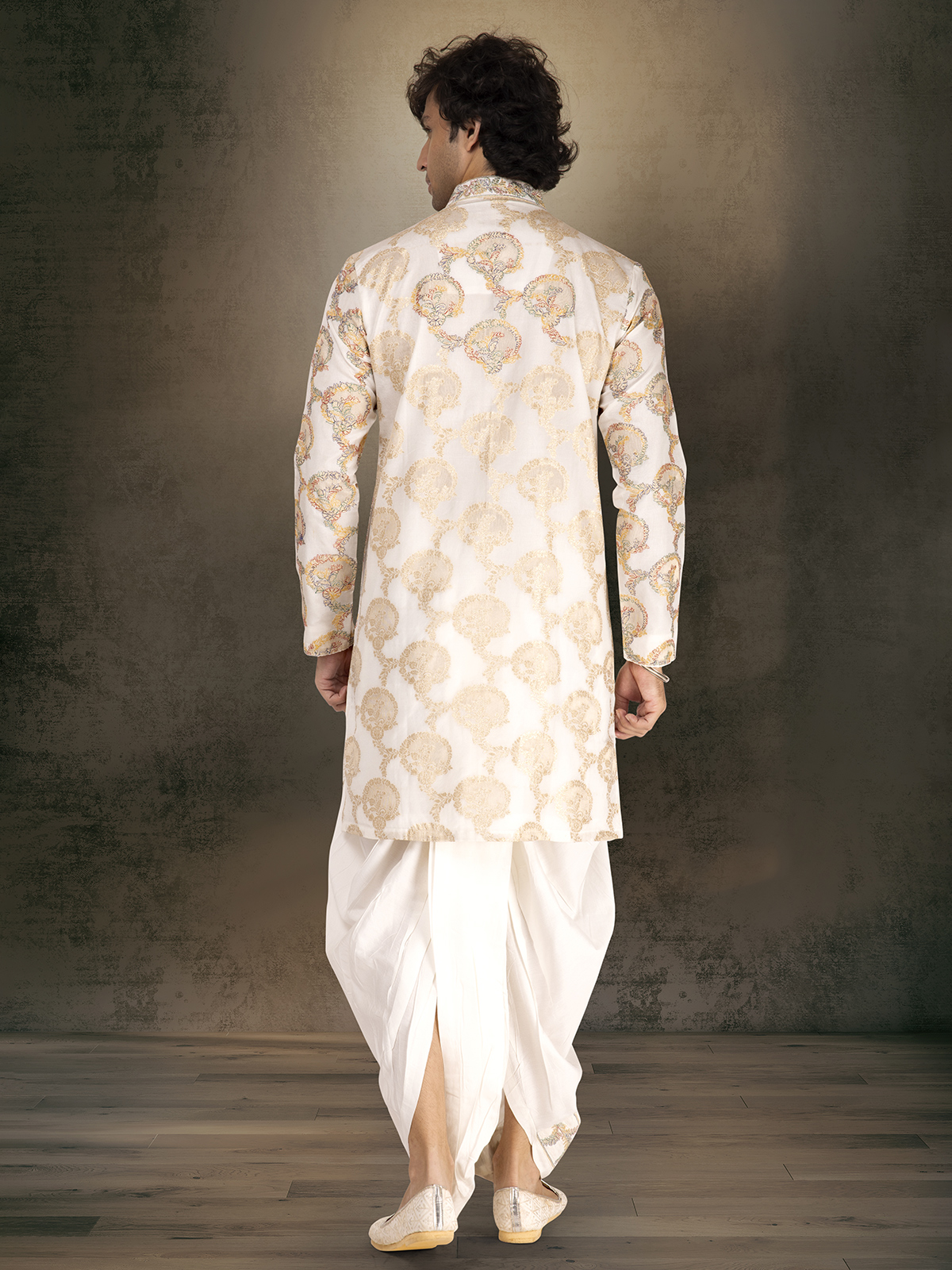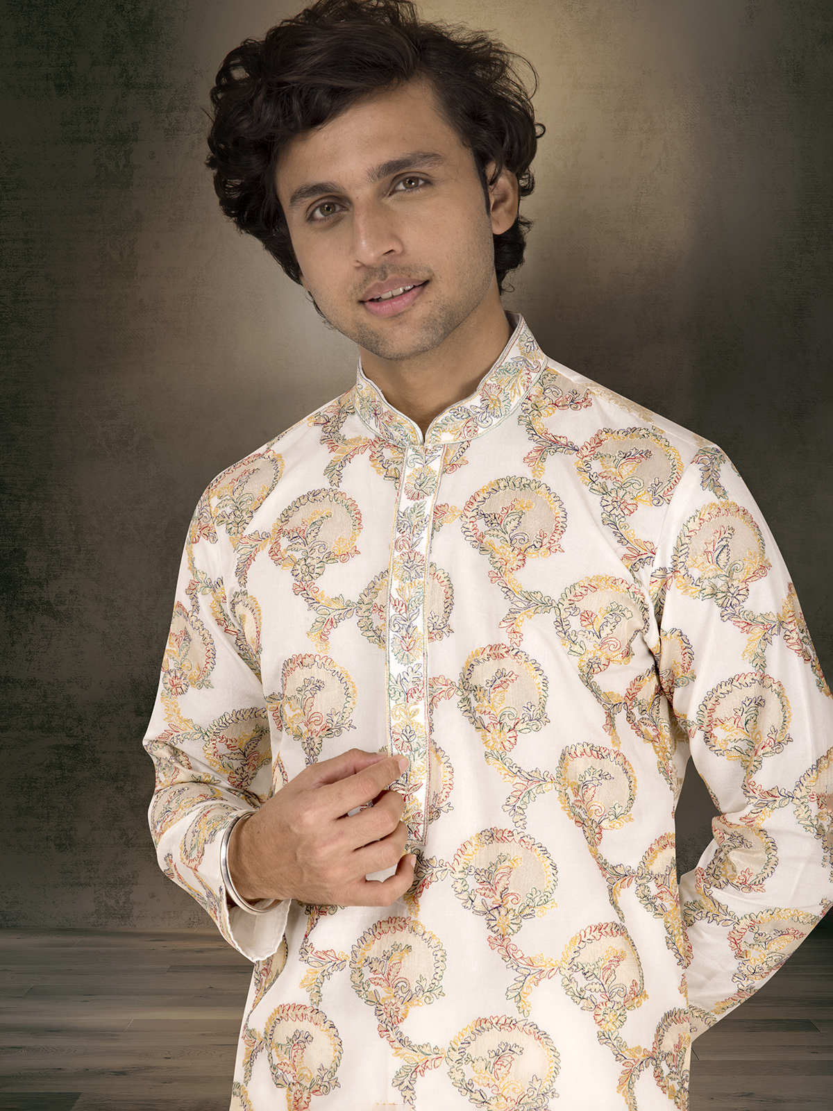 In cream silk, this kurta suit glows with intricate thread and zari work. The mandarin collar enriches its regal appeal, paired with a dhoti for timeless traditional grace — perfect for pujas and festive gatherings.