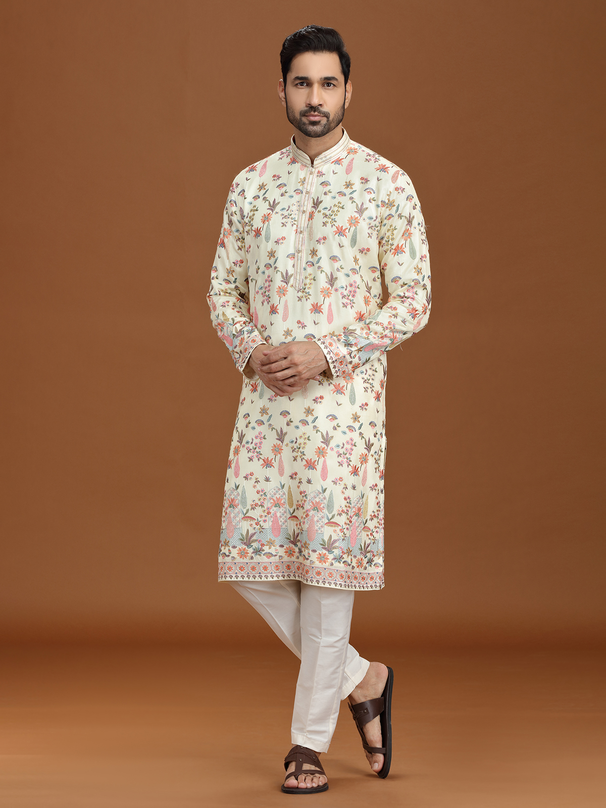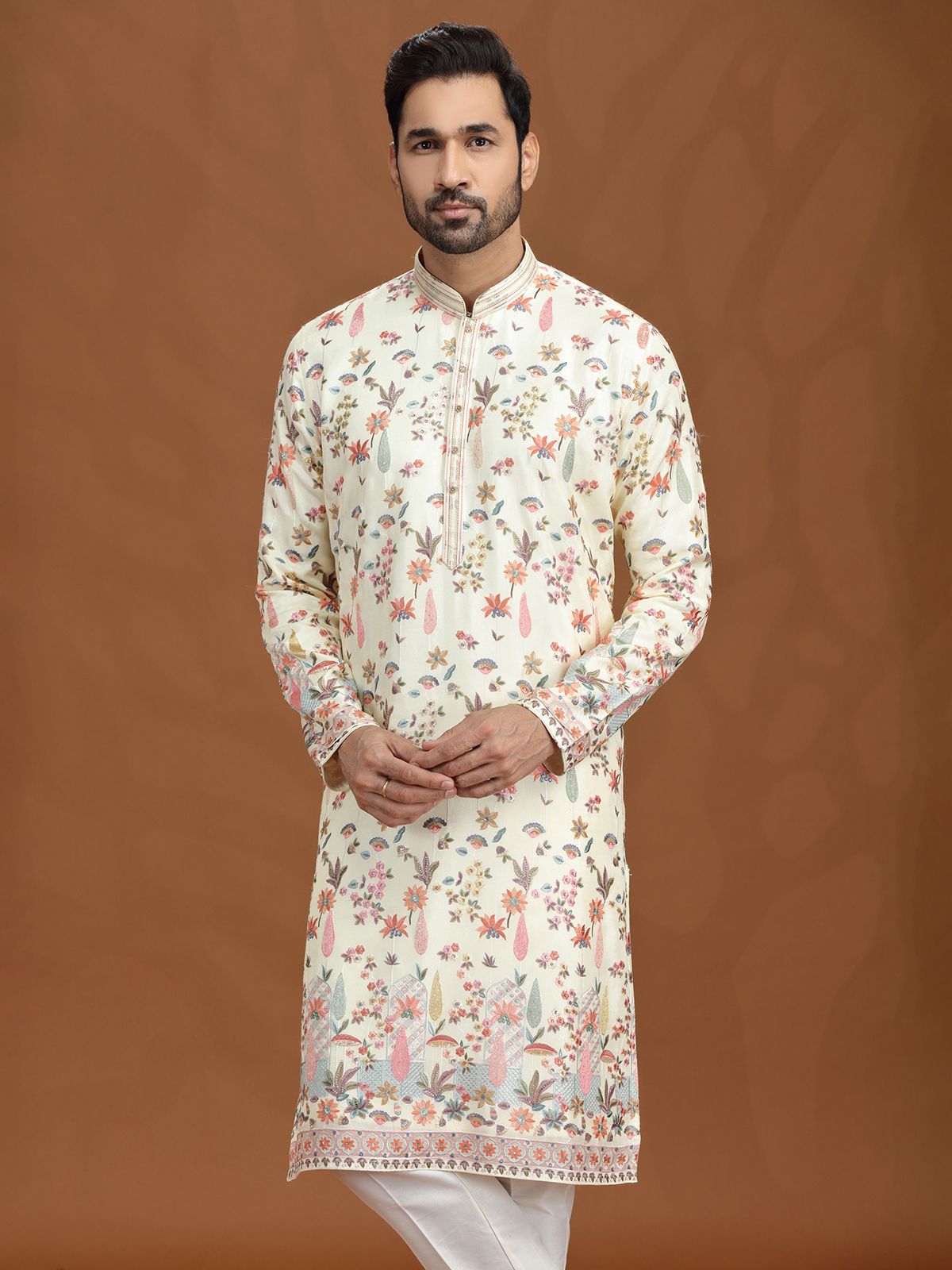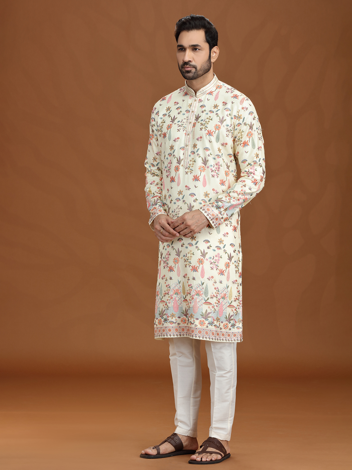 A wedding classic, this cream viscose kurta suit features elegant embroidery with sequins, adding traditional opulence. The stand collar and pant bring structure and sophistication. Timeless and graceful, it is perfect for festive gatherings and wedding ceremonies alike.