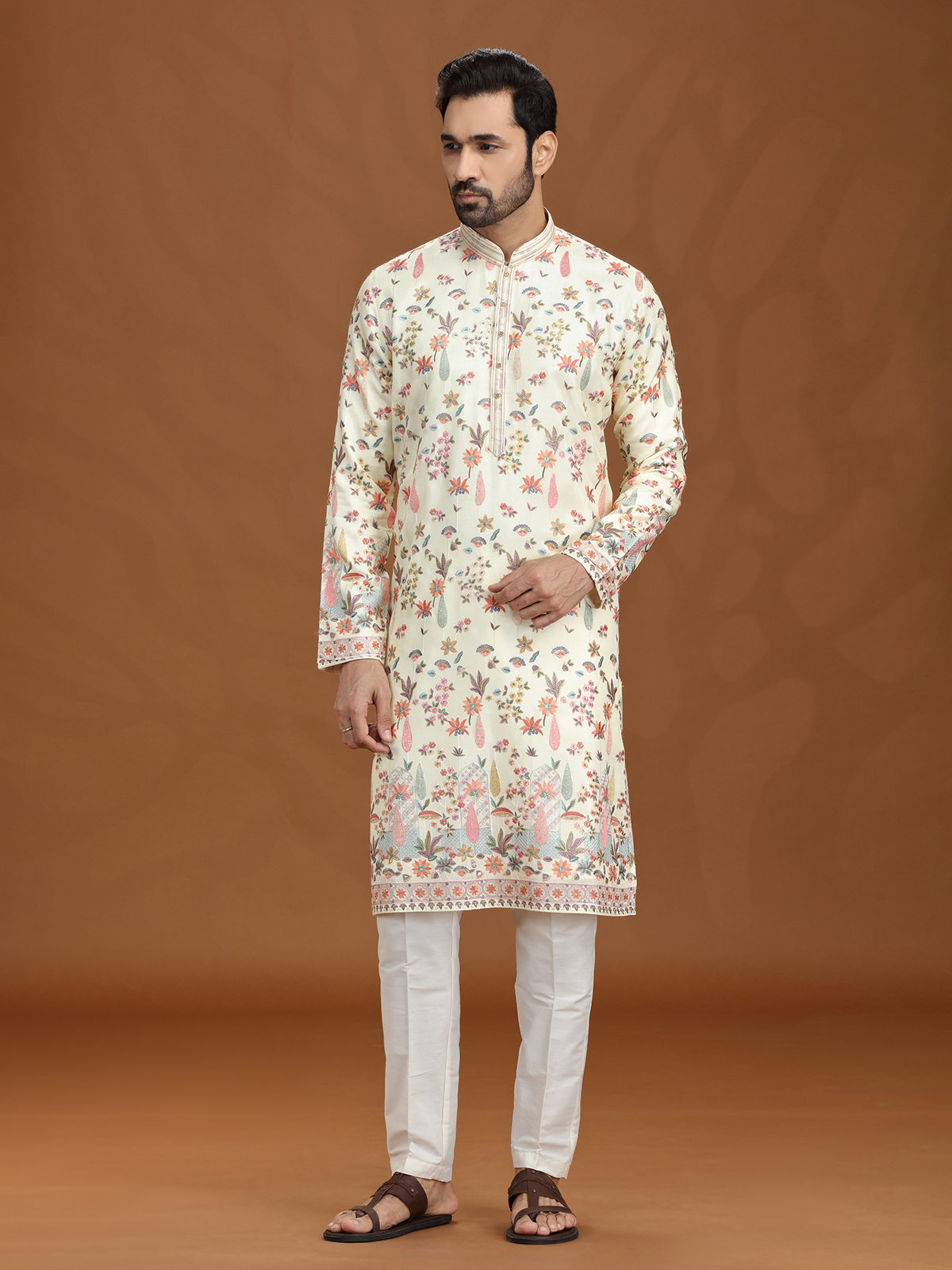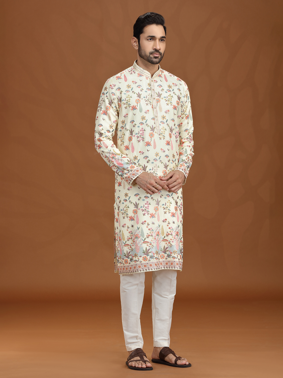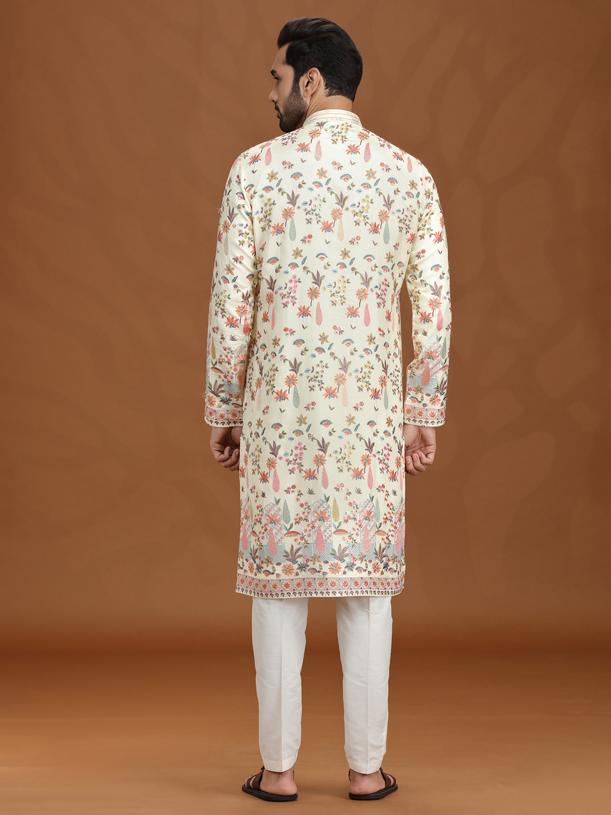 A wedding classic, this cream viscose kurta suit features elegant embroidery with sequins, adding traditional opulence. The stand collar and pant bring structure and sophistication. Timeless and graceful, it is perfect for festive gatherings and wedding ceremonies alike.