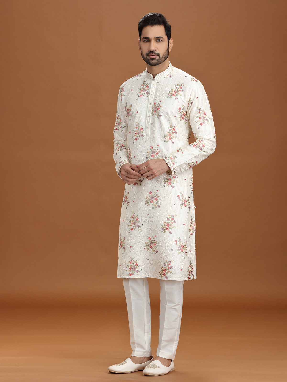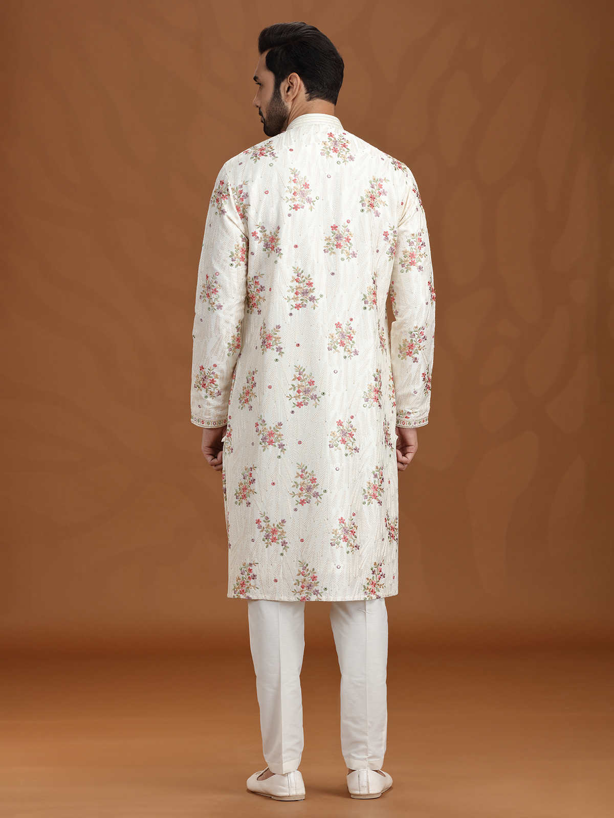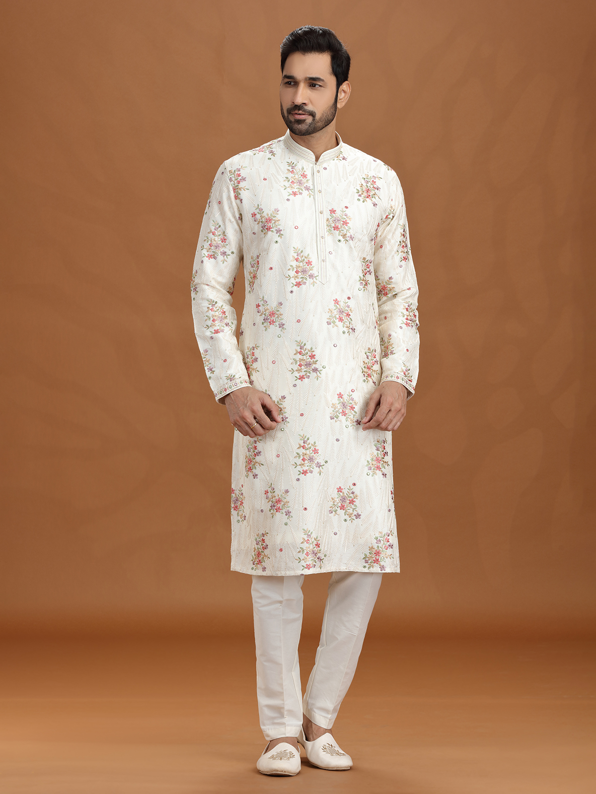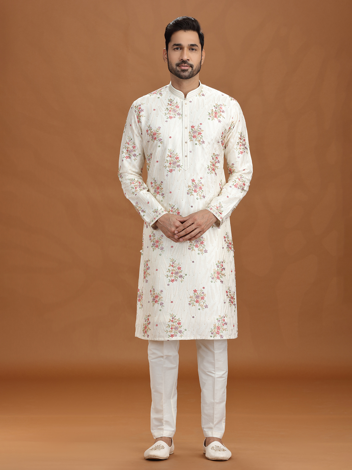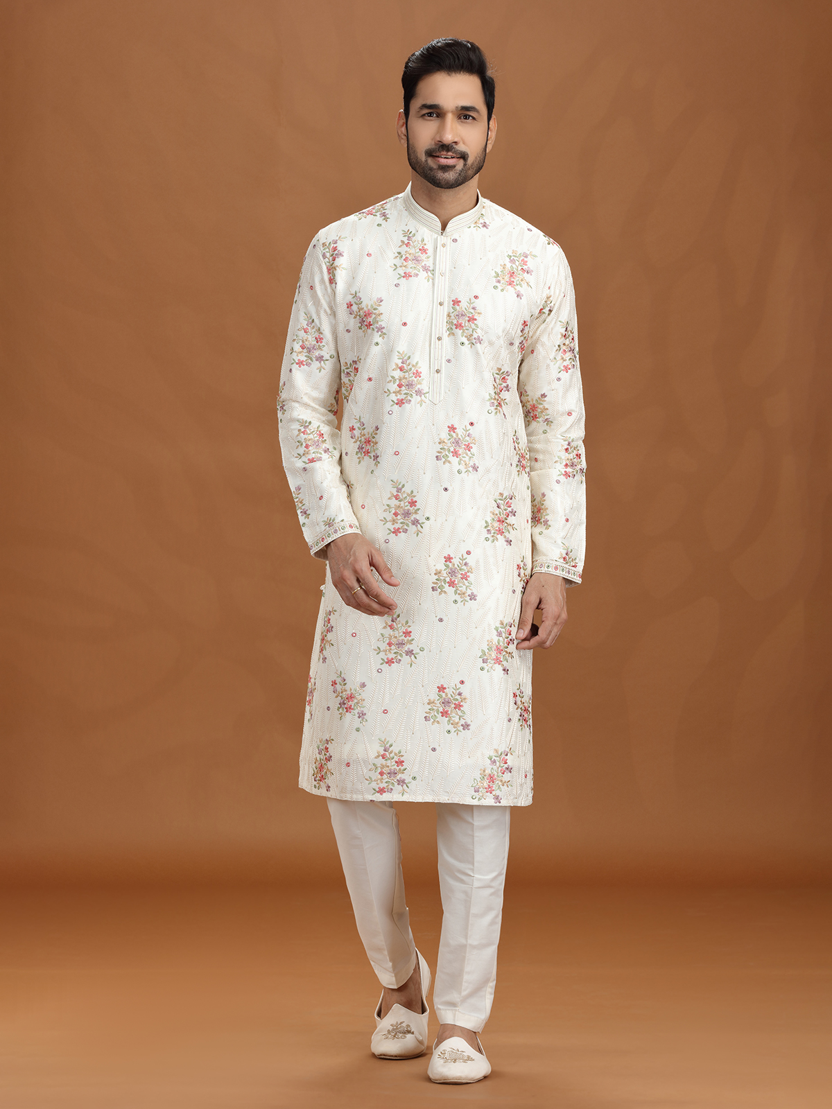 Soft in cream, this viscose kurta suit is enriched with floral embroidery and shimmering sequins. A smart stand collar with pant enhances its refined look. Perfect for weddings, this ensemble expresses tradition with sophistication and timeless appeal.