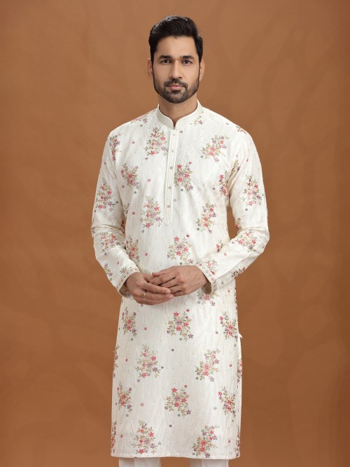 Cream Viscose Kurta Suit With Floral Embroidery Work