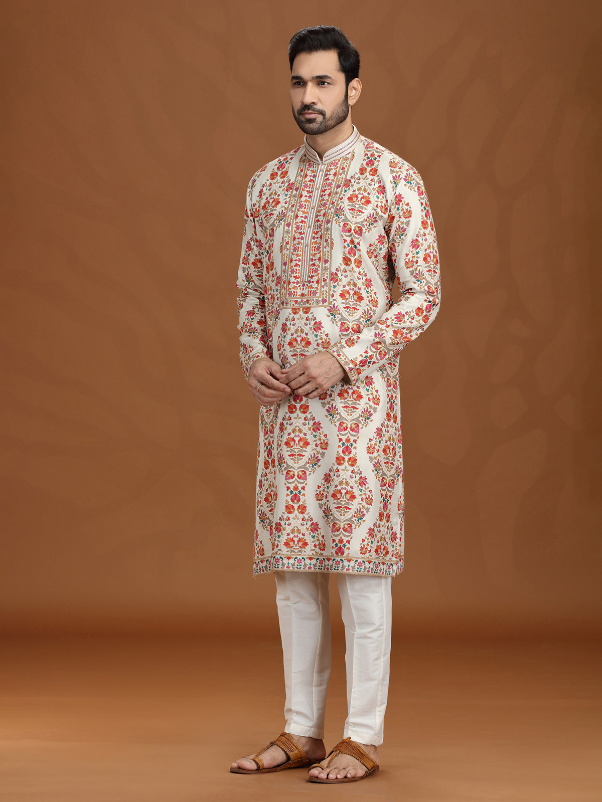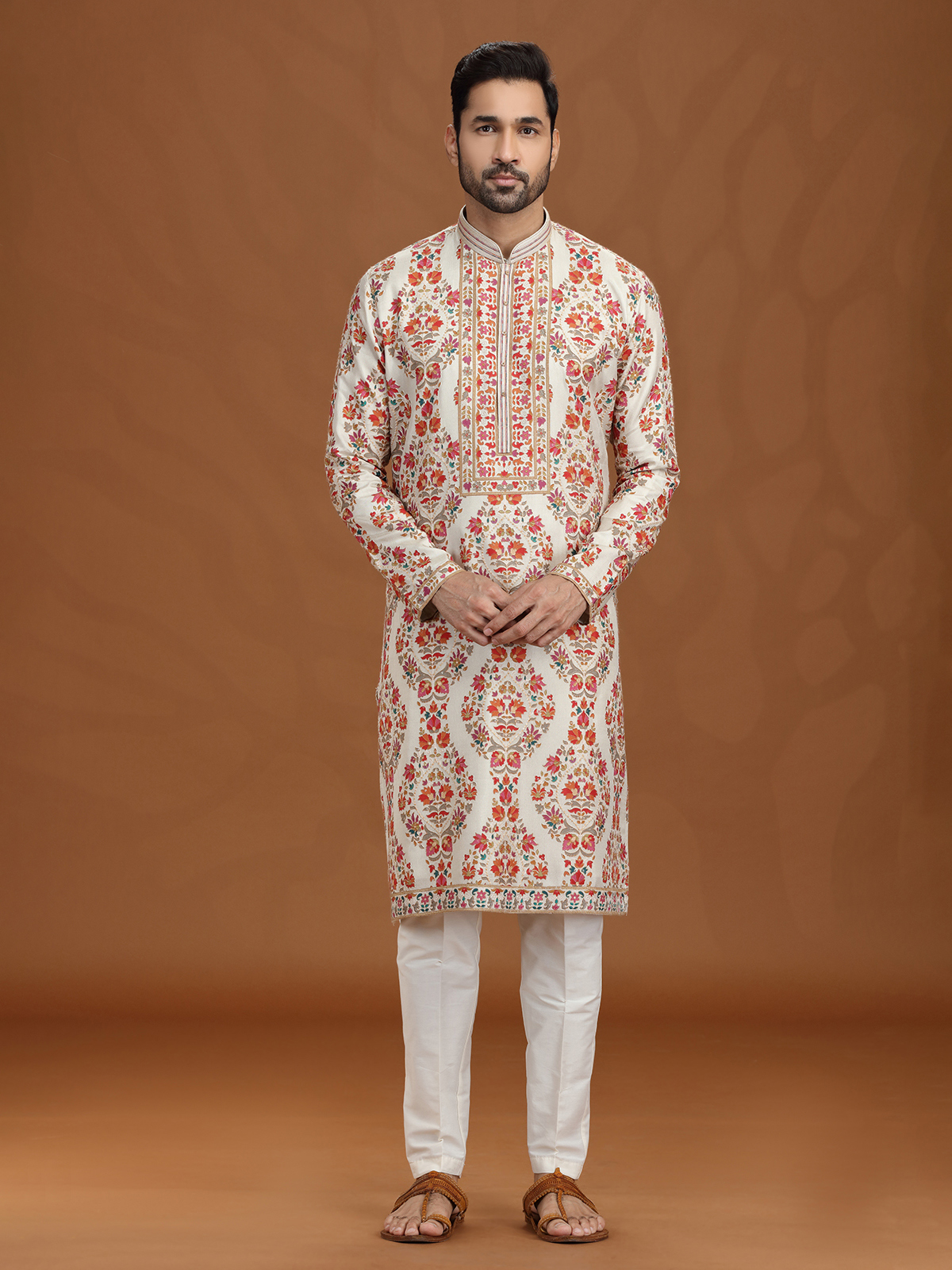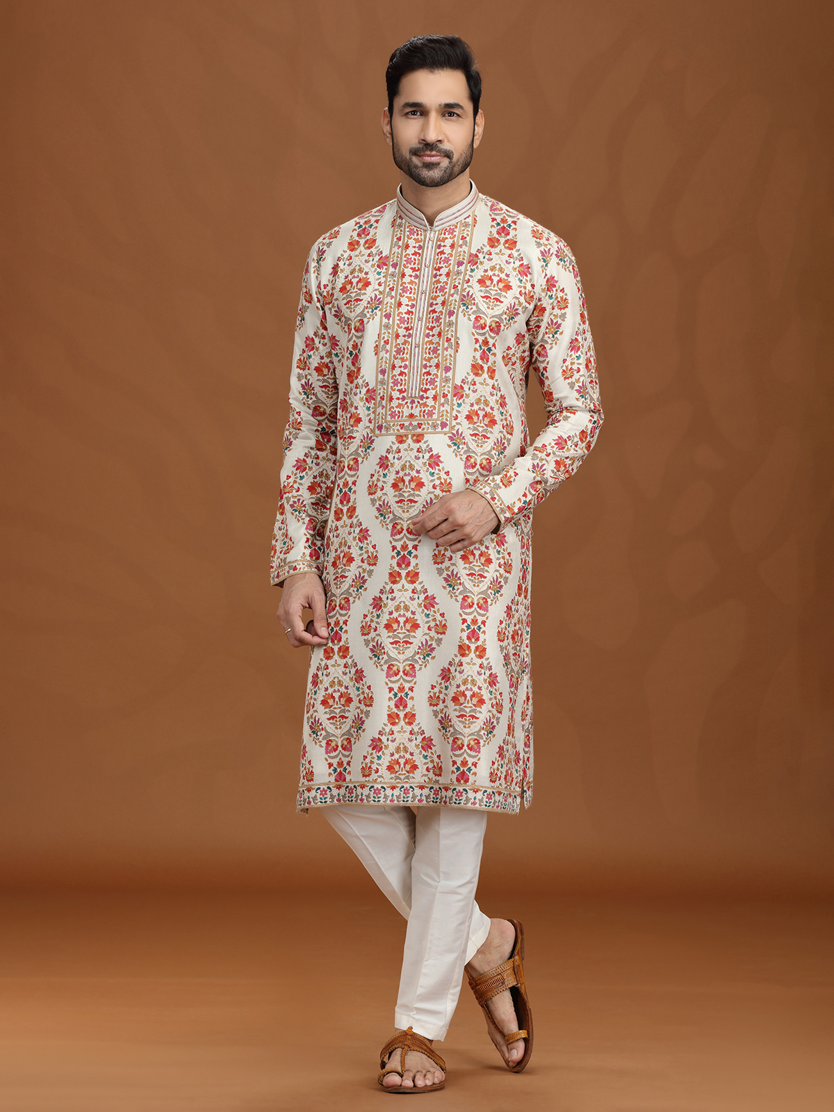This cream viscose kurta suit is tastefully designed with resham and sequins embroidery in colorful motifs. The structured stand collar with pant adds elegance to its festive charm. A versatile piece for cultural gatherings, ensuring comfort while celebrating ethnic finesse in every detail.