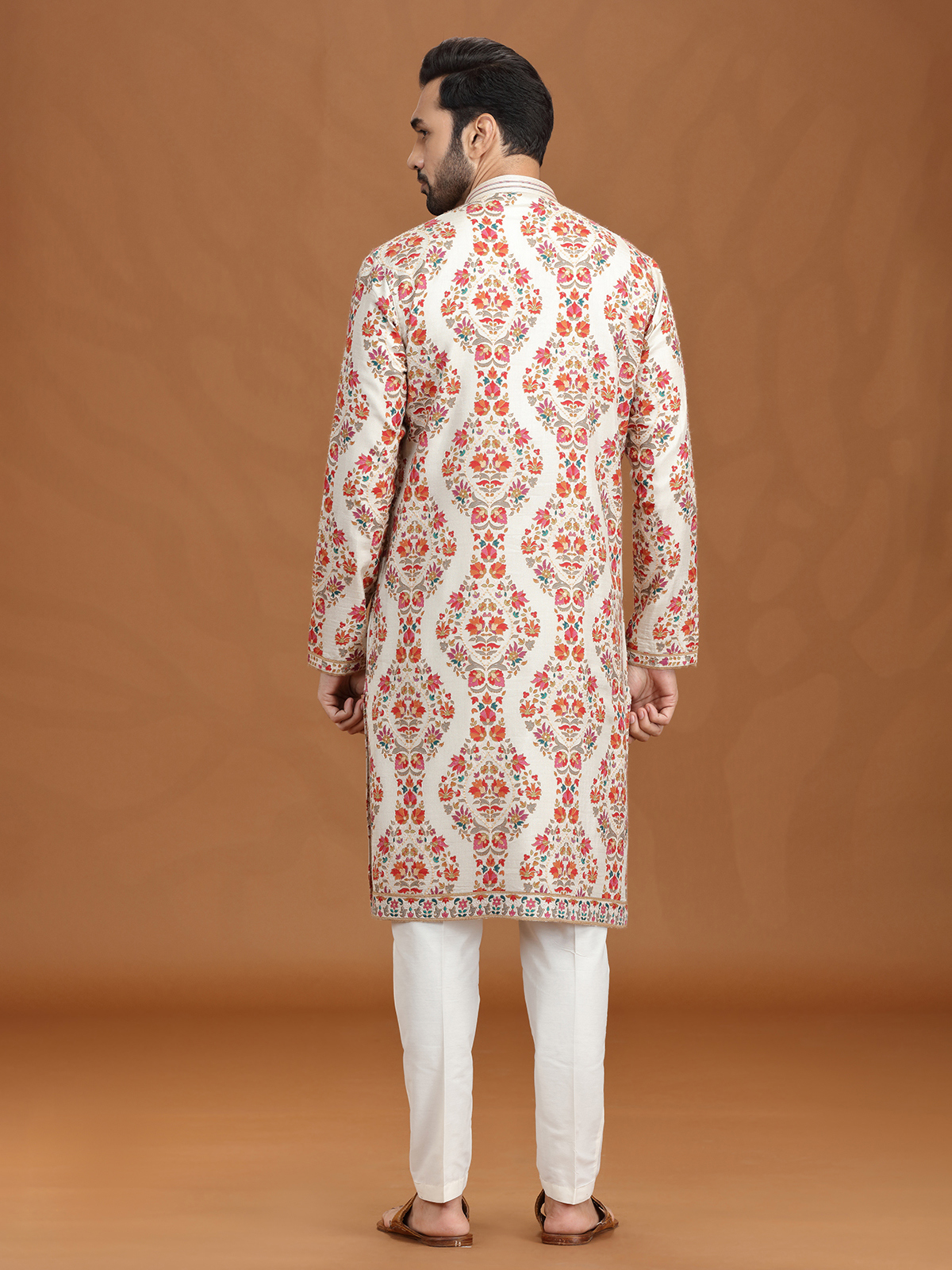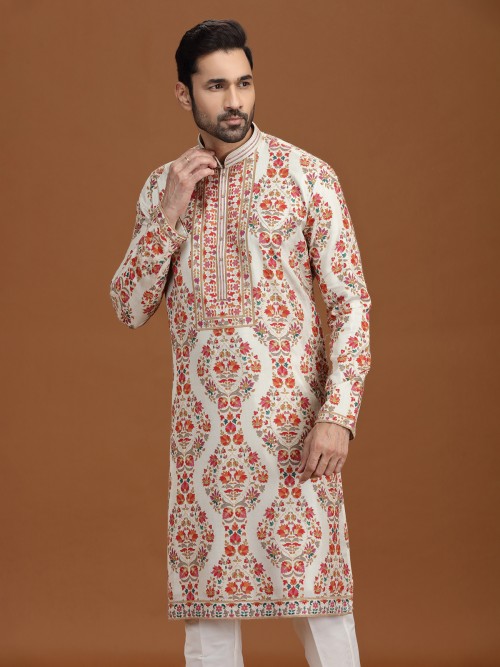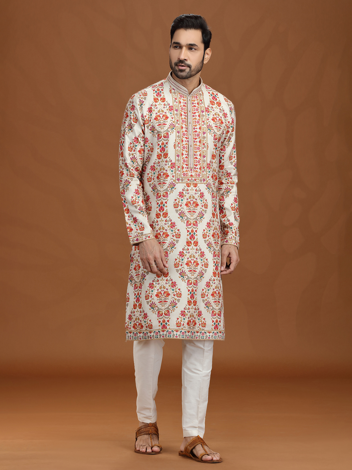 This cream viscose kurta suit is tastefully designed with resham and sequins embroidery in colorful motifs. The structured stand collar with pant adds elegance to its festive charm. A versatile piece for cultural gatherings, ensuring comfort while celebrating ethnic finesse in every detail.