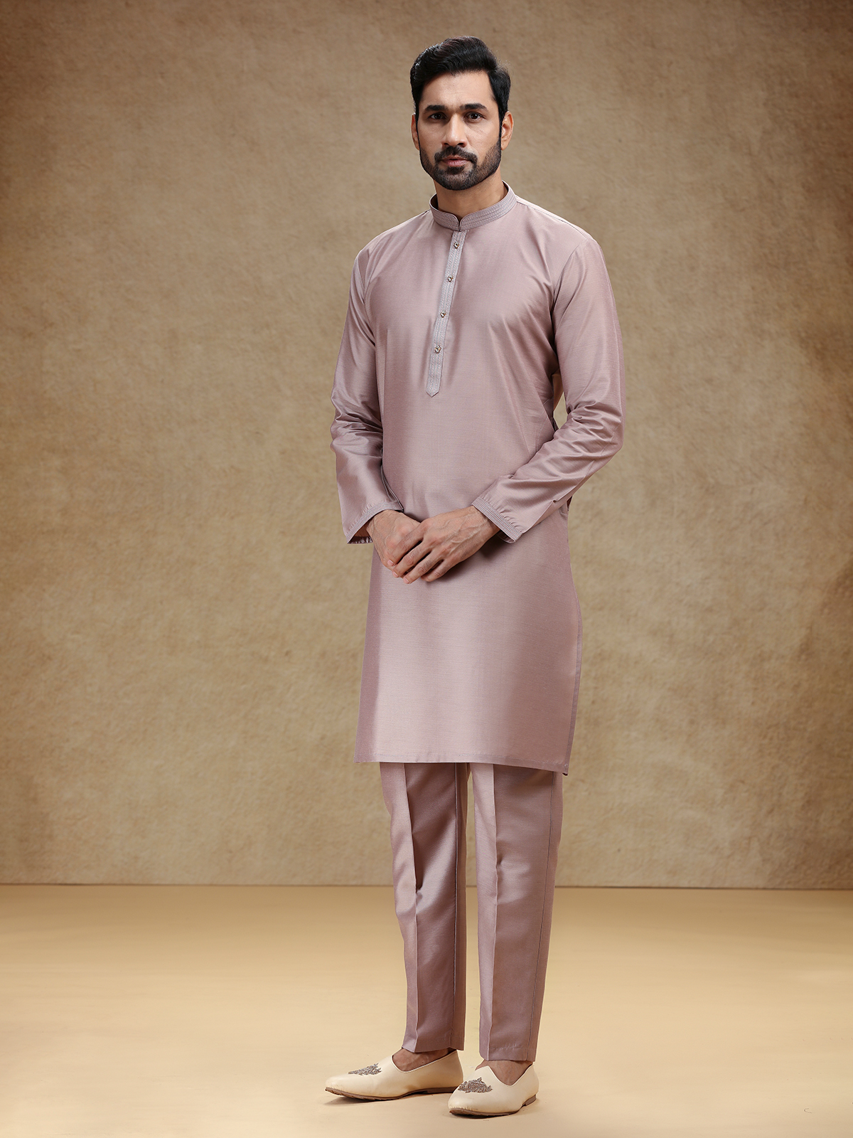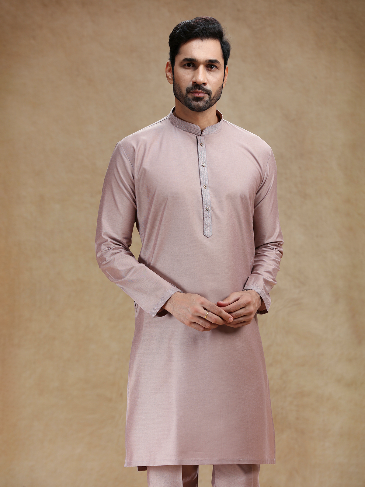 Dark beige cotton silk lends quiet sophistication to this kurta, designed with a stand collar and full sleeves. A versatile choice for pooja and festive occasions, it balances tradition with simplicity. Paired with a plain pant bottom, the ensemble feels timeless.