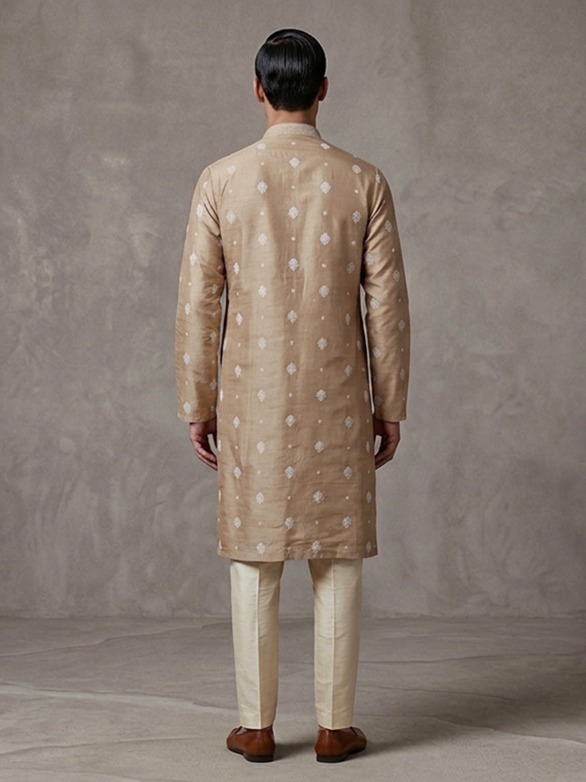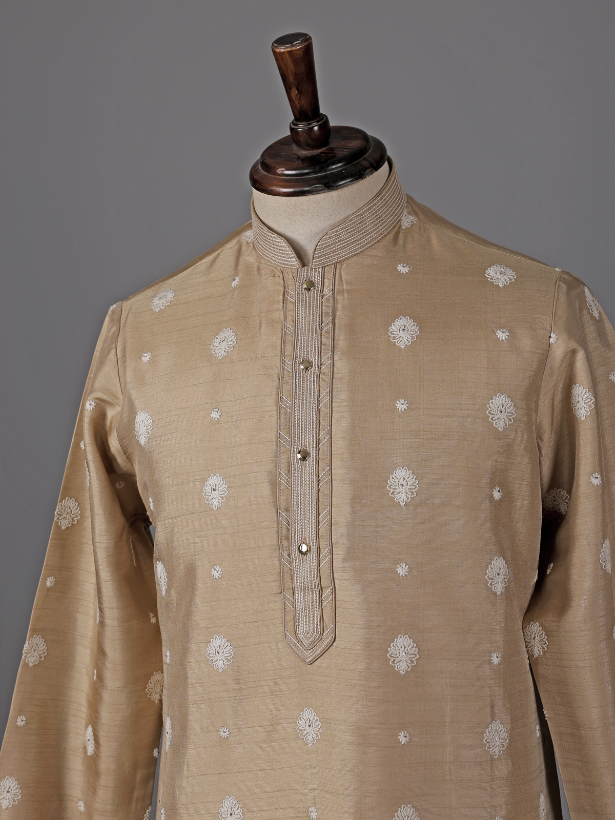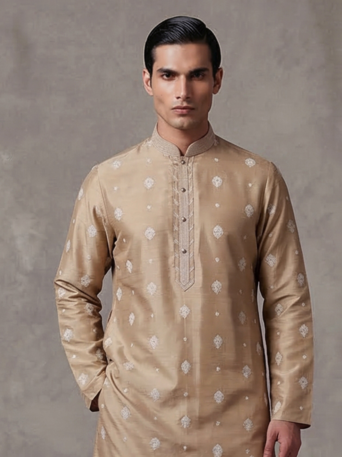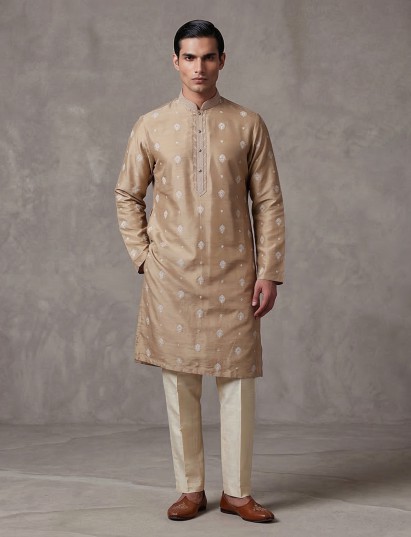 Understated elegance shines through this dark beige silk kurta suit. Designed for refined festive wear. The mandarin collar kurta features graceful embroidery enhanced with subtle sequin detailing that adds a gentle shimmer. Crafted in rich silk and paired with tailored pants, the ensemble offers a balanced blend of sophistication and comfort, ideal for eid celebrations and festive gatherings.