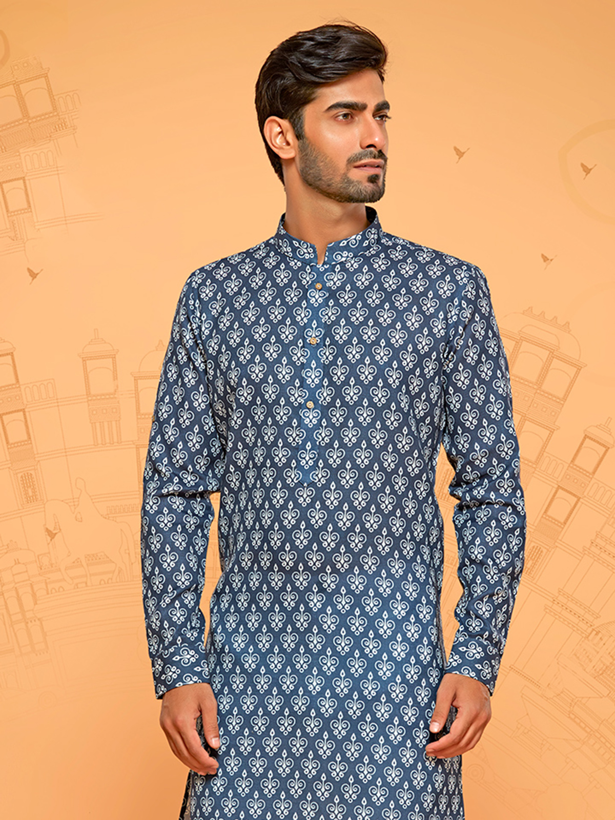 This dark blue printed kurta suit is incredibly gorgeous, with its eye-catching designs. It comes with a bottom, full sleeves, and a mandarin collar.