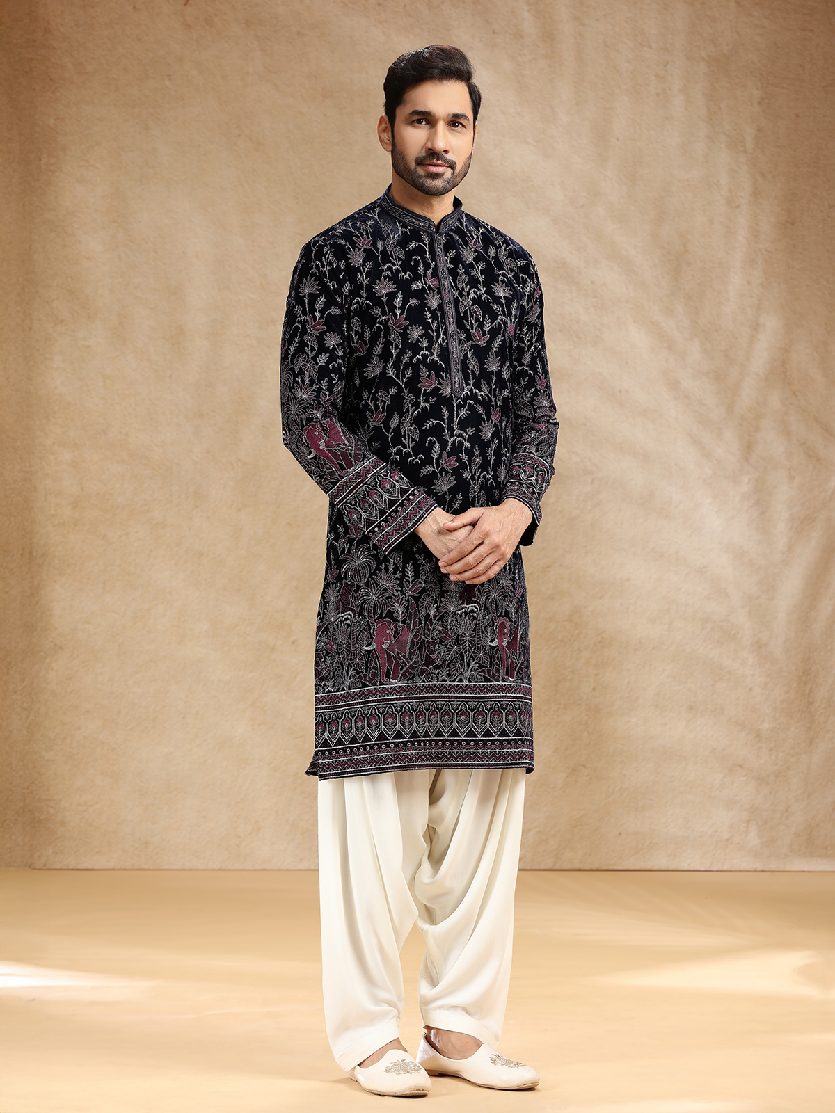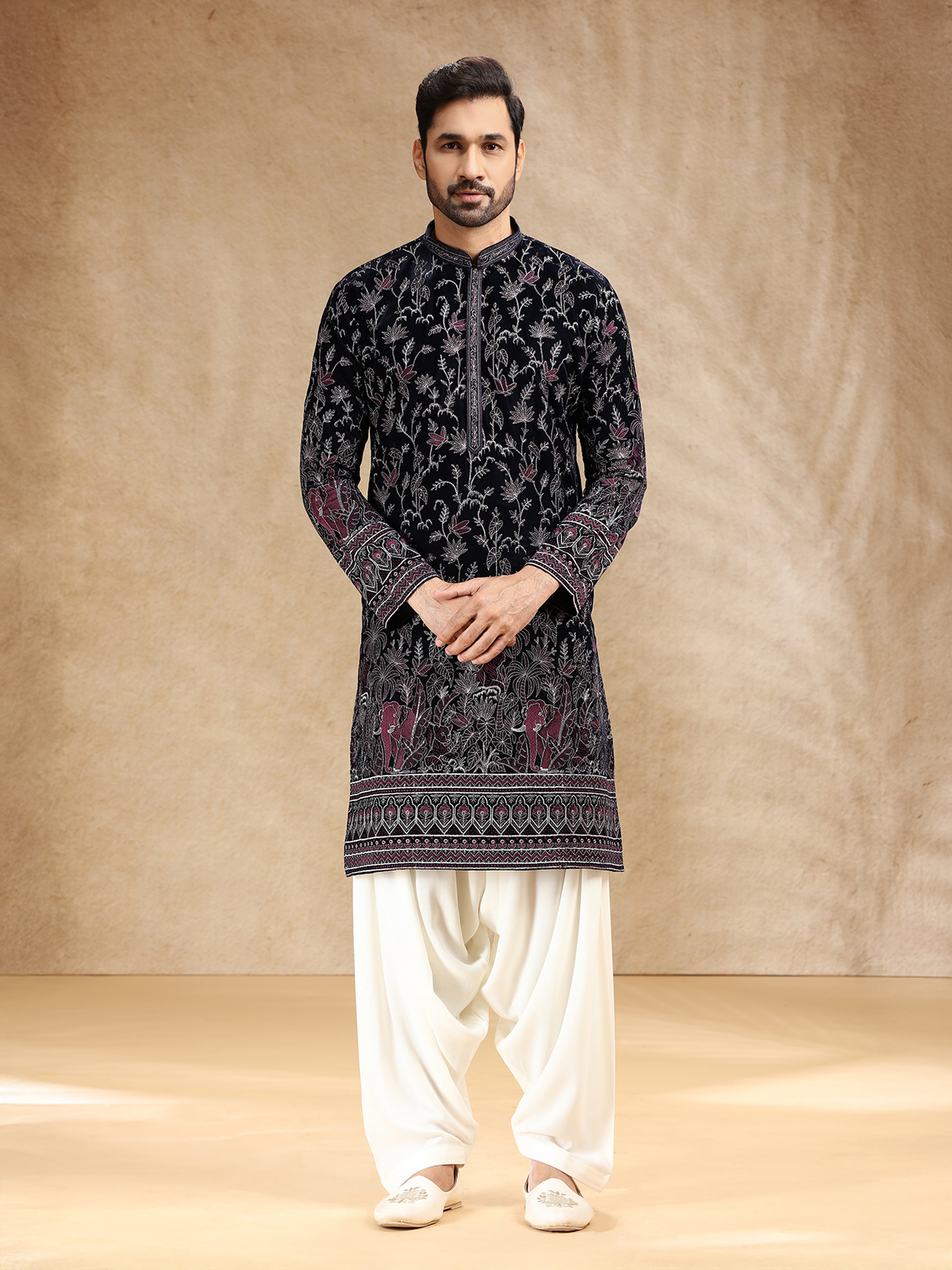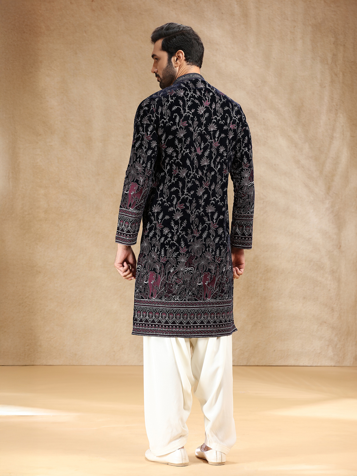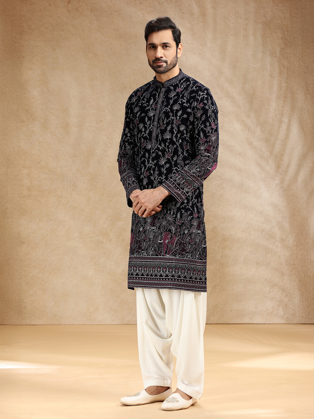 Dark Blue Velvet Kurta Pajama With Shimmering Resham