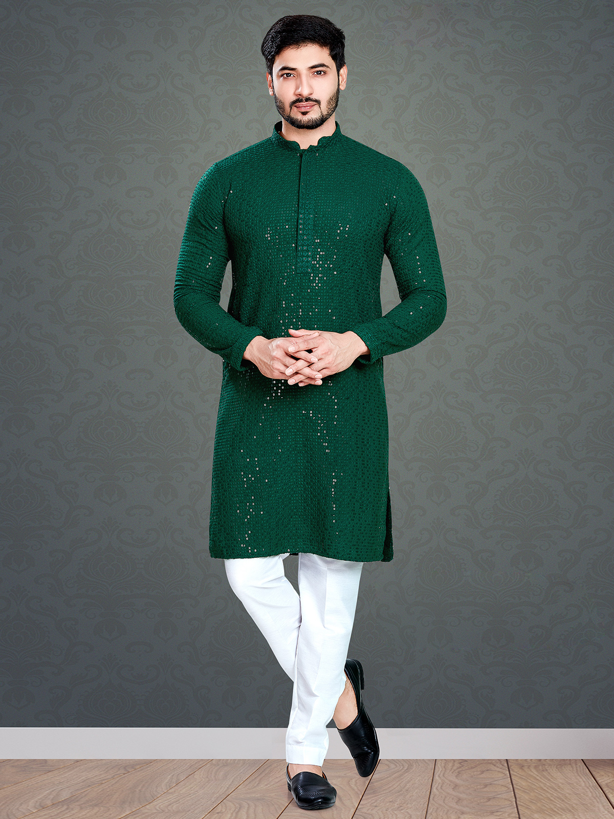 This dark green cotton kurta suit crafted with love. Featuring intricate embroidery, resham and sequins work, it is designed with a mandarin collar and full sleeves, making it an ideal choice for festive occasions. Comes with a bottom.