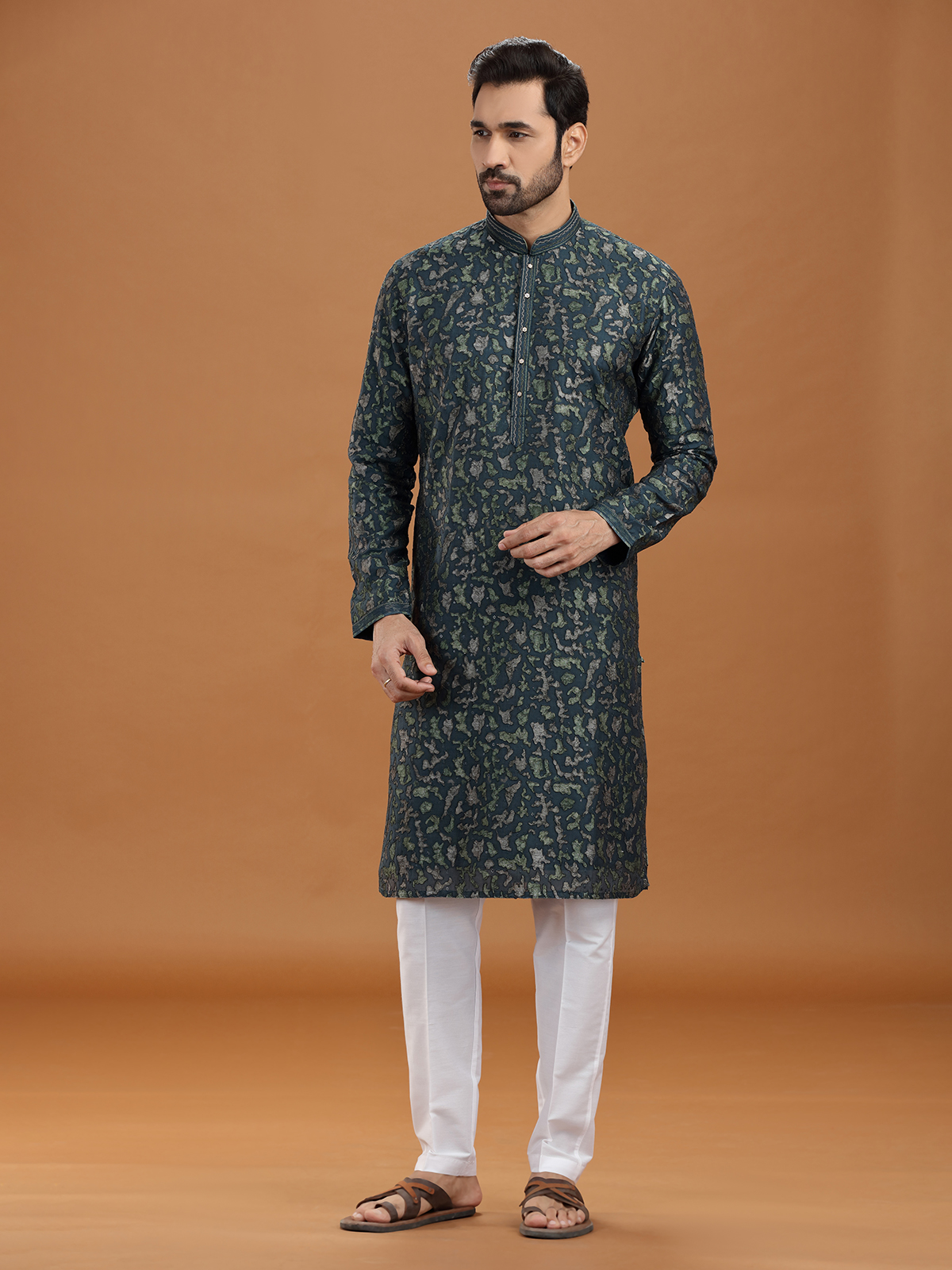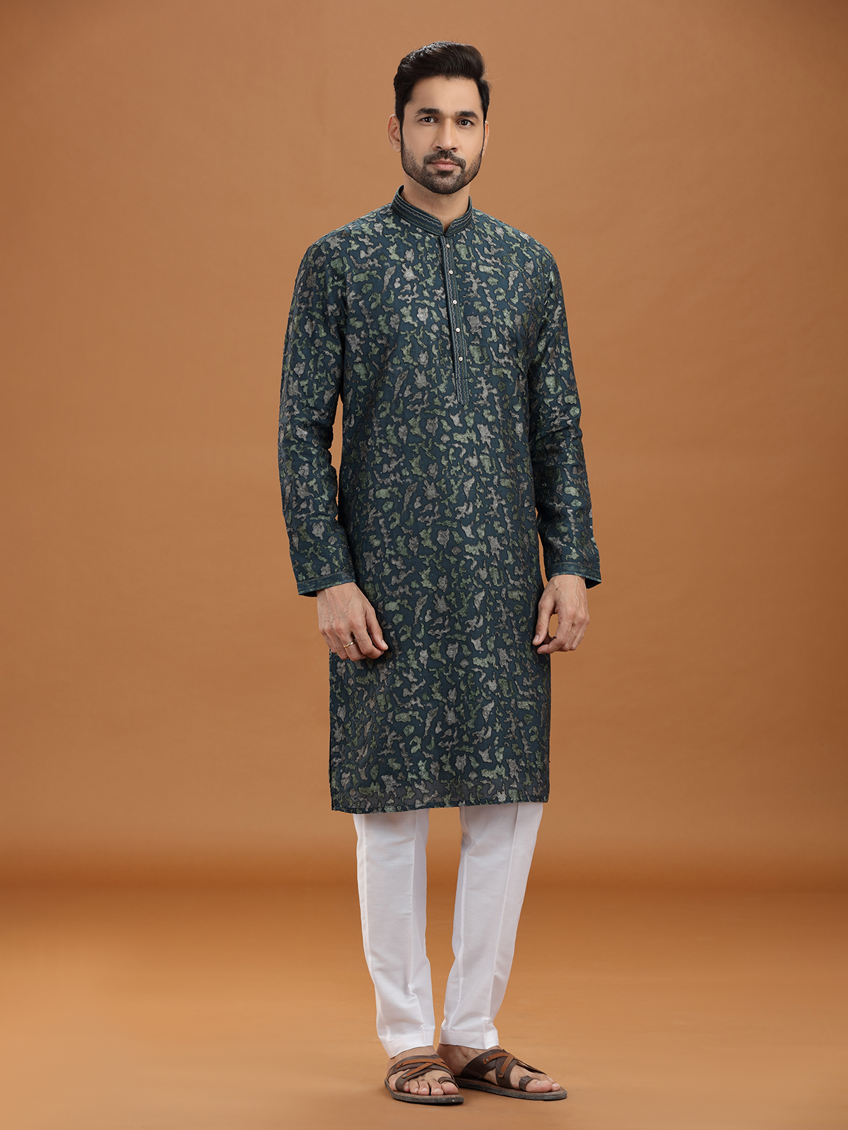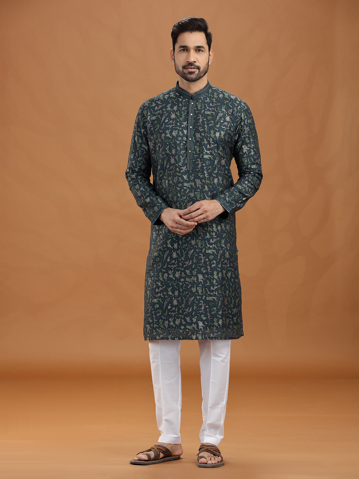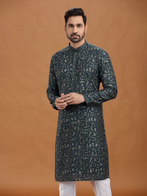 Command attention in this dark green georgette kurta suit enriched with resham, thread, and sequins detailing. The elegant stand collar and tailored pant complement its luxurious fabric, making it suitable for weddings, receptions, and parties. Designed to balance grandeur with subtlety, this attire epitomizes classic sophistication with festive vibrancy.