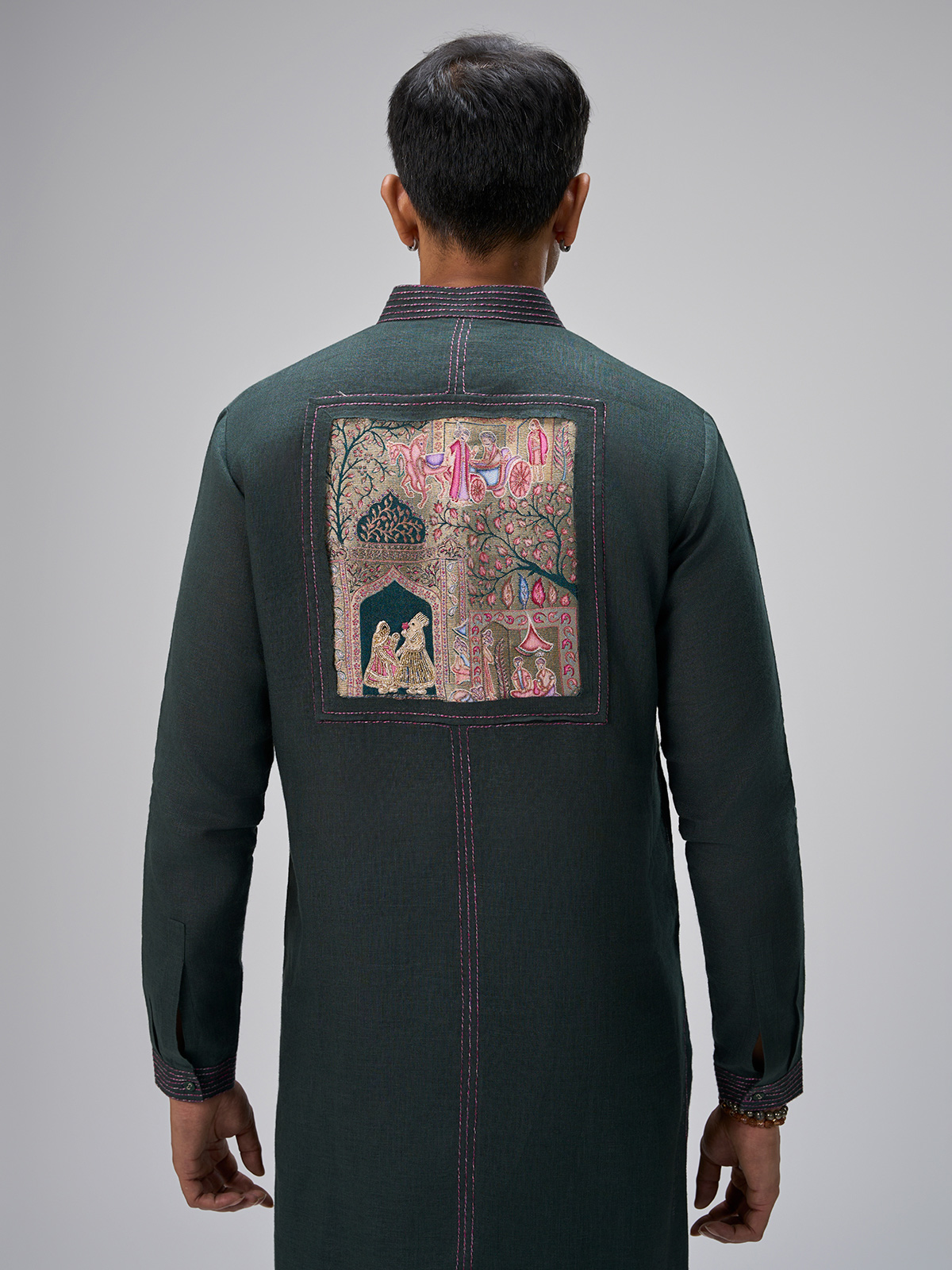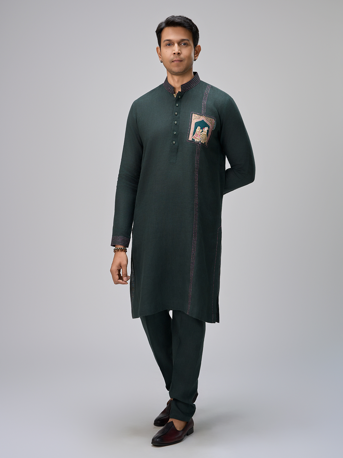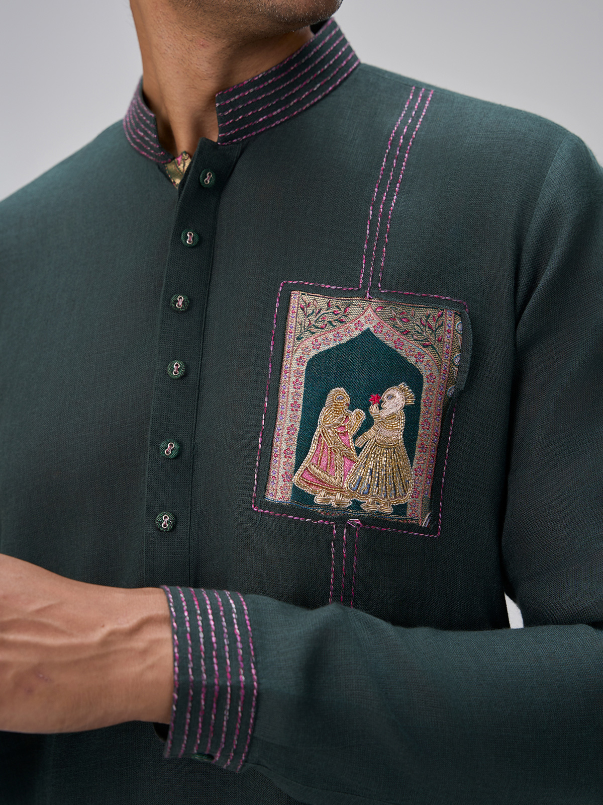 In dark green linen, this kurta features intricate cutdana, patch, thread and bead accents that build a rich festive aura. The chinese collar keeps the look poised for mehendi, sangeet and receptions. The pant enhances comfort while keeping the aesthetic refined.
