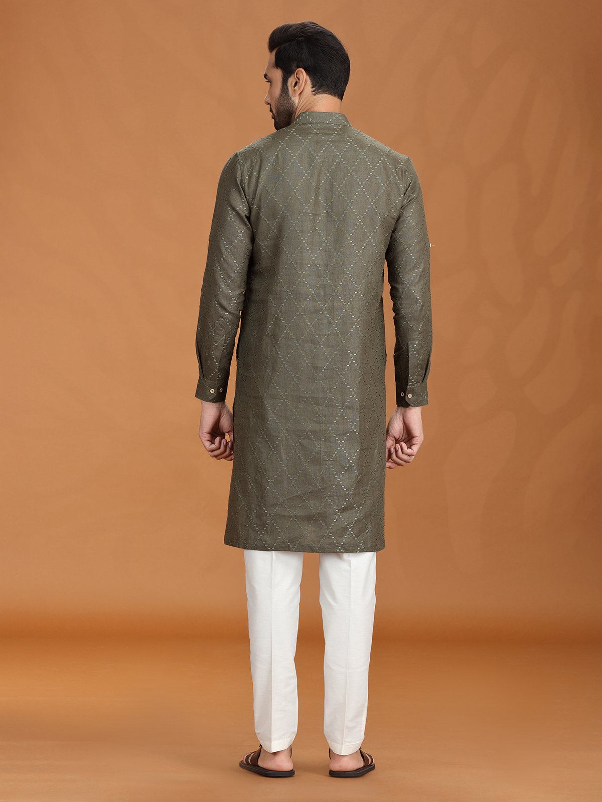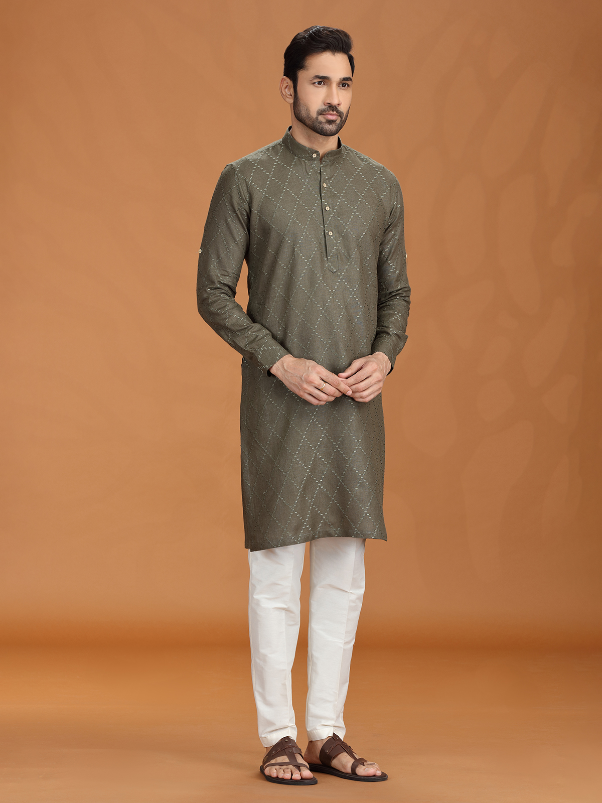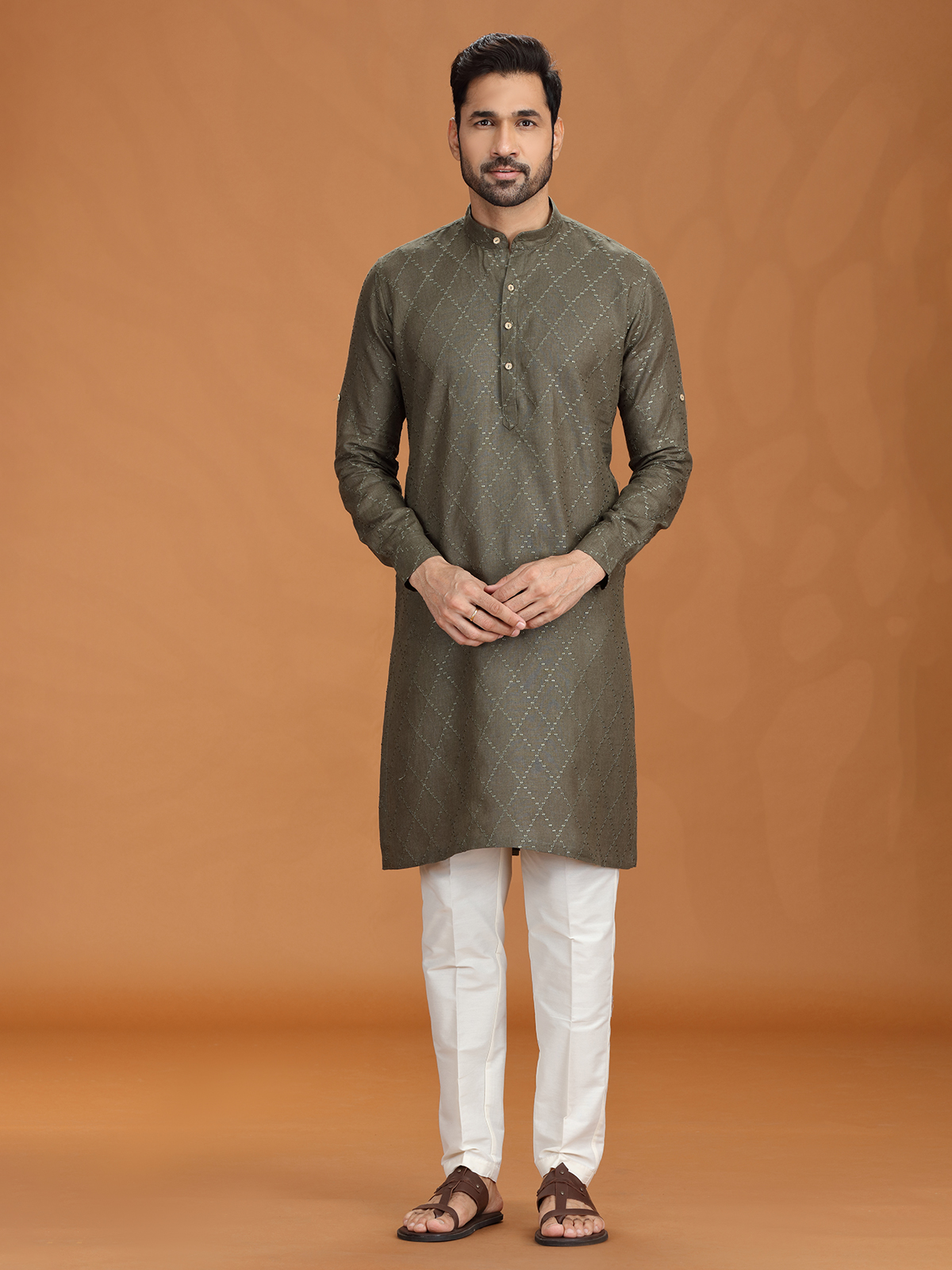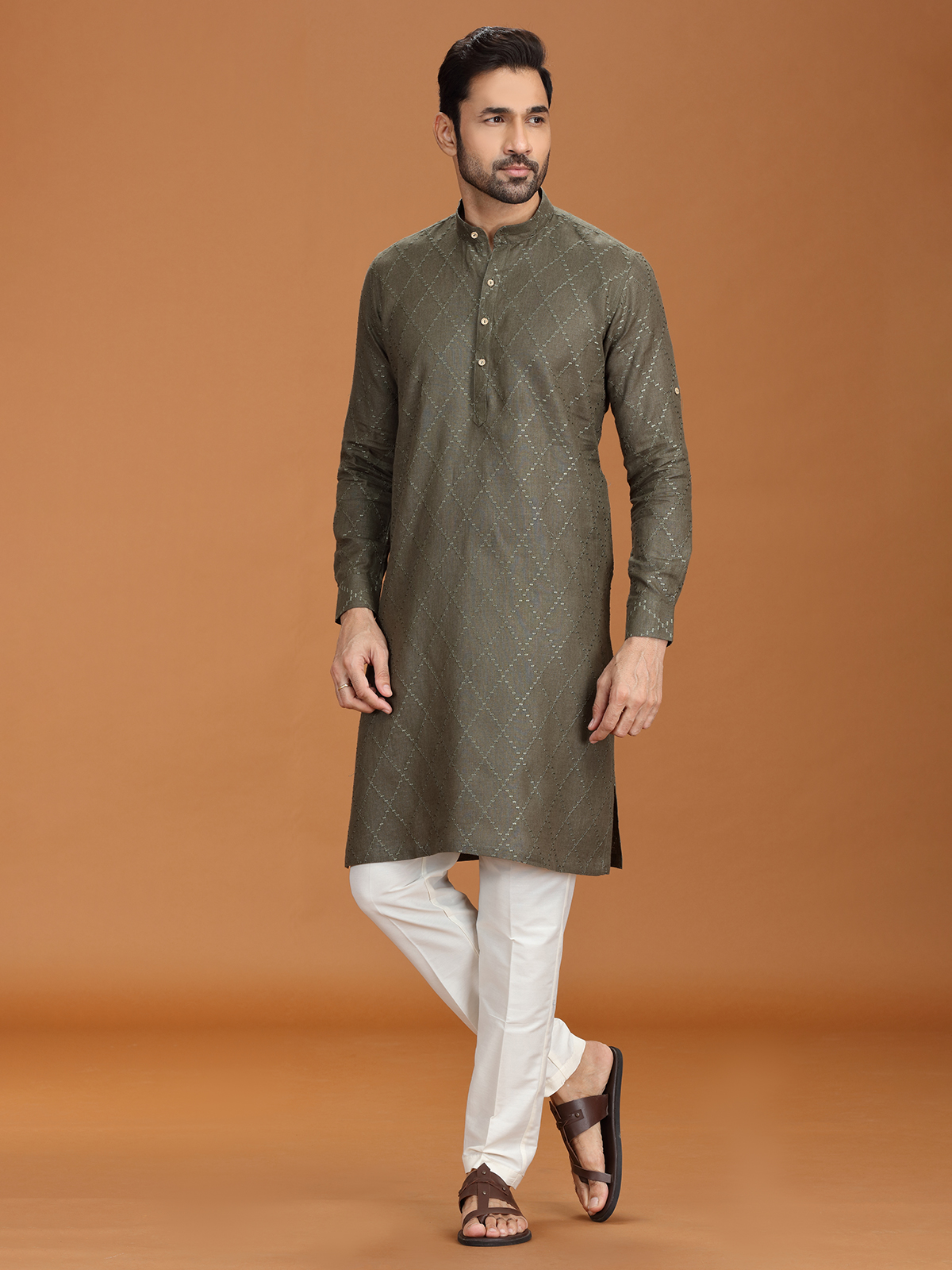 Sophisticated and earthy, this dark olive embroidered kurta set defines modern ethnic dressing. Crafted in smooth linen with elegant detailing and a structured Chinese collar, it effortlessly transitions from day to night celebrations. A smart choice for festive dinners, engagements, or cultural gatherings.
