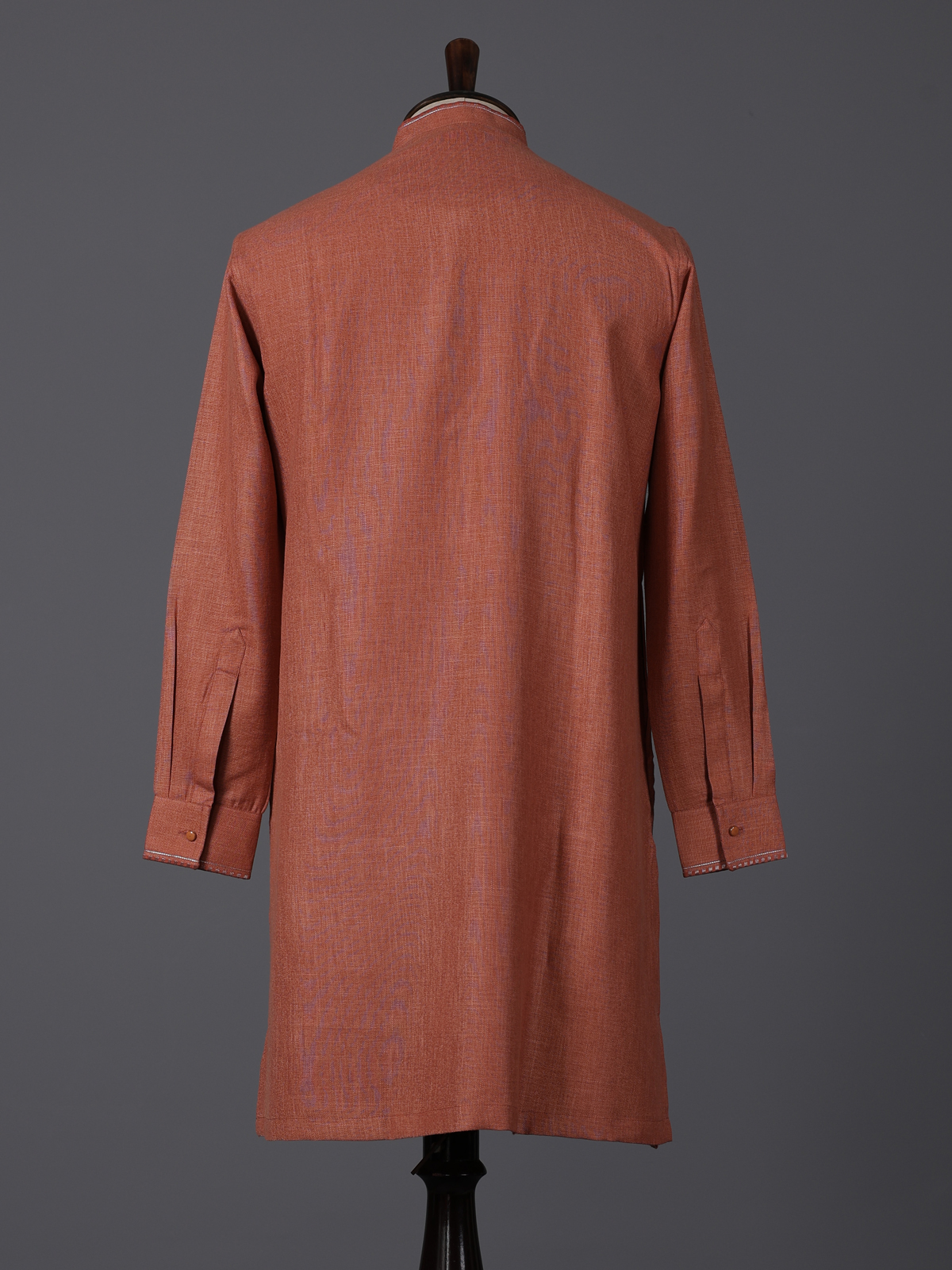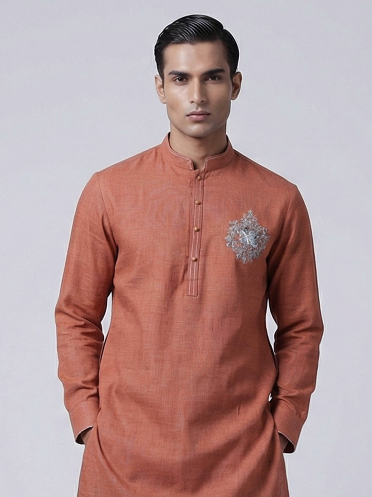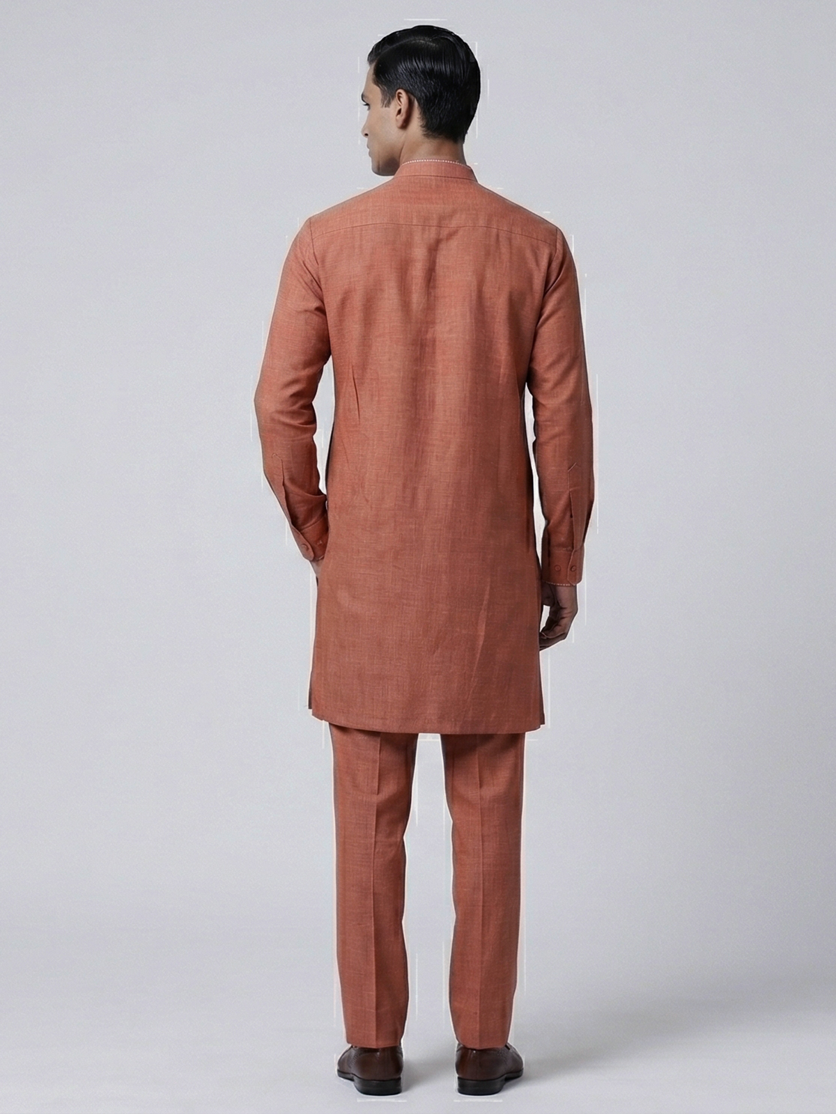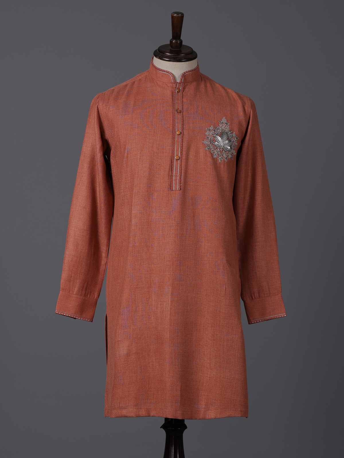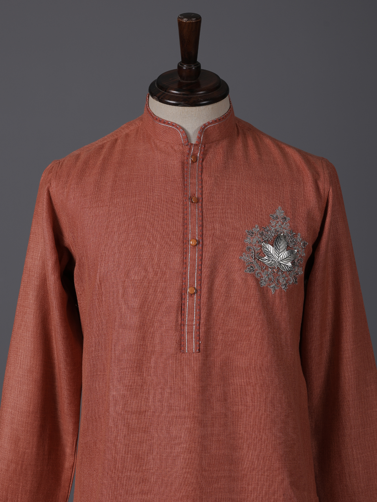 Warm dark peach tones enhance the charm of this linen kurta set designed for festive elegance. Adorned with thread and zardosi work, it reflects traditional artistry with a modern edge. The mandarin collar adds structure, while the statement brooch elevates its appeal. Paired with pants, this ensemble offers a refined and comfortable look for celebrations.