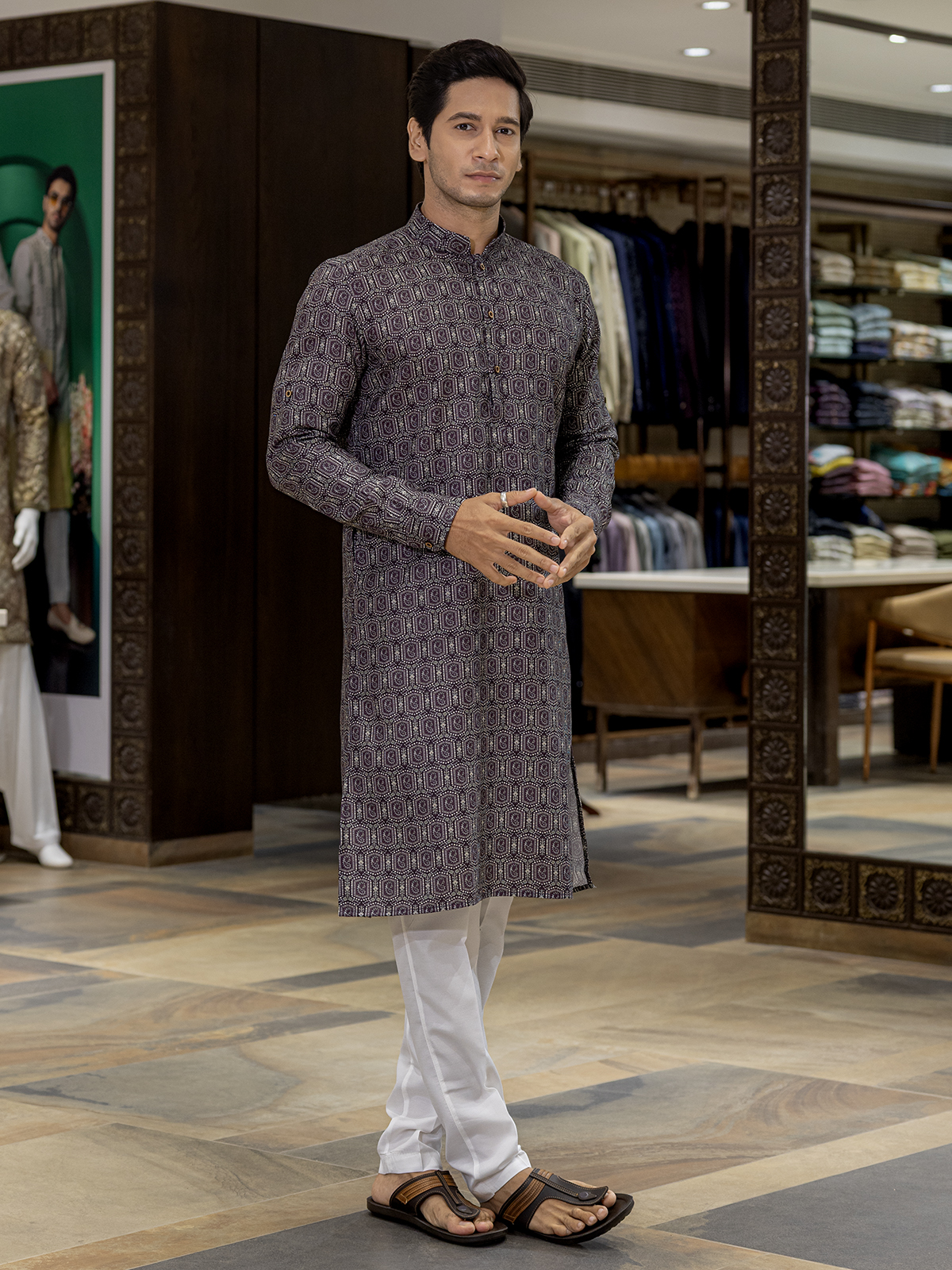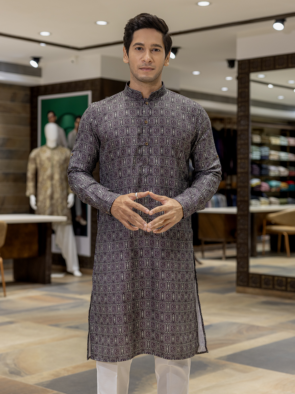 Regality in this dark purple cotton silk kurta pajama features full sleeves, and mandarin collar. The fabric is enhanced with a printed finish, radiating richness and ethnic artistry, making it an impeccable pick for festive celebrations. Paired with pant to complete your festive look.