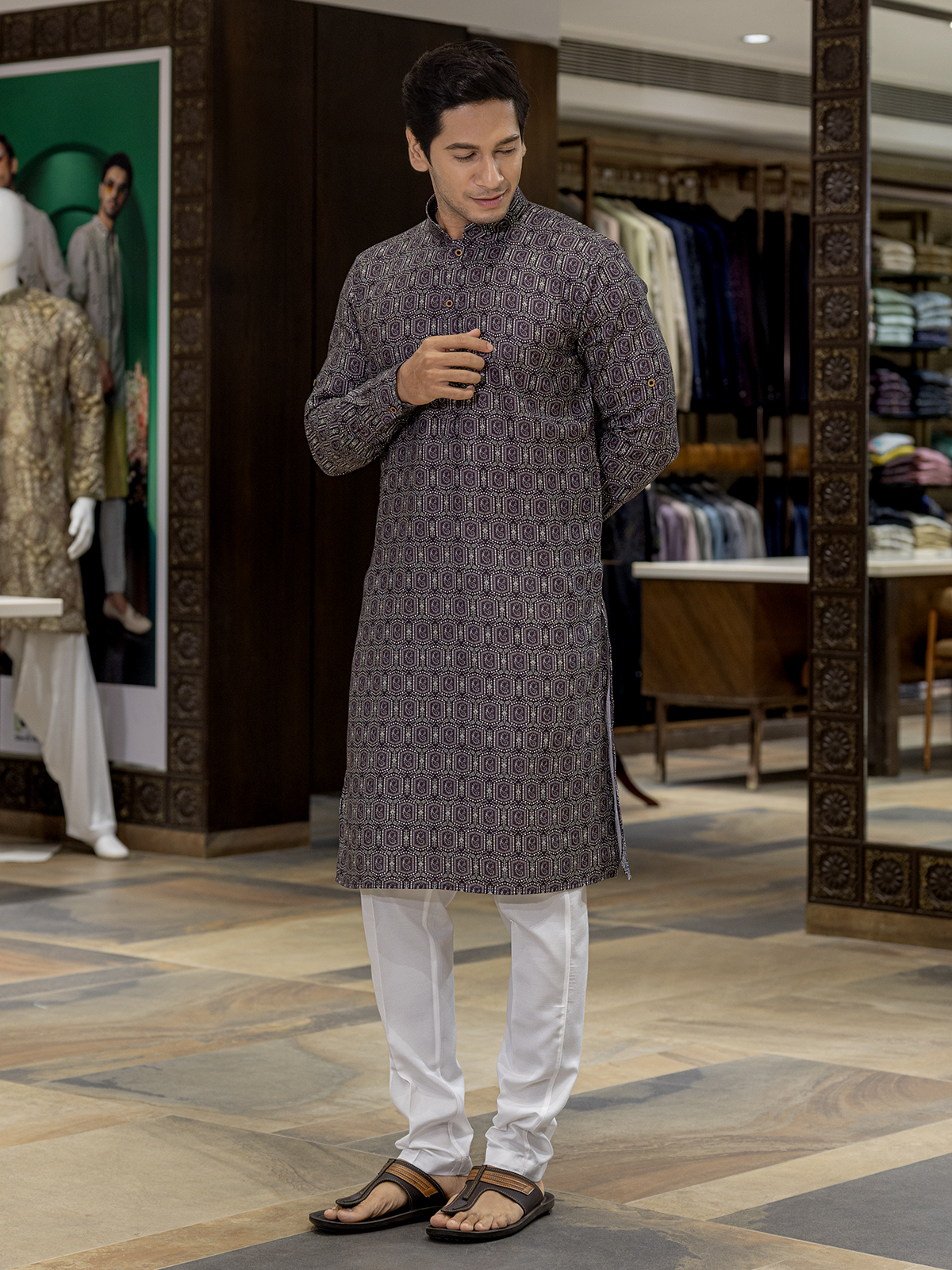 Dark Purple Printed Cotton Silk Kurta Pajama For Men