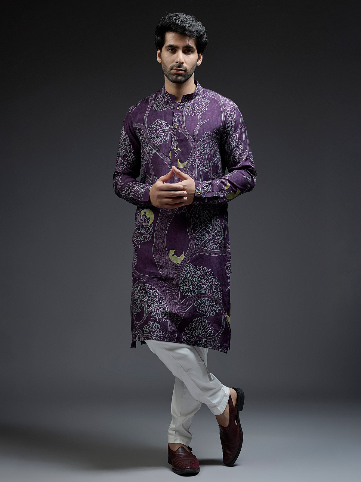 Dark Purple Tree Printed Silk Kurta Suit For Men