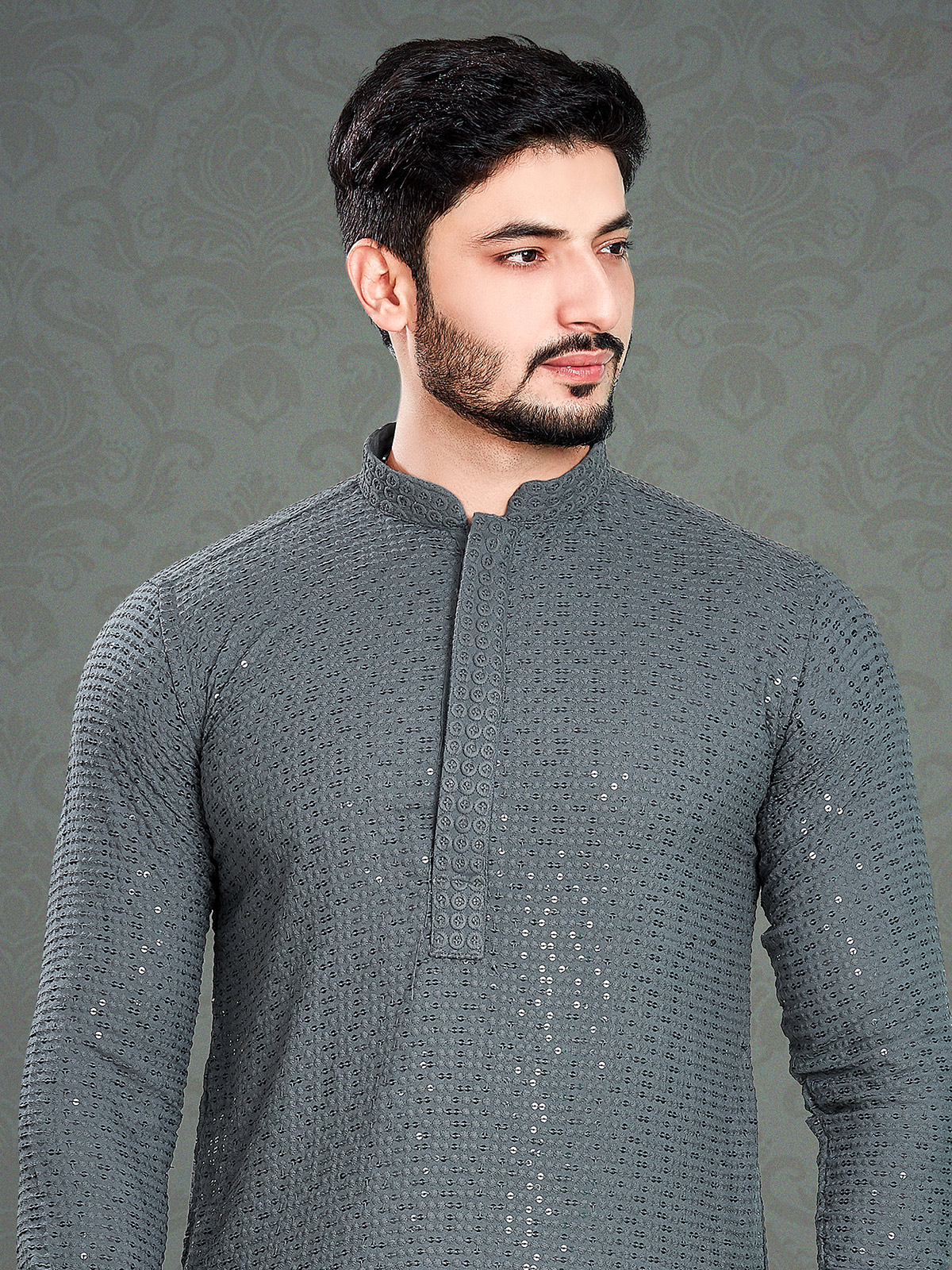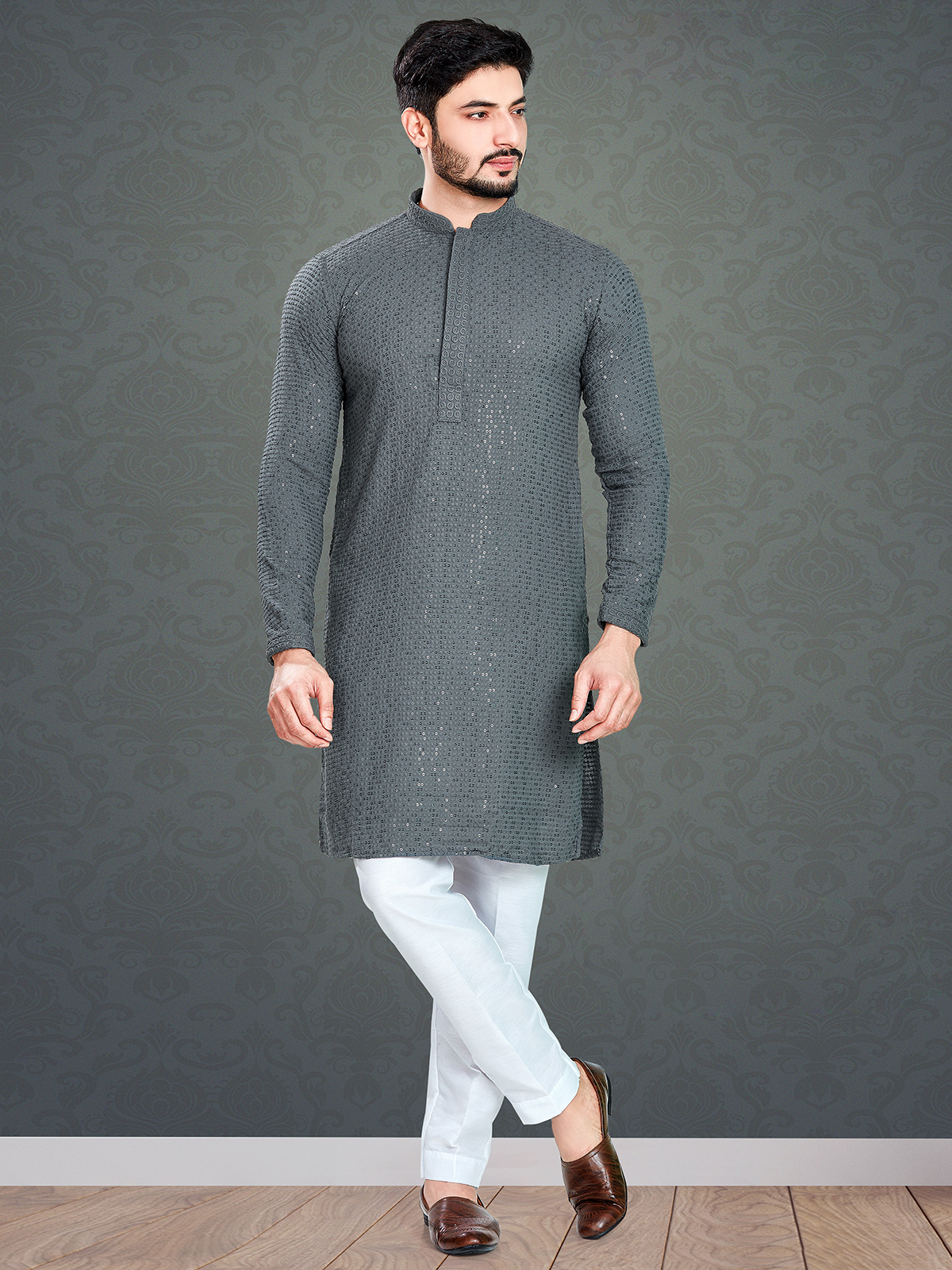 Elevate your fashion game with this striking grey cotton kurta suit. The full sleeves and mandarin collar exude sophistication, while the impeccable embroidery, resham and sequins work keep you feeling fabulous.