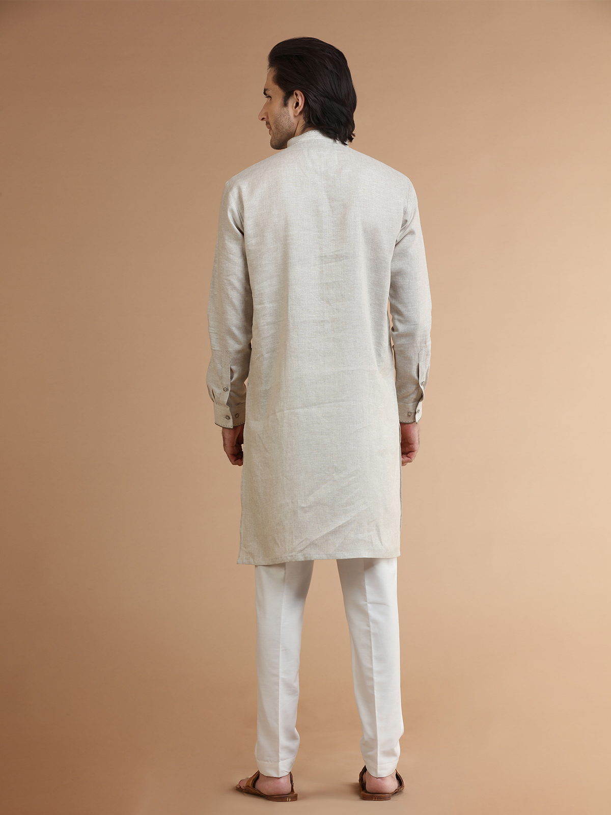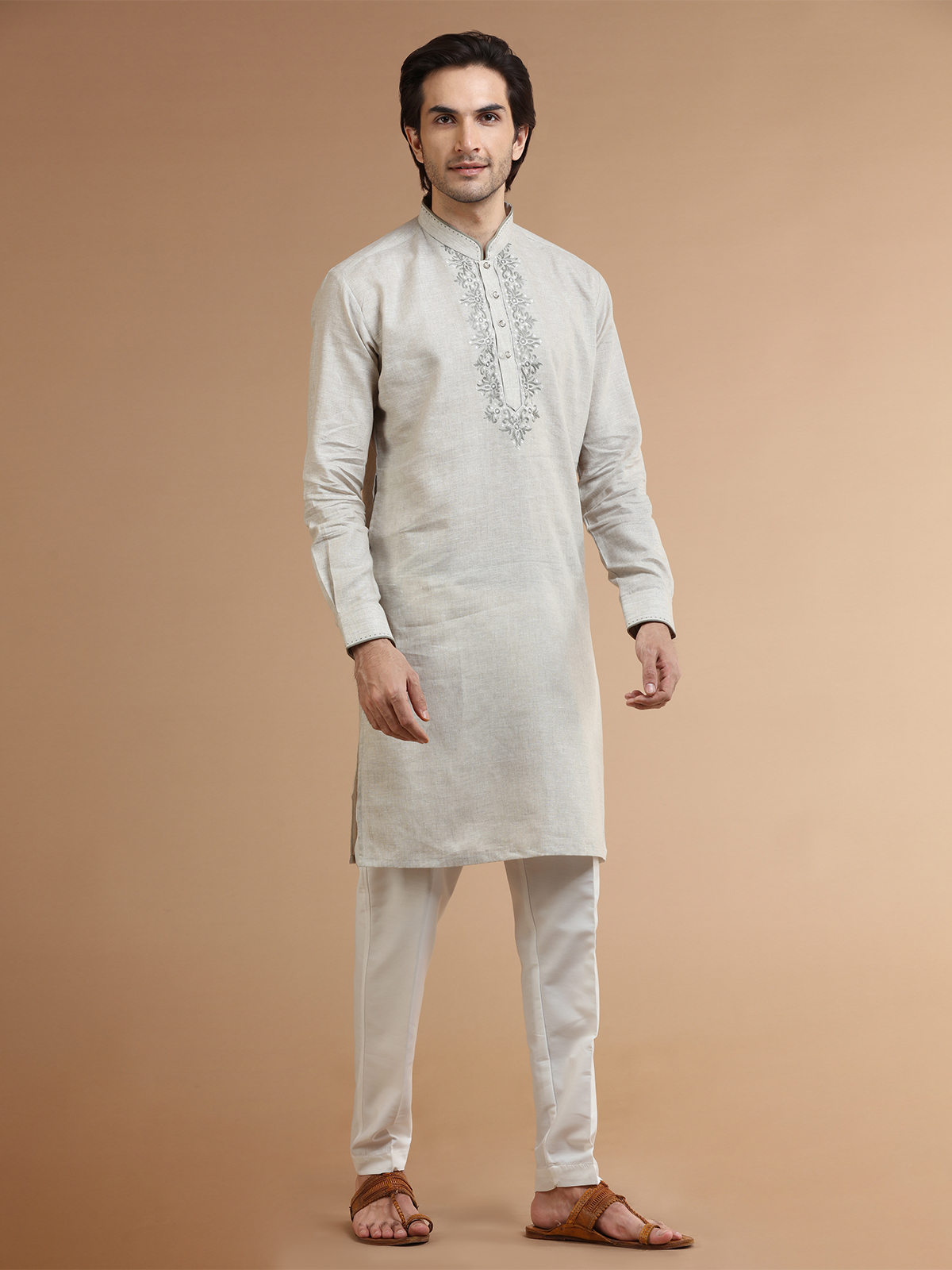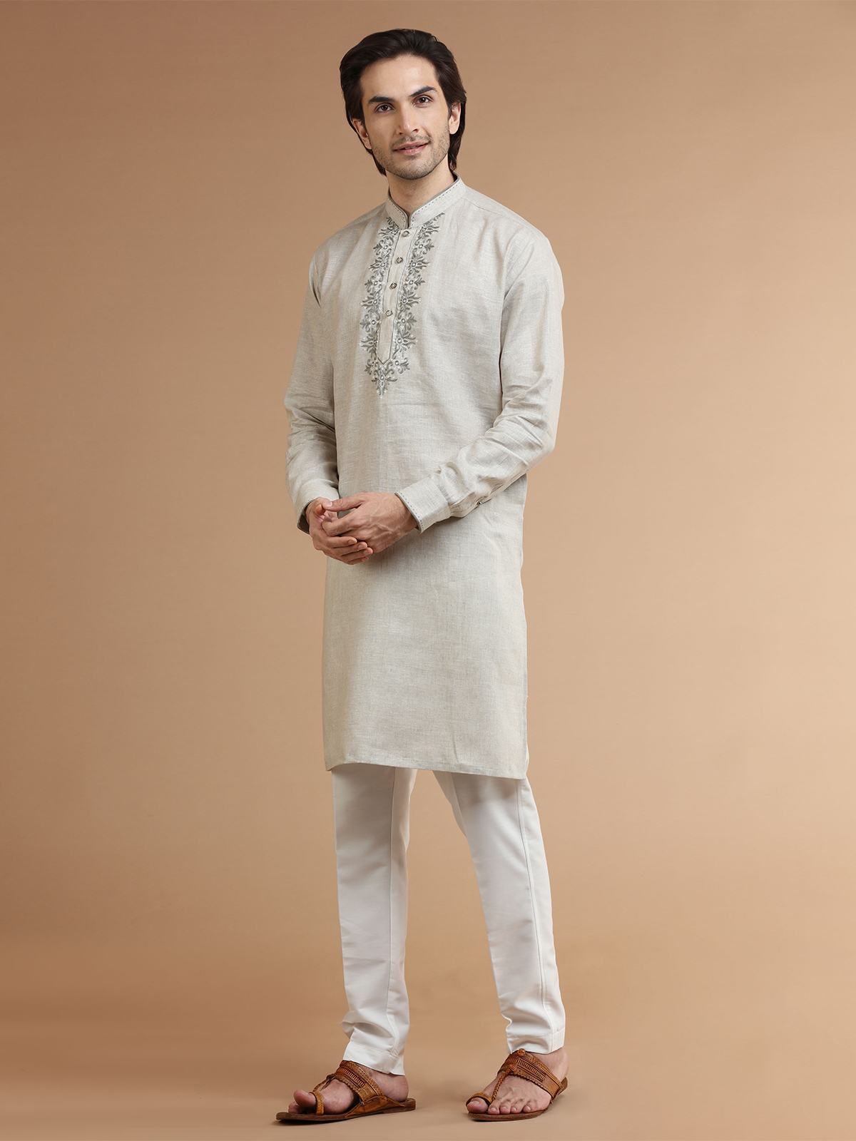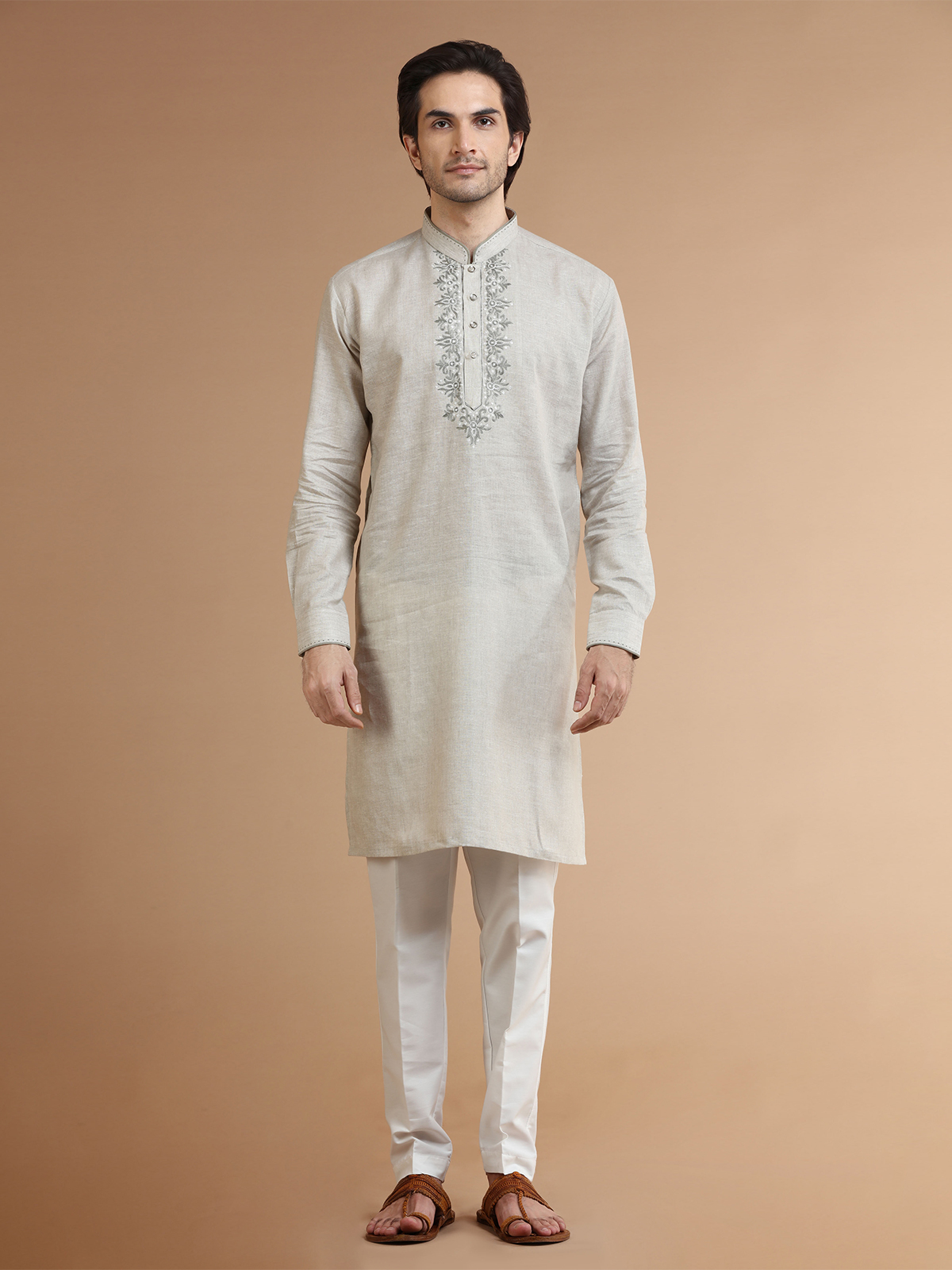 Experience timeless charm with our elegant beige linen kurta suit, perfect for any time of day or season. Tailored with exquisite embroidery work, this suit features a classic mandarin collar, full sleeves, and a flattering silhouette. Complete with a coordinating bottom, it is sure to earn you compliments wherever you go.