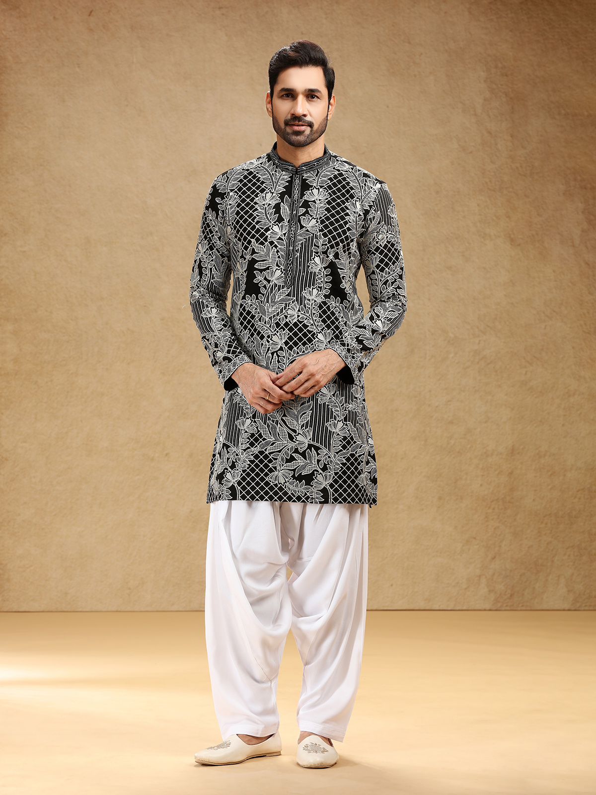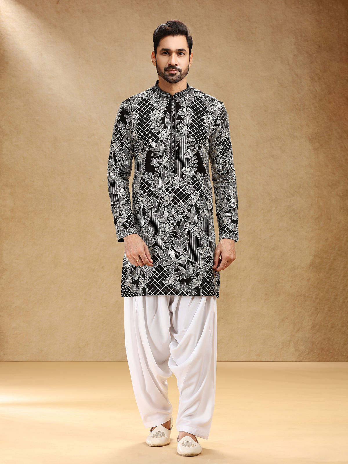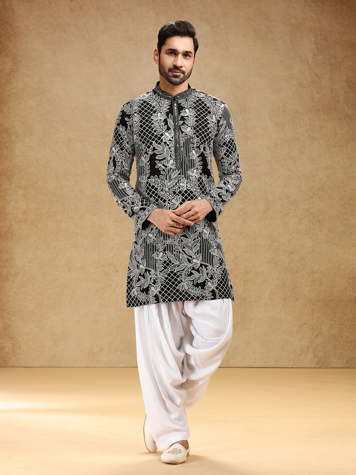 In majestic black georgette, this kurta suit glistens with exquisite resham and sequins work that heightens its royal elegance. The stand collar and full sleeves enhance its poised silhouette, finished with refined pants. The opulent wine hue radiates depth and sophistication, perfect for wedding festivities or evening occasions that celebrate grandeur and charm.