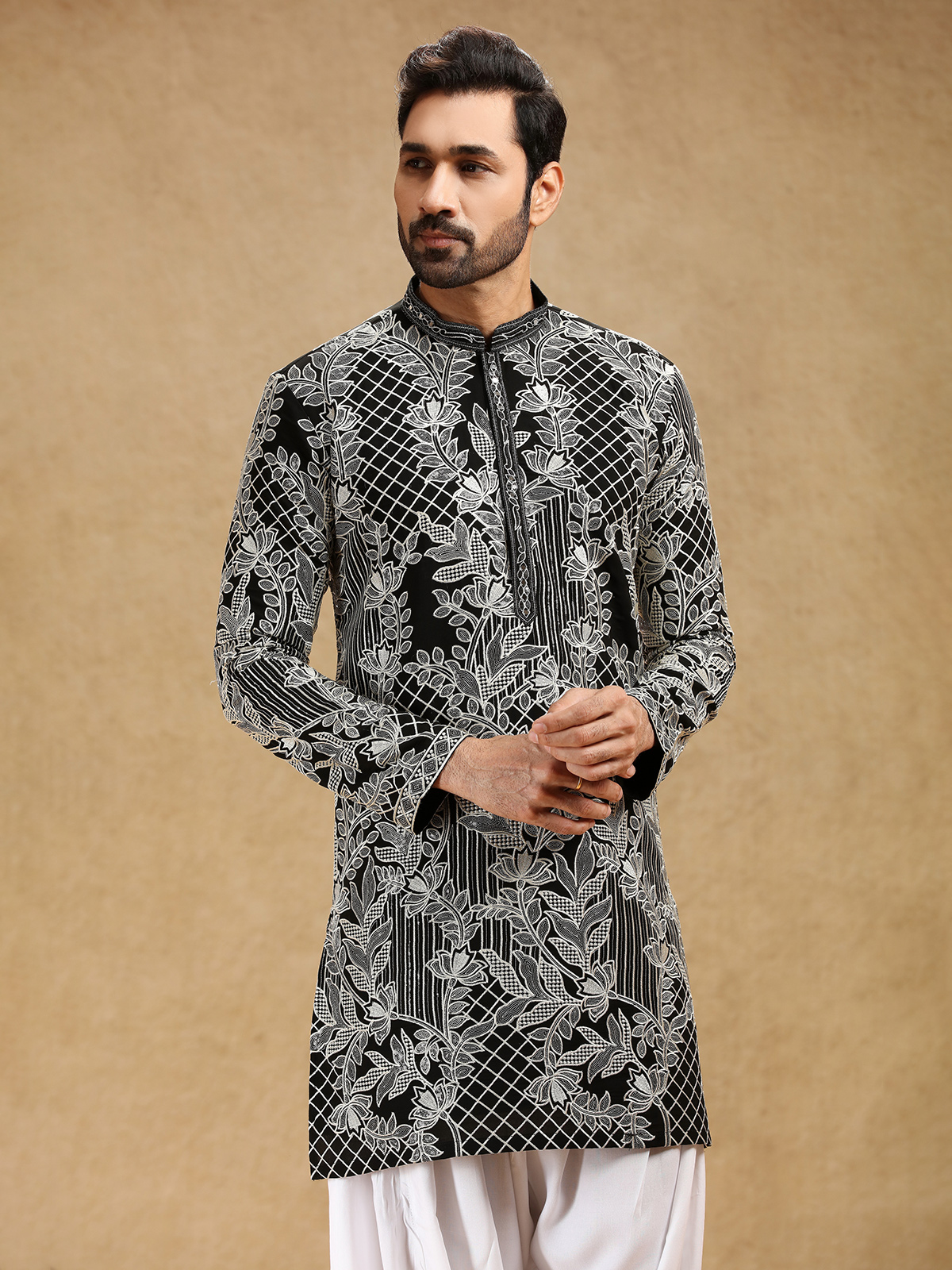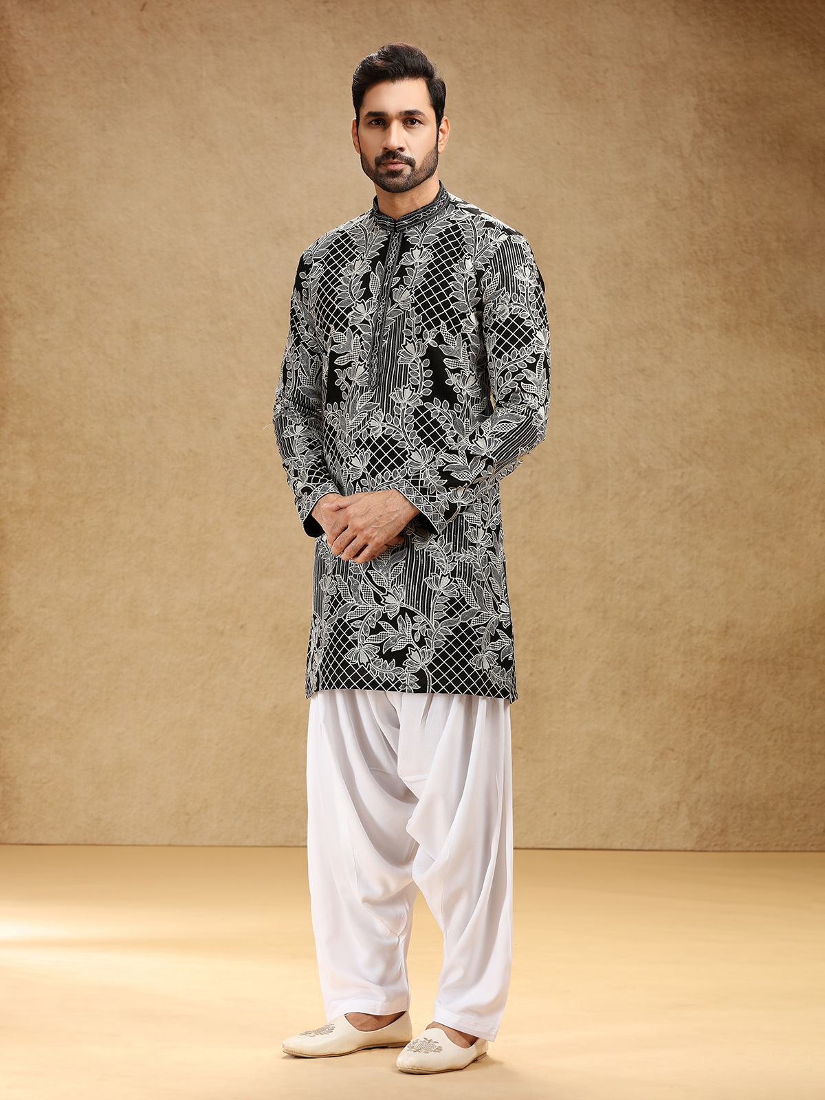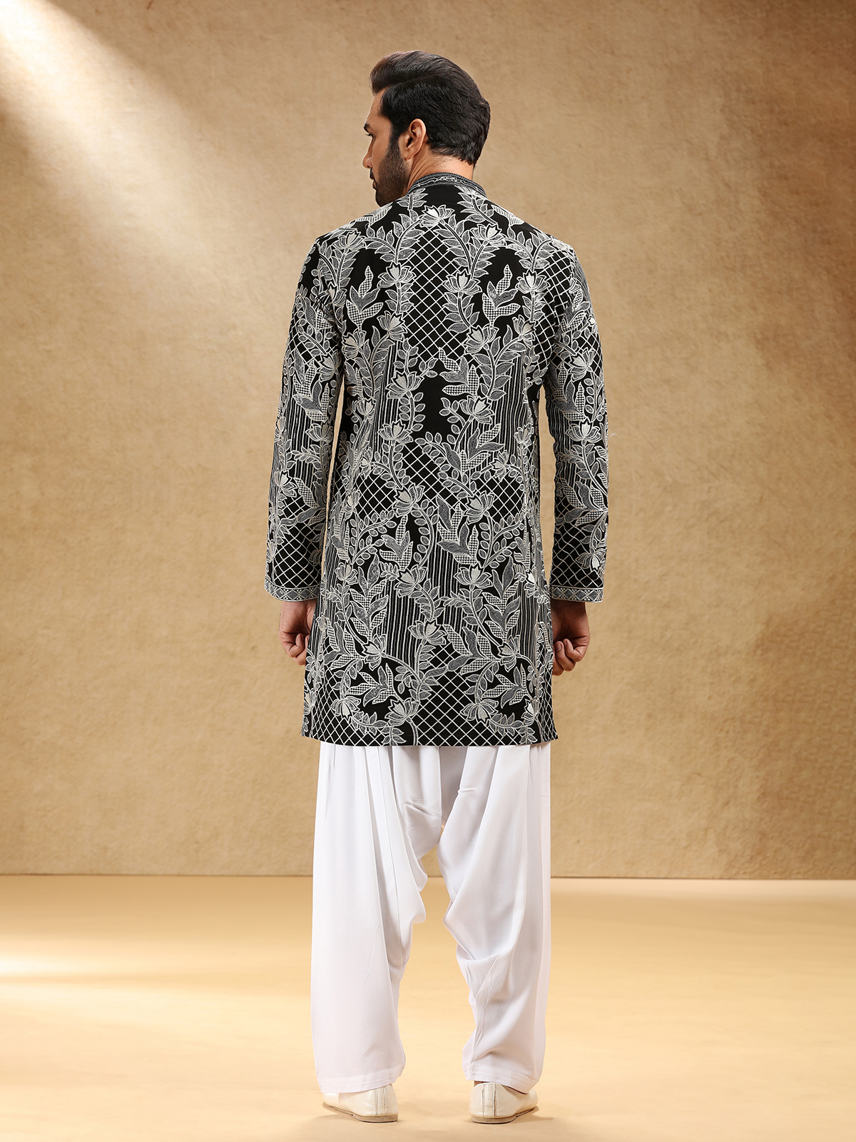 In majestic black georgette, this kurta suit glistens with exquisite resham and sequins work that heightens its royal elegance. The stand collar and full sleeves enhance its poised silhouette, finished with refined pants. The opulent wine hue radiates depth and sophistication, perfect for wedding festivities or evening occasions that celebrate grandeur and charm.