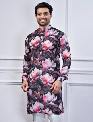 Add richness to your wardrobe with this black printed cotton kurta suit. Crafted with thread work and styled with a mandarin collar and full sleeves. Comes with a bottom.