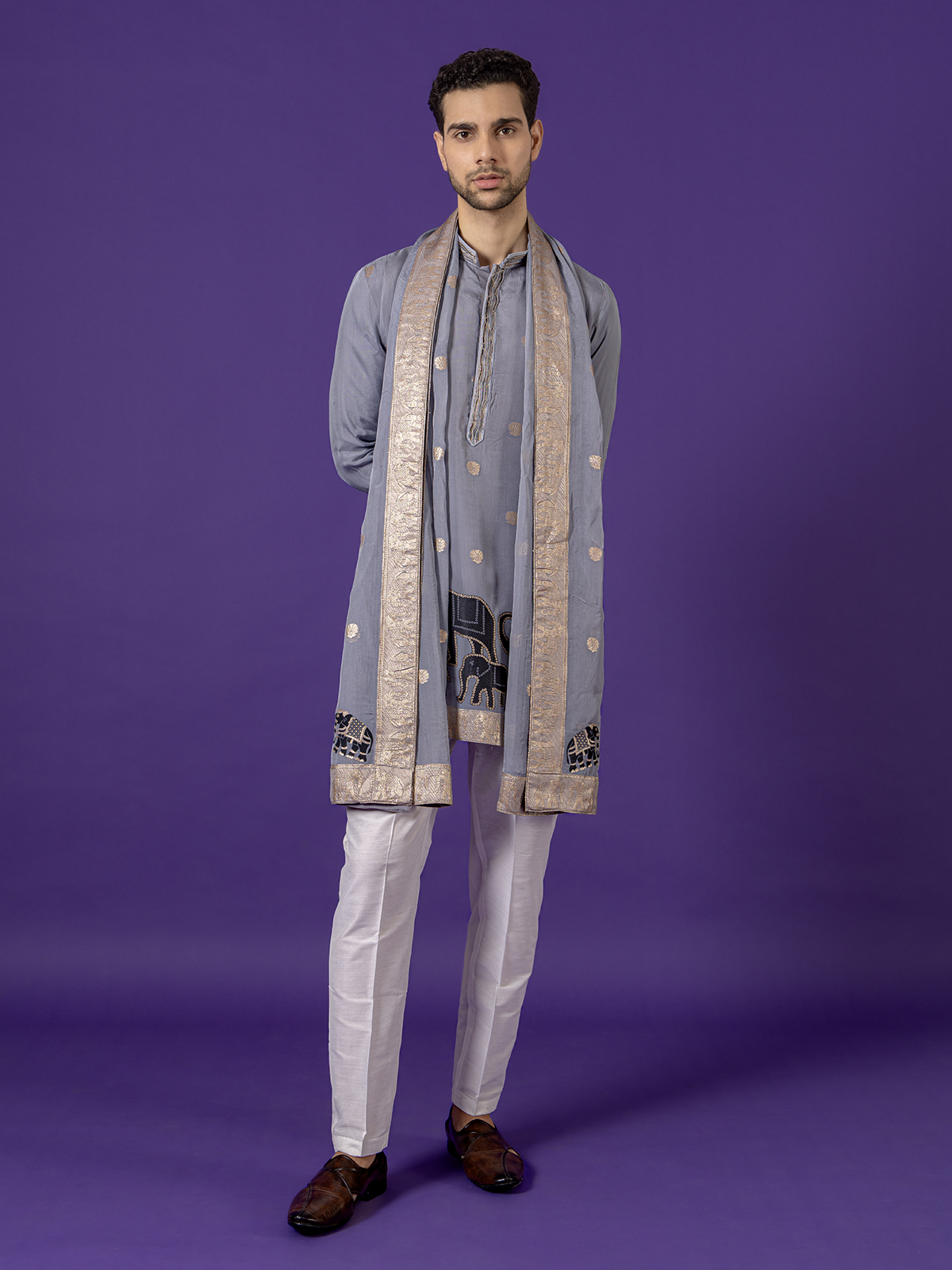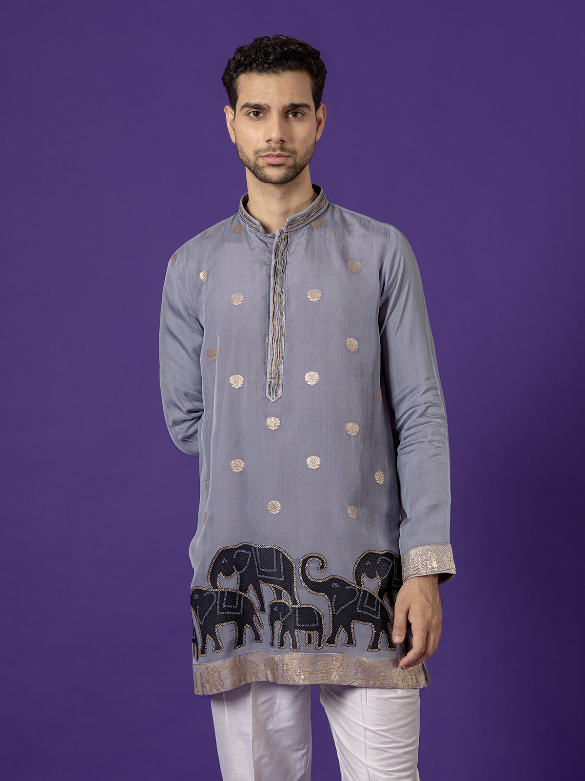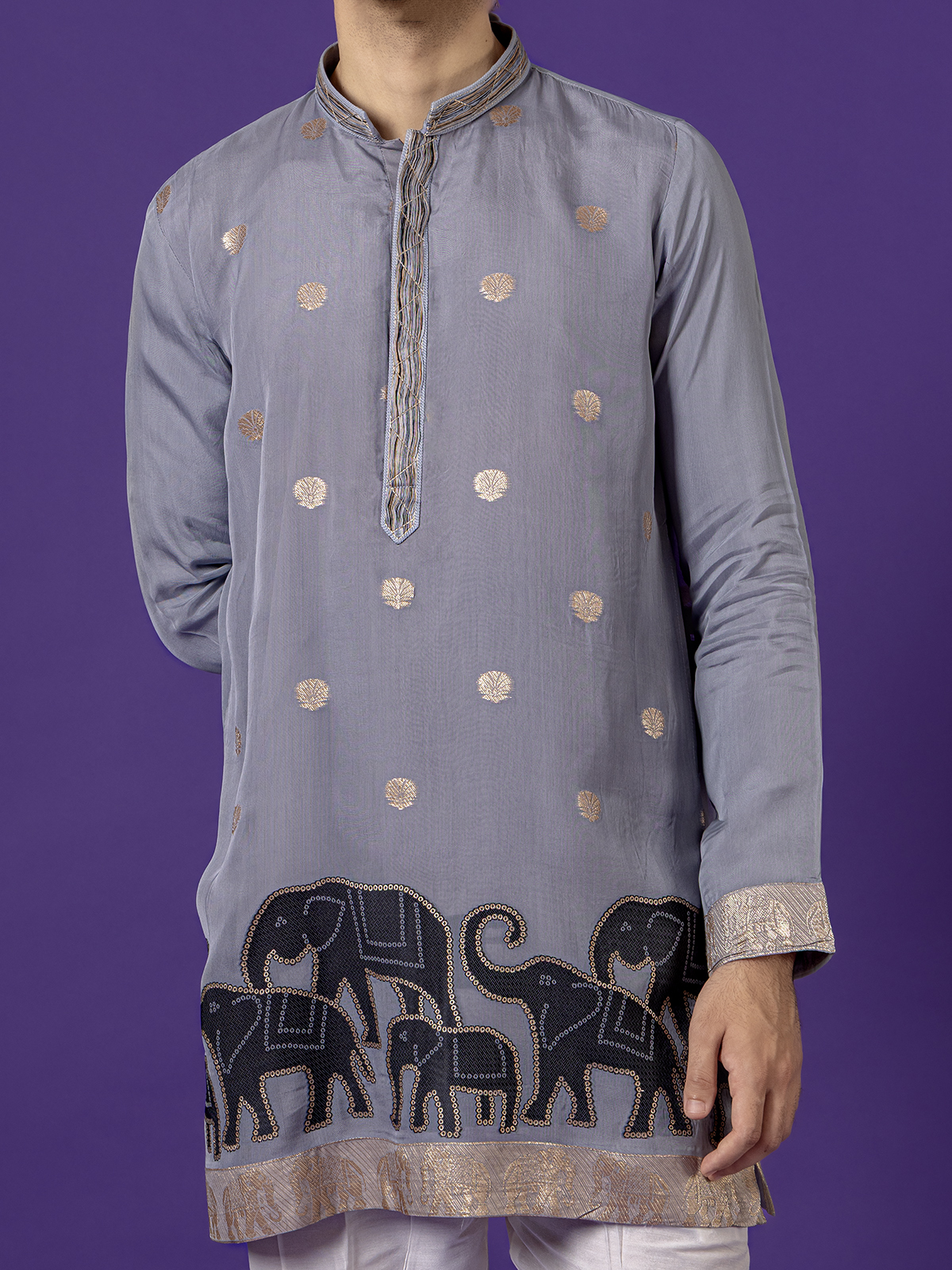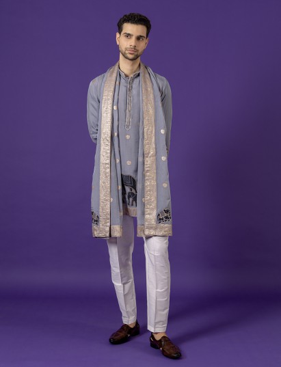 Showcasing understated elegance, this grey cotton silk kurta pajama set blends comfort with festive charm. Designed with a Chinese collar and full sleeves, it features intricate zari work for a subtle shimmer. Paired with coordinated pants, it’s ideal for festive gatherings and Eid celebrations.