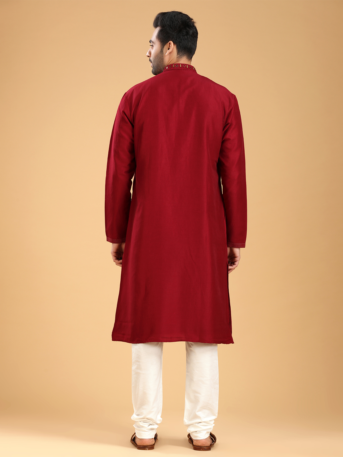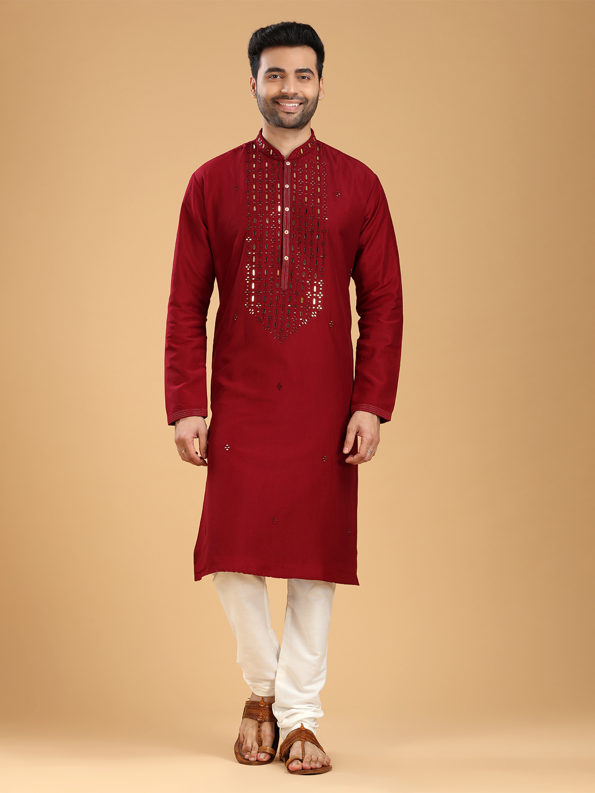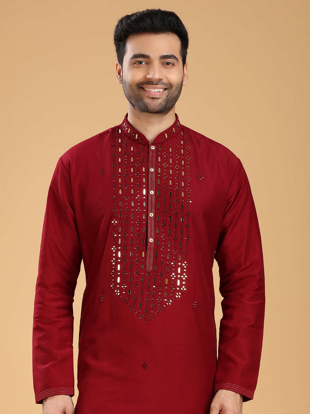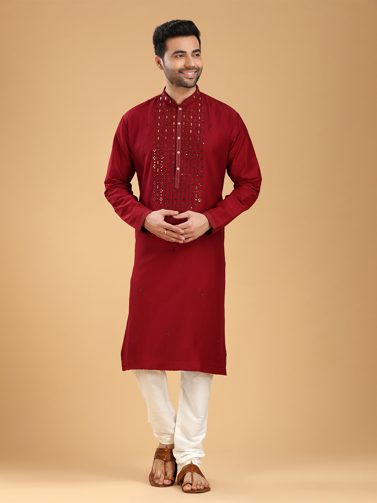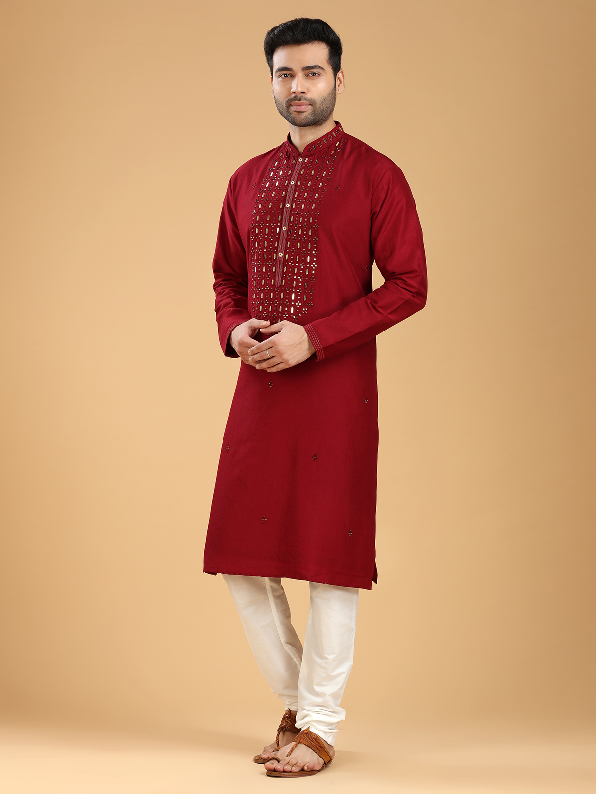 Make a style statement with this elegant maroon cotton kurta suit for men. Crafted with mirror and resham work, it features a mandarin collar and full sleeves. The set comes with a bottom.