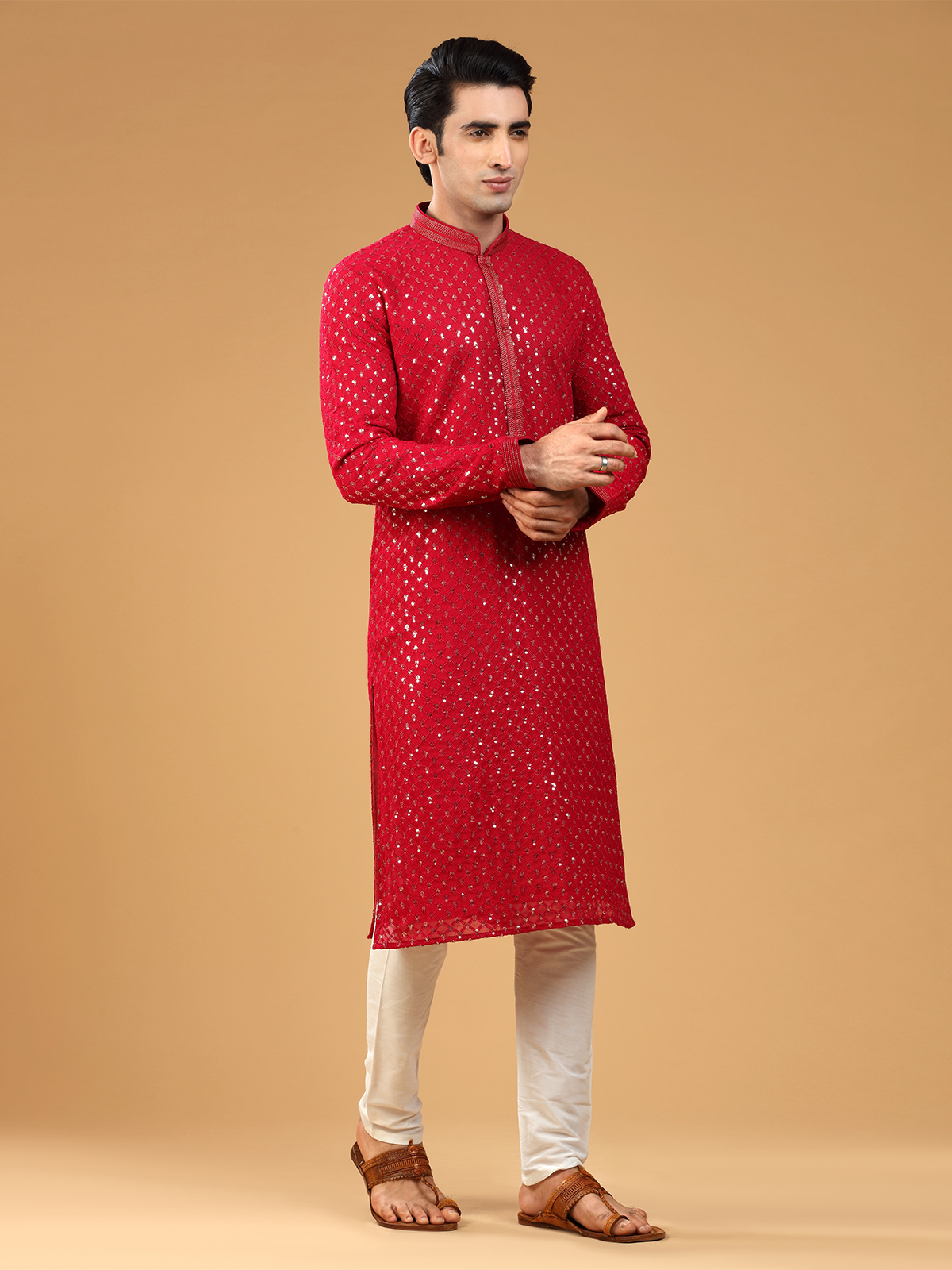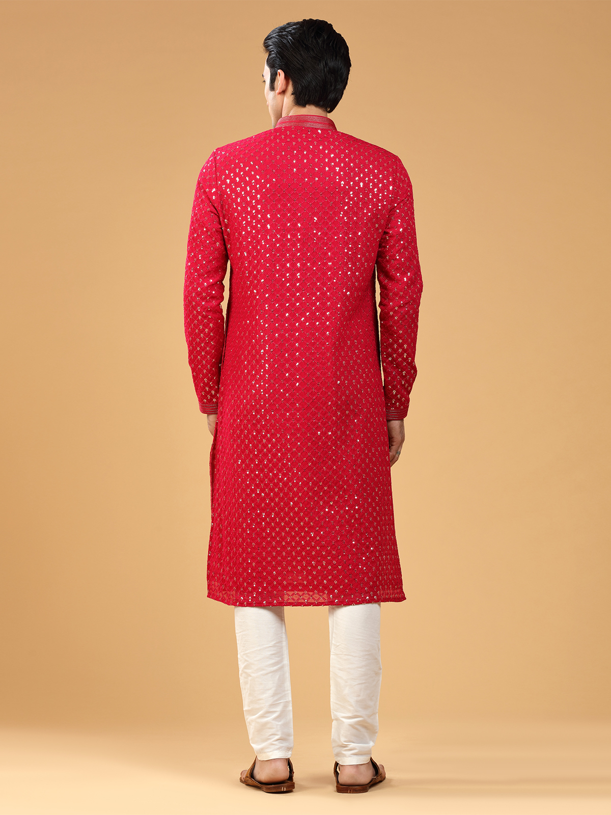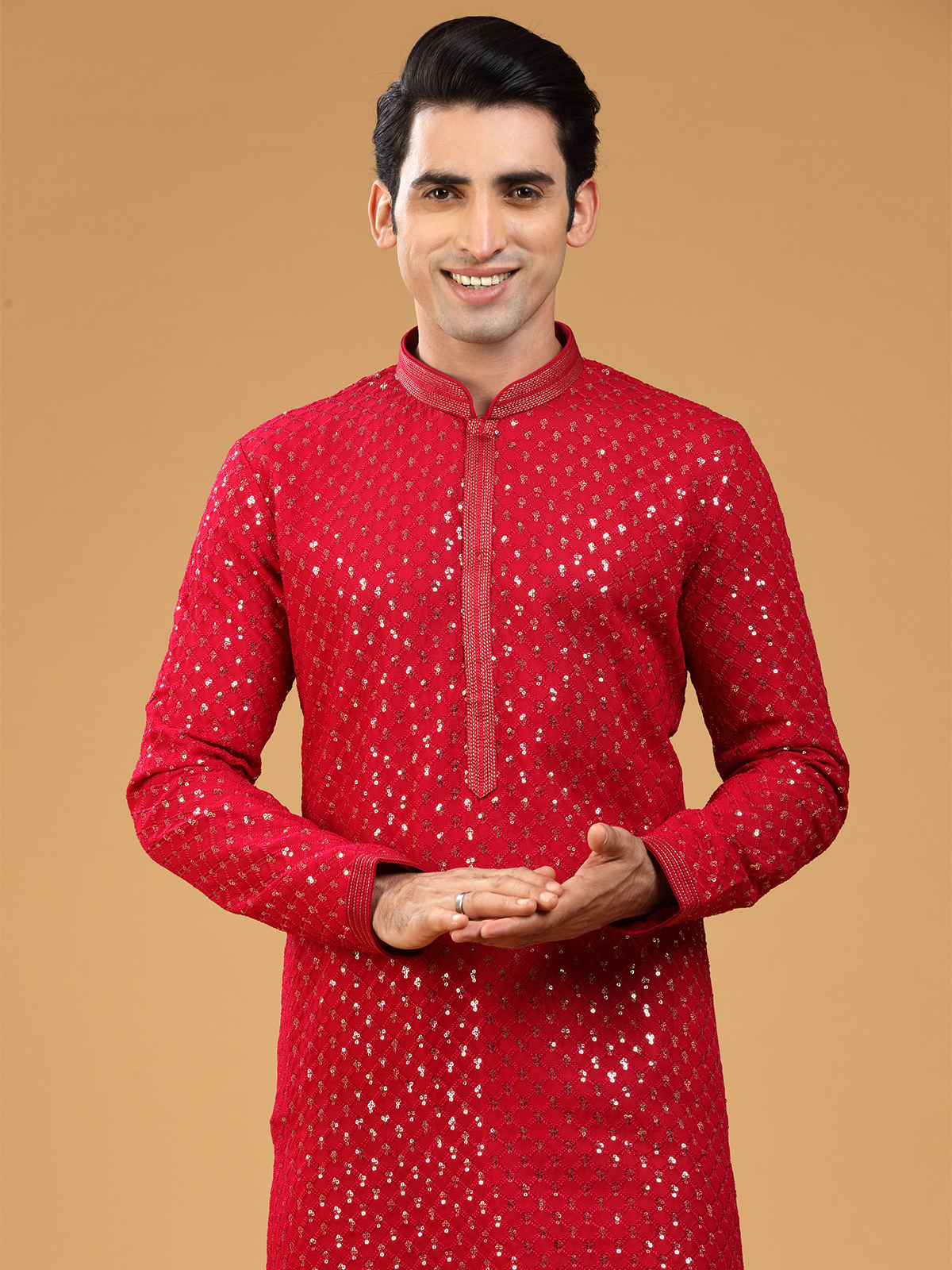 This elegant red georgette kurta suit, featuring sequins and resham work, is perfect for the festive season. It has a mandarin collar and full sleeves, and comes with a bottom to complete the outfit.