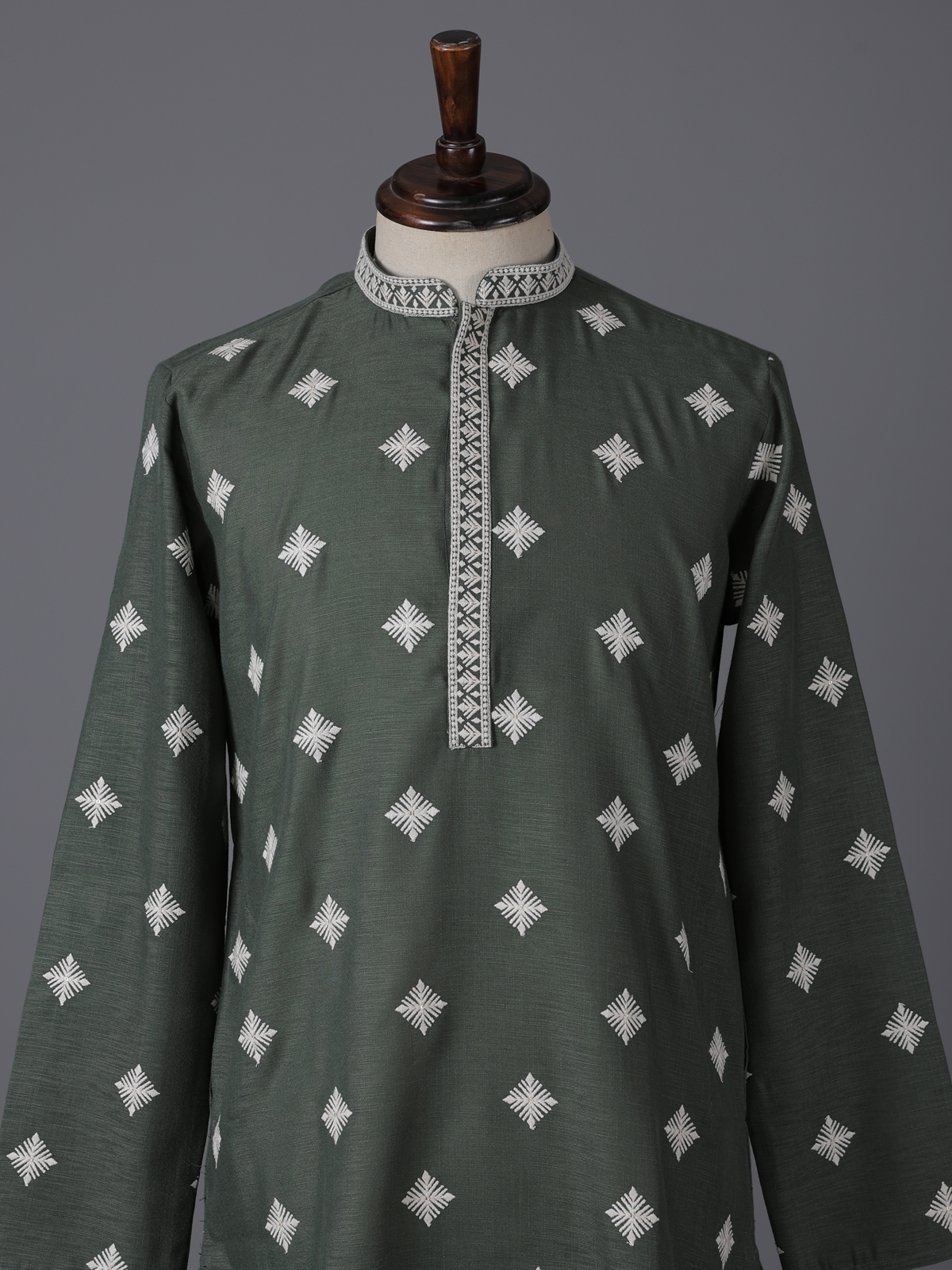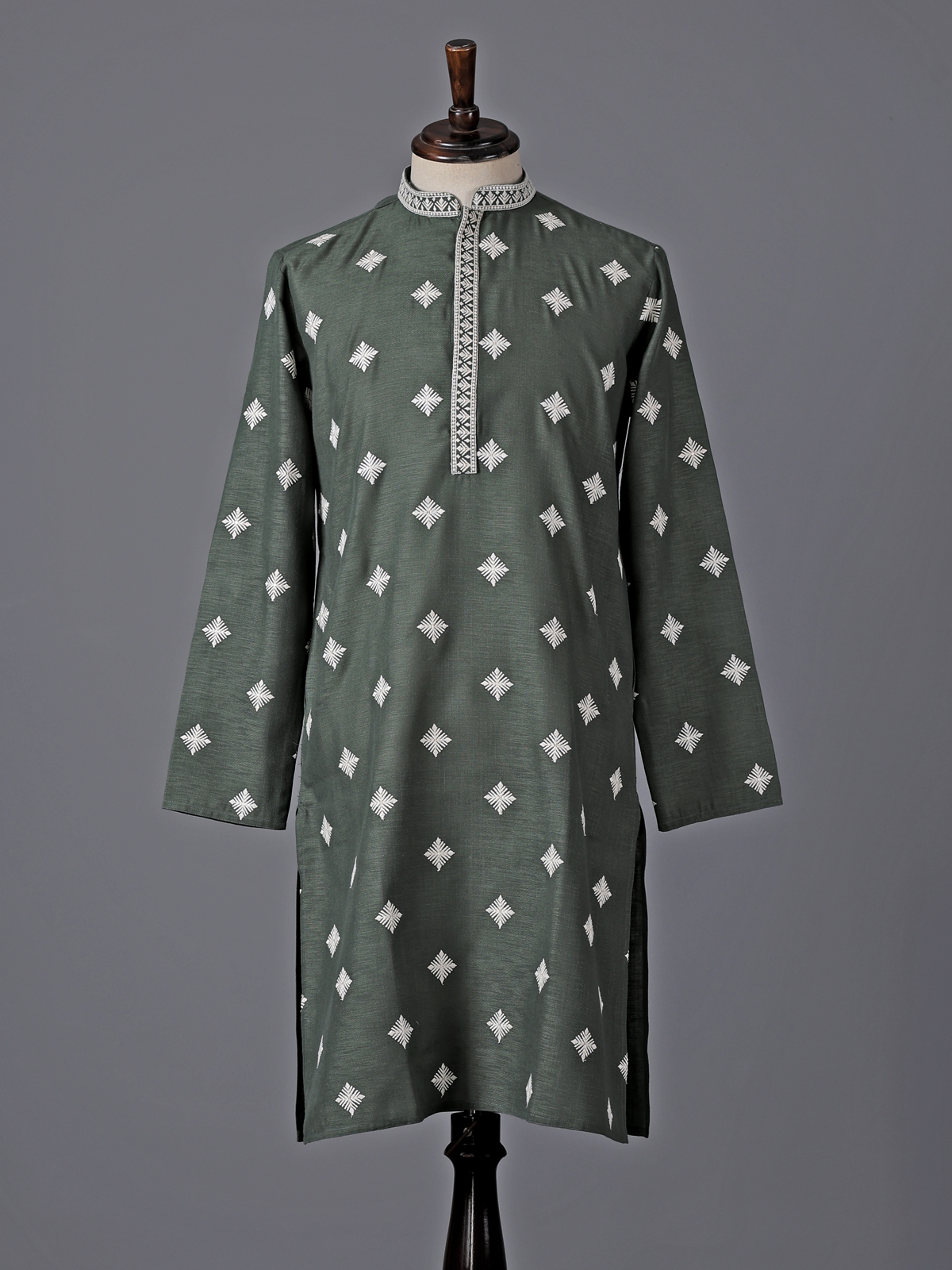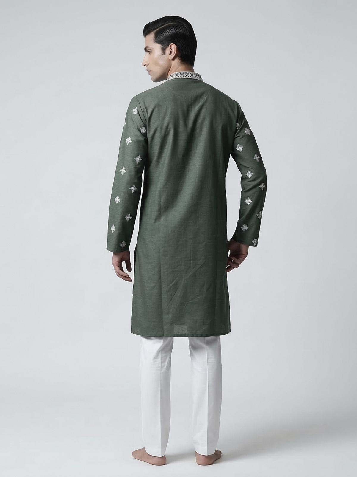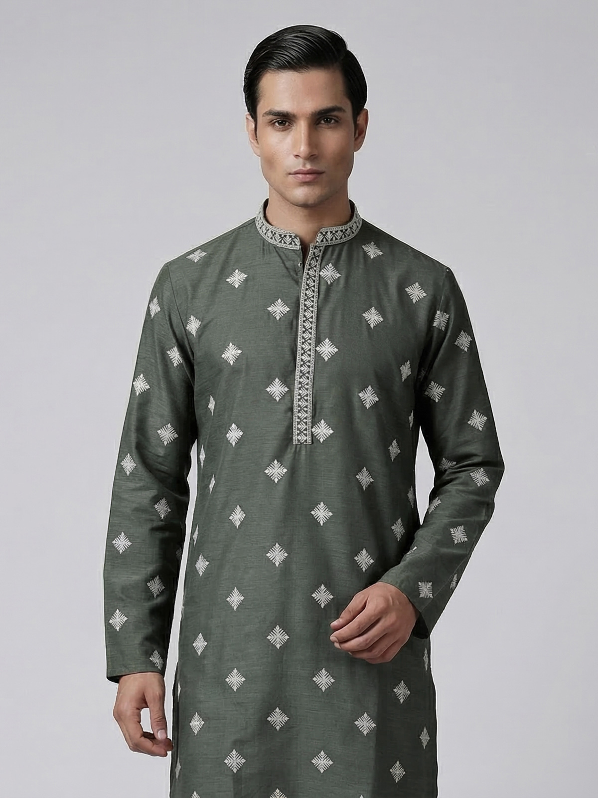 Graceful and refreshing sea green silk kurta suit. Reflects refined festive elegance. Designed with a classic mandarin collar, the kurta is adorned with delicate embroidery and shimmering sequins that add a subtle celebratory glow. Crafted from rich silk fabric and paired with tailored pants, the ensemble creates a sophisticated silhouette, making it a perfect choice for eid festivities, mehendi functions and joyous celebrations.
