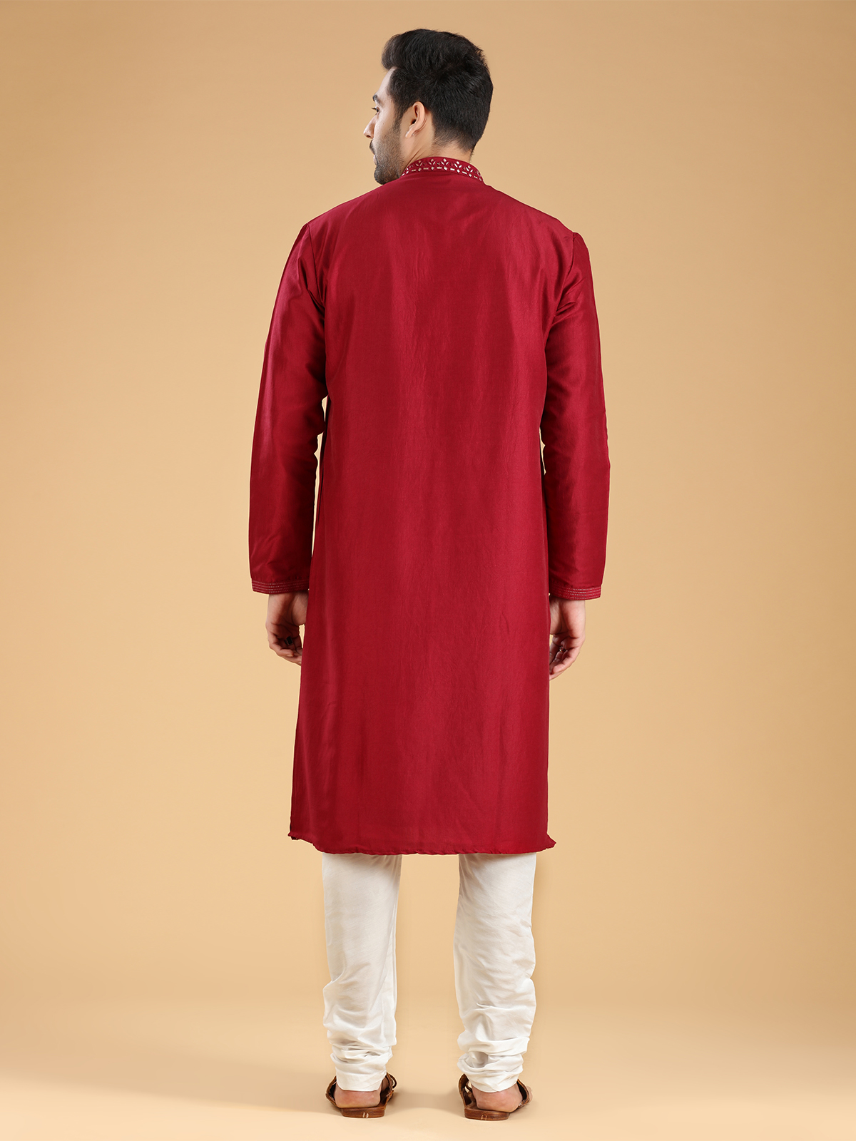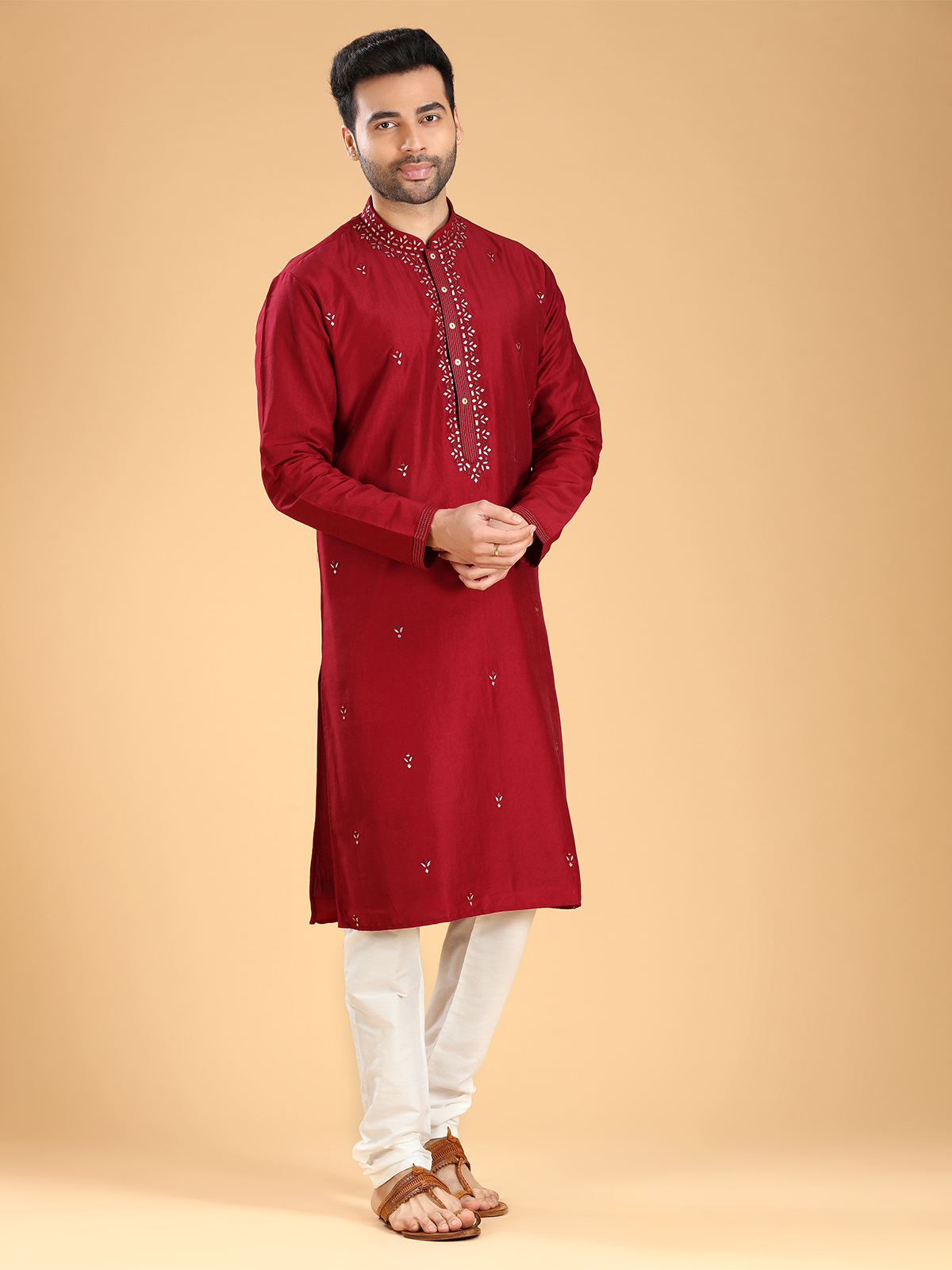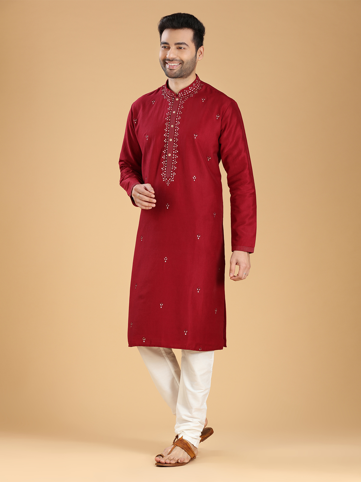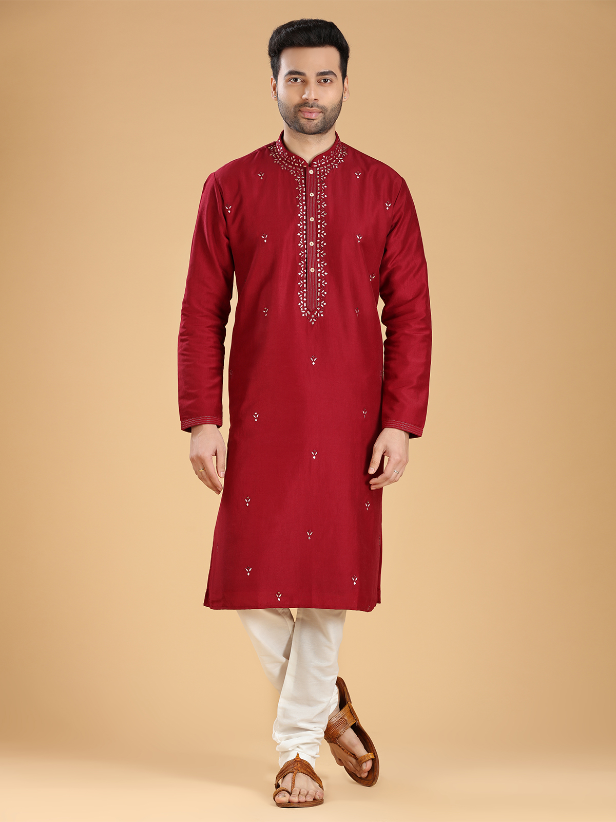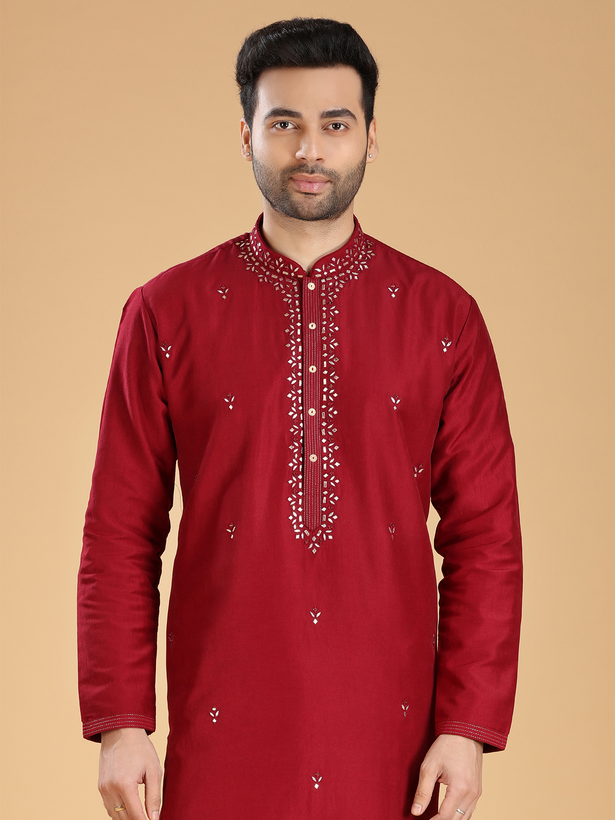 Upgrade your festive wardrobe with this trendy maroon silk kurta suit. The intricate mirror, aabla, and resham work adds a touch of elegance to its design. Featuring a mandarin collar and full sleeves, it is perfect for any festive occasion. Comes with a bottom.