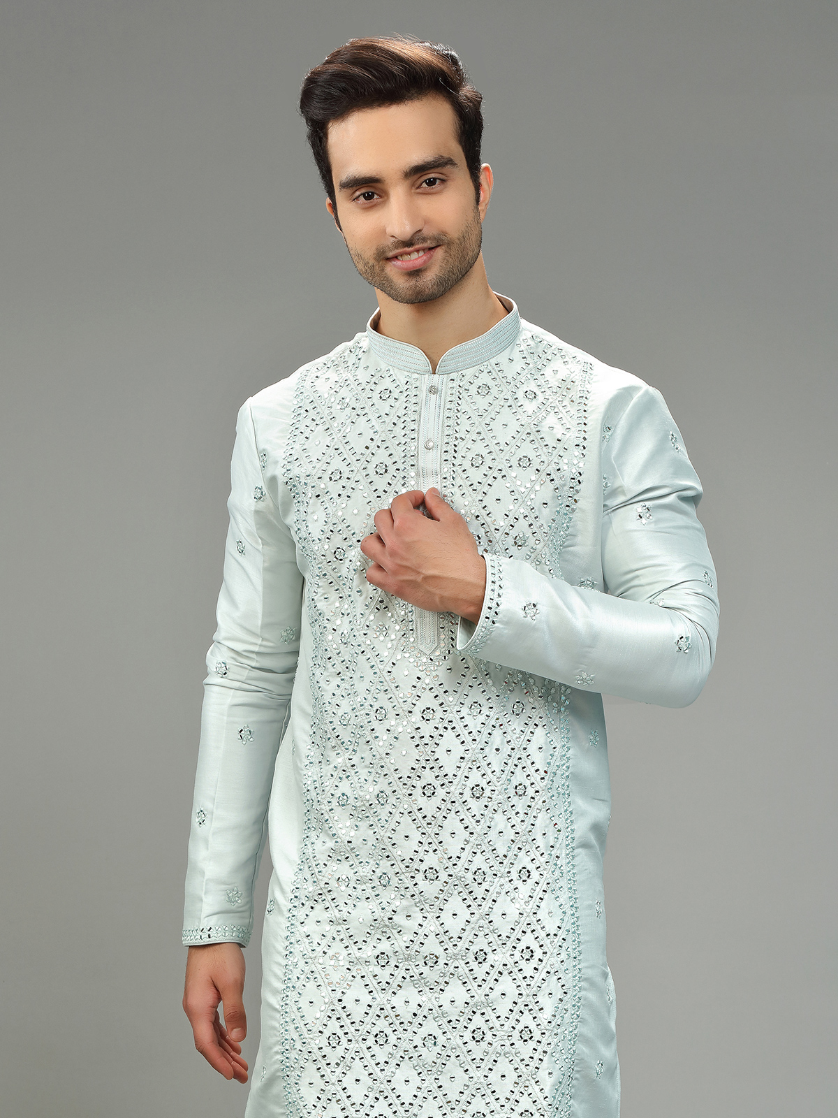 Shine bright during festivities with this rich light blue silk kurta suit. The exquisite embroidery, resham and mirror work, mandarin collar, and full sleeves enhance its beauty. Embrace the complete look with the included bottom.