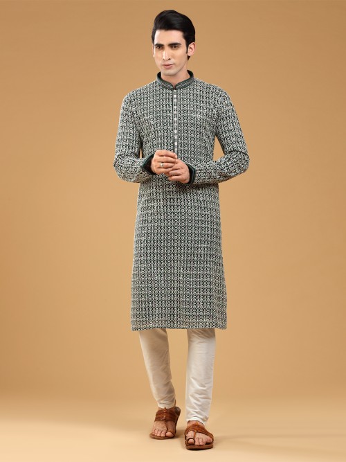Add tradition and style to your festive wardrobe with this dark green georgette kurta suit. Intricate embroidery, resham and sequins work, mandarin collar and full sleeves make it a perfect choice. Comes with a bottom.