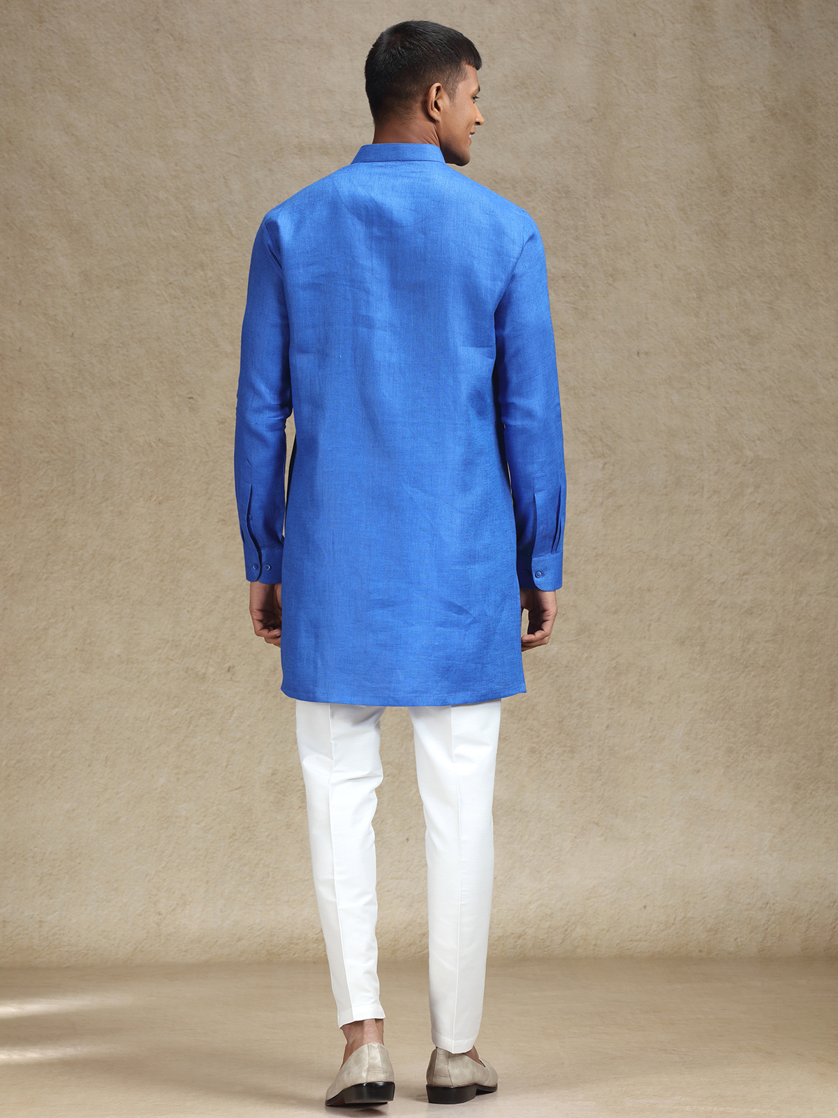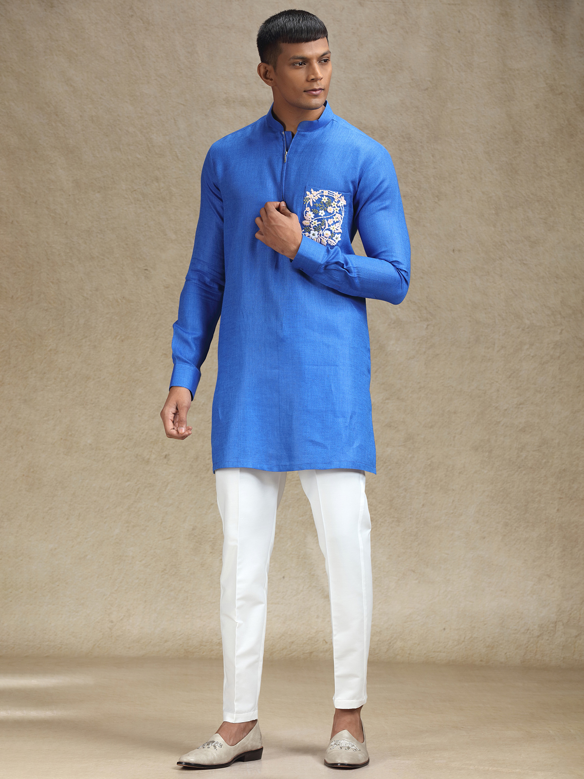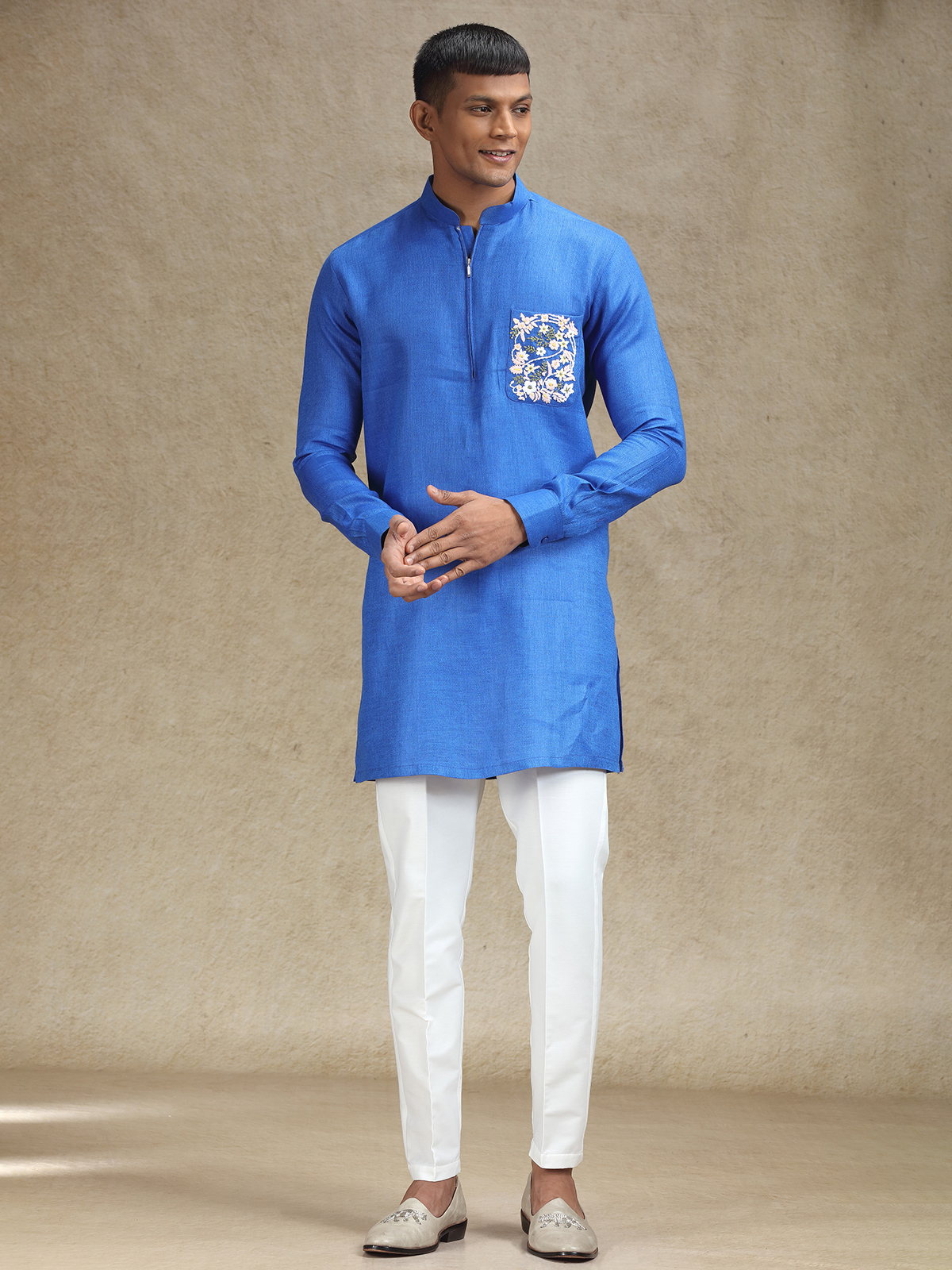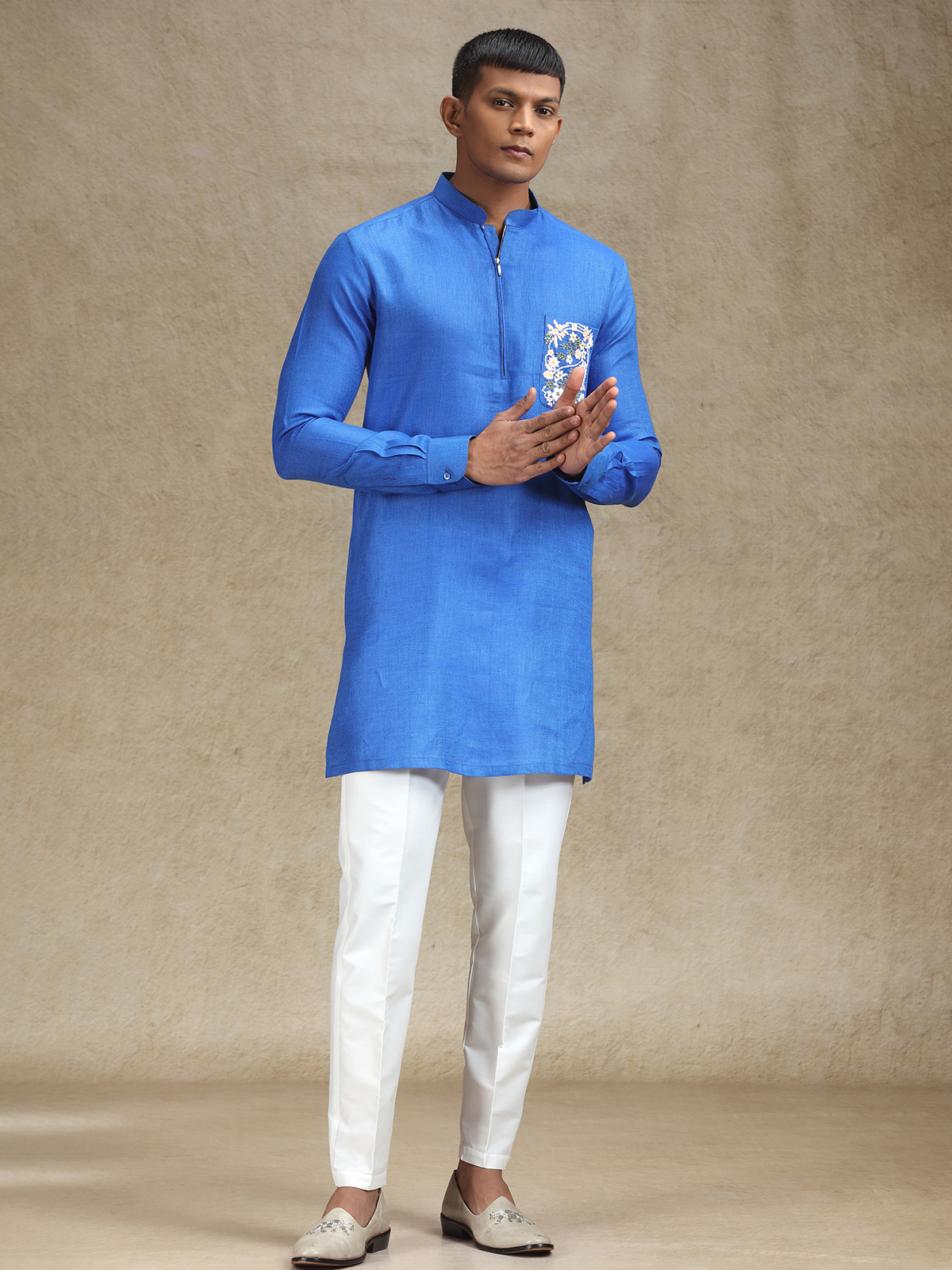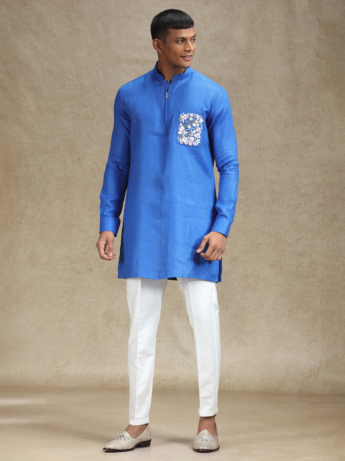 Bring refined style to your festivities with this Royal Blue kurta pajama set made from fine linen. Adorned with sophisticated embroidery, it features a mandarin neckline, zippered front closure, long sleeves, and a convenient chest pocket. The ensemble is paired with matching bottoms for a sleek, polished finish.