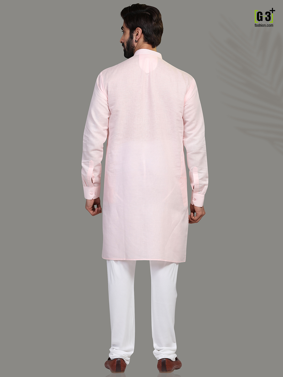 Plain pink cotton festive wear kurta suit with stand collar, short hook button placket, full sleeves, and vented hemline. Comes with a bottom.