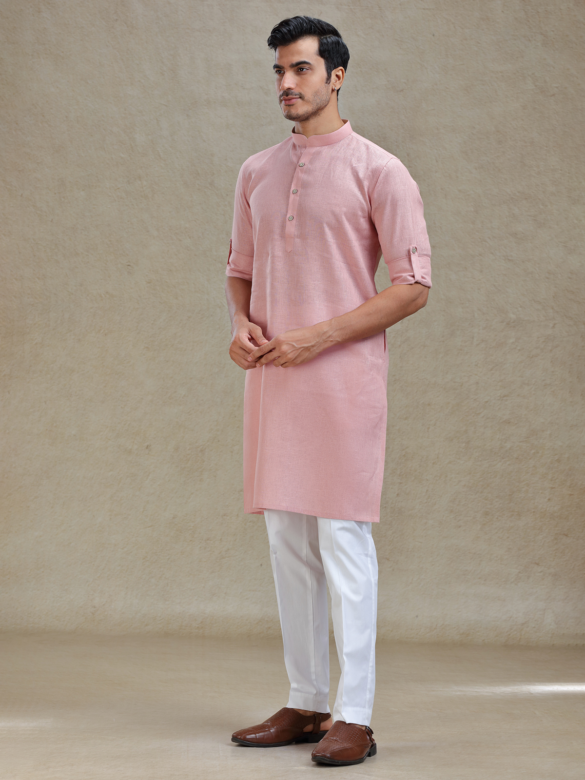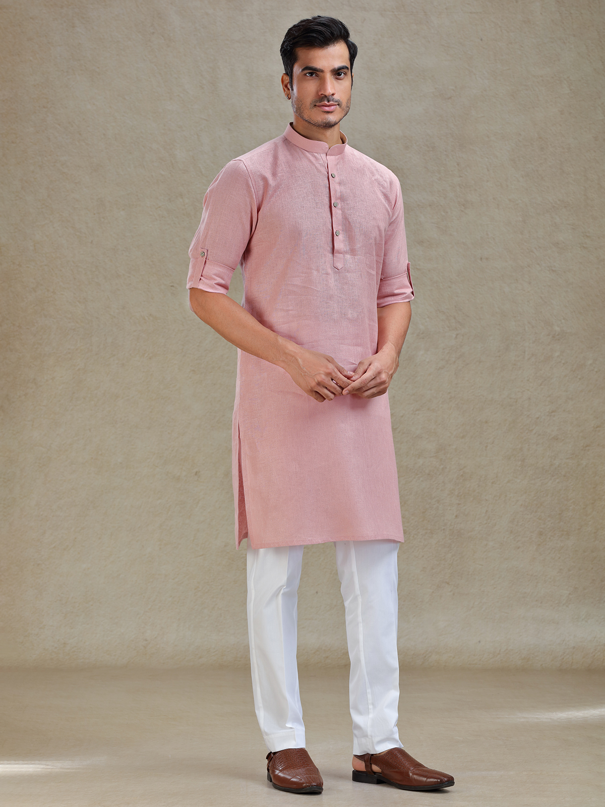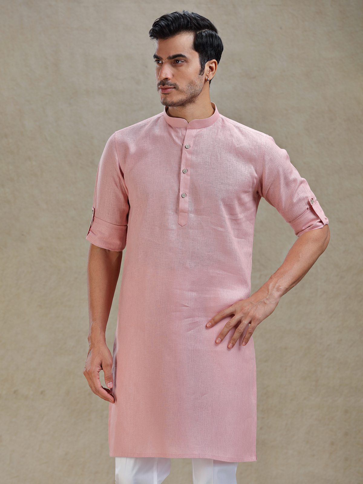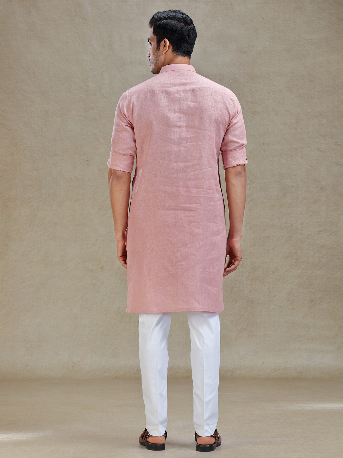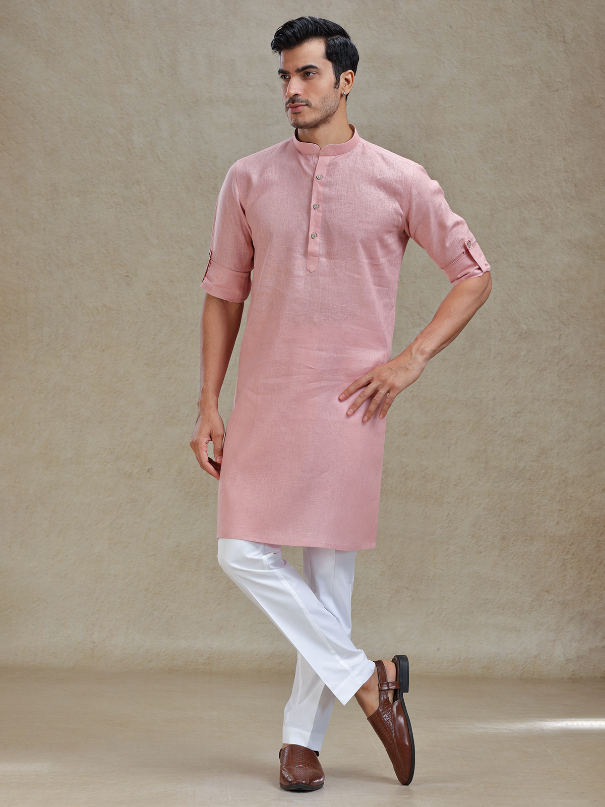 Embrace the festive season in our resplendent flamingo pink kurta suit for men. crafted on a luxurious linen base, this comfortable set is ideal for festive occasions, weddings, and family gatherings. paired with pants for ease of movement, the set includes the kurta and bottom.