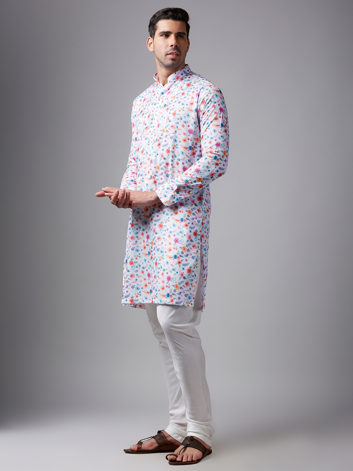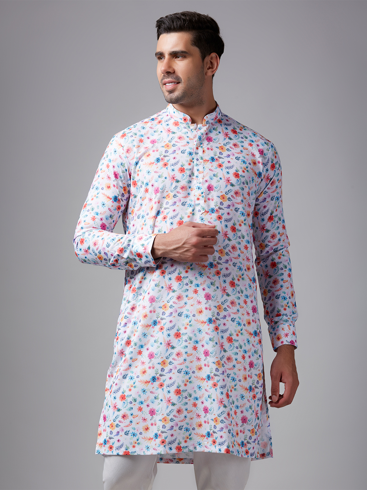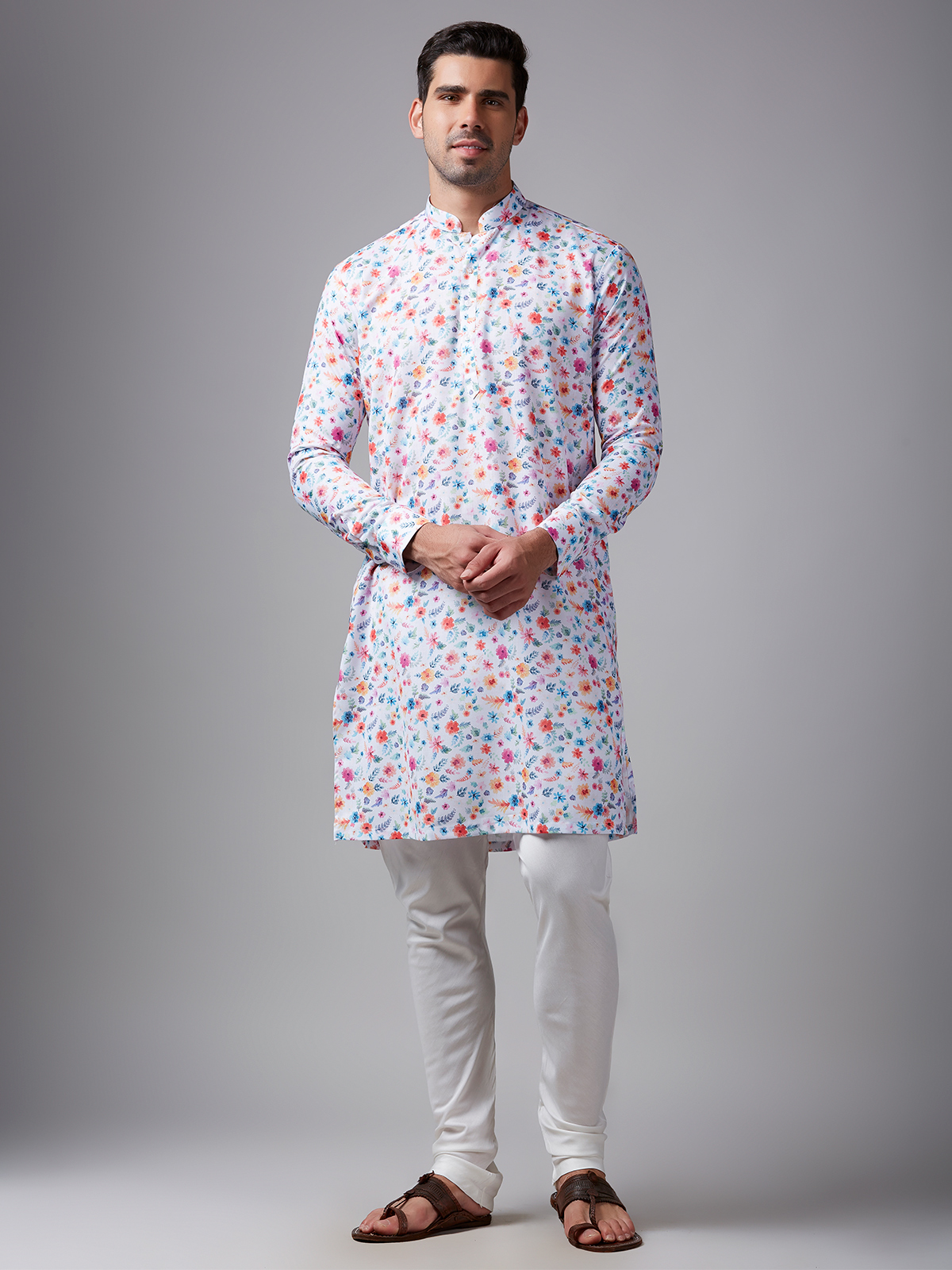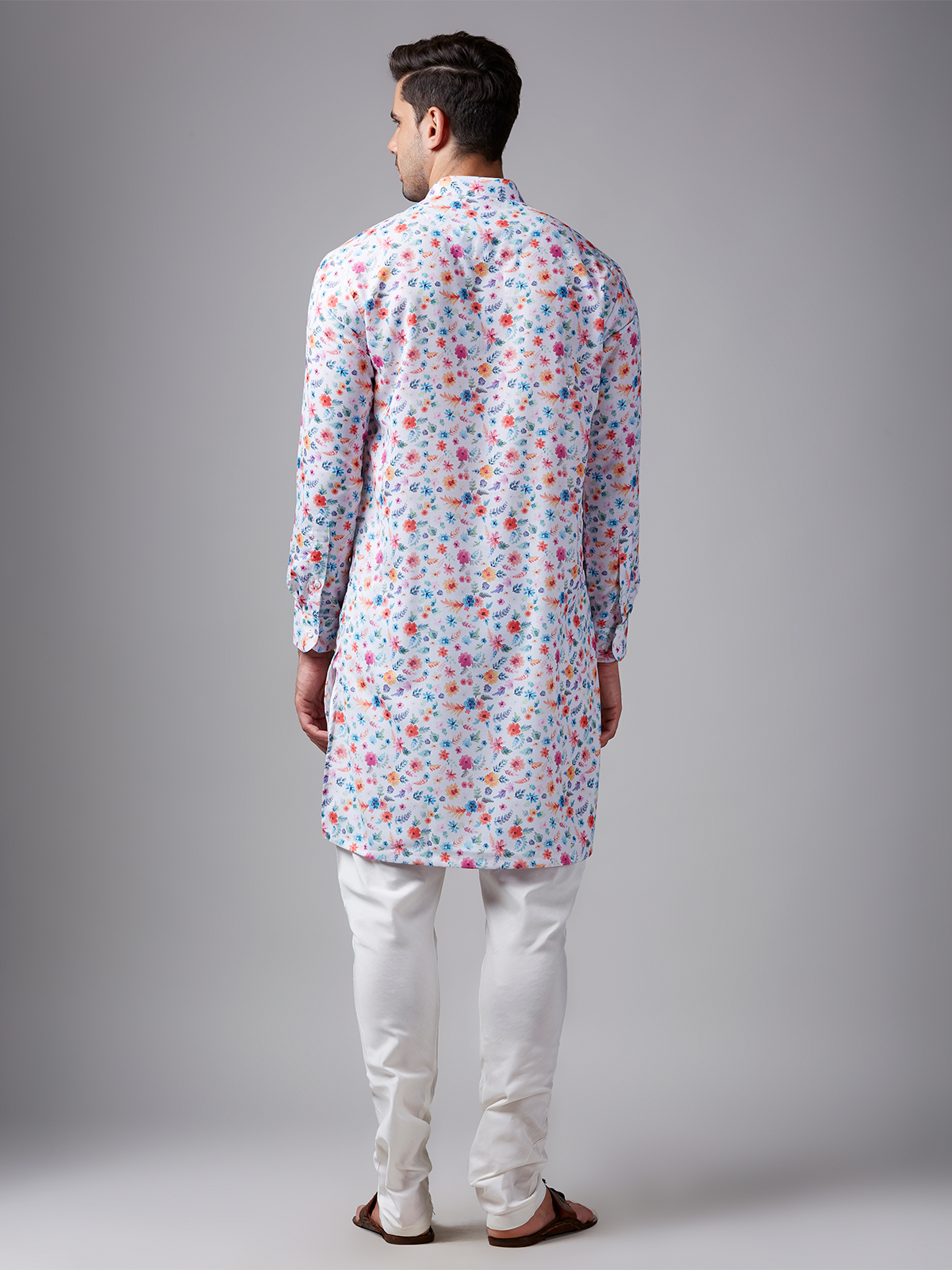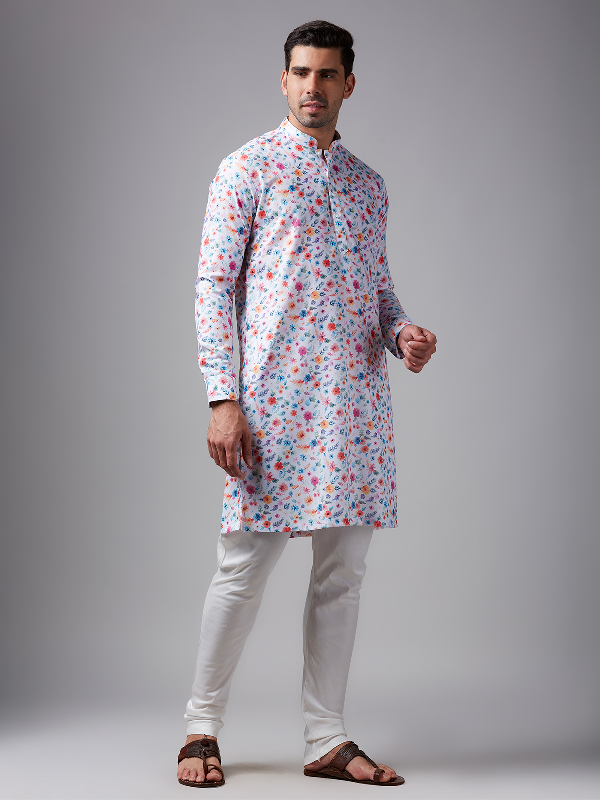 Effortlessly chic, this white linen kurta suit is the perfect addition to your festive wardrobe. Enhanced with a floral print, it features a mandarin collar, full sleeves, and a coordinating bottom for a stylish ensemble.
