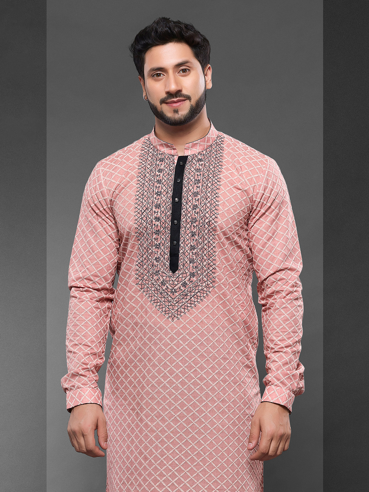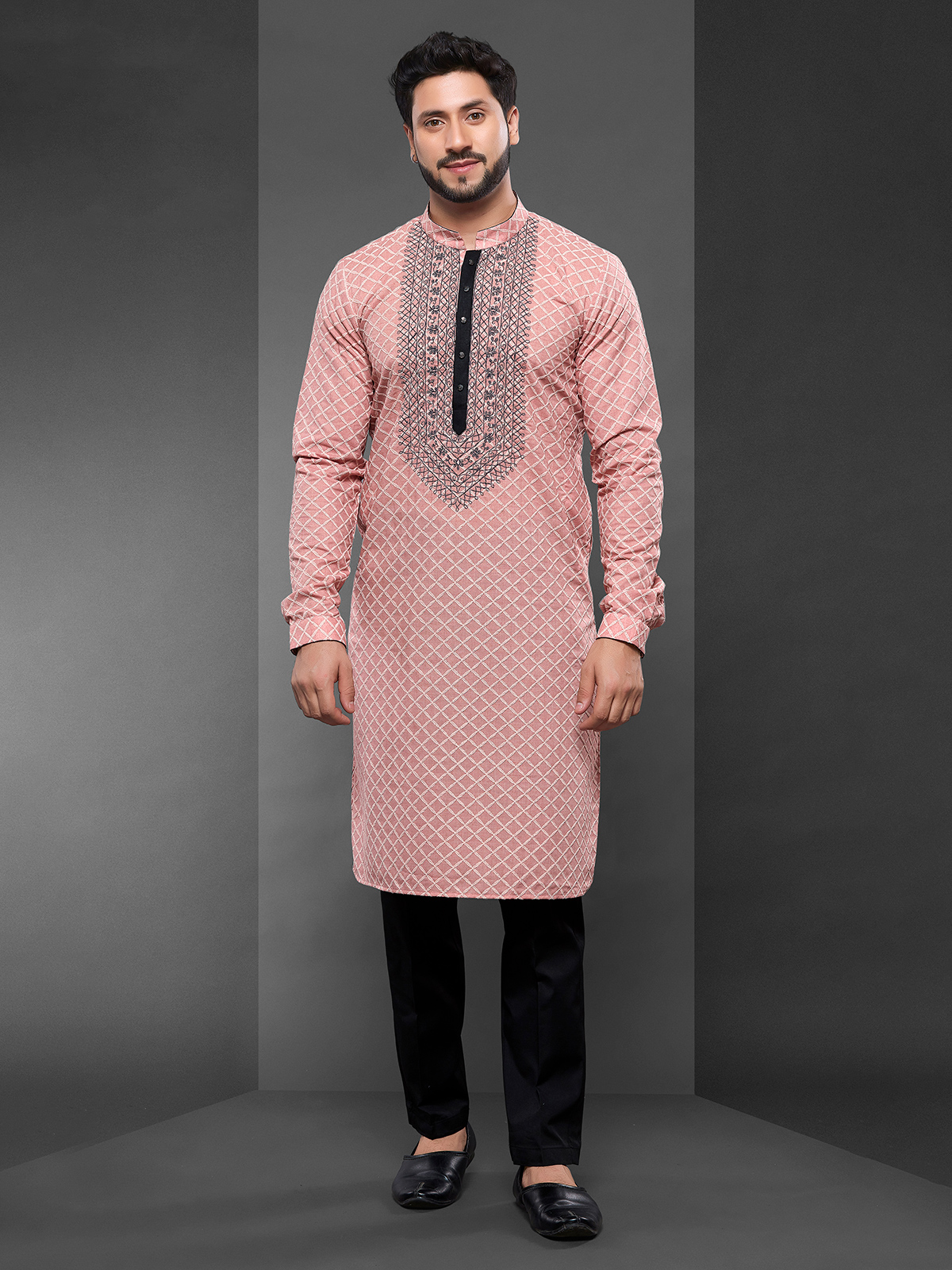Our peach silk kurta combines luxury with style, featuring stunning embroidery throughout the cotton fabric. The full sleeves and mandarin collar add a touch of elegance, making it perfect for celebrations. Comes with a matching bottom for a seamless look.